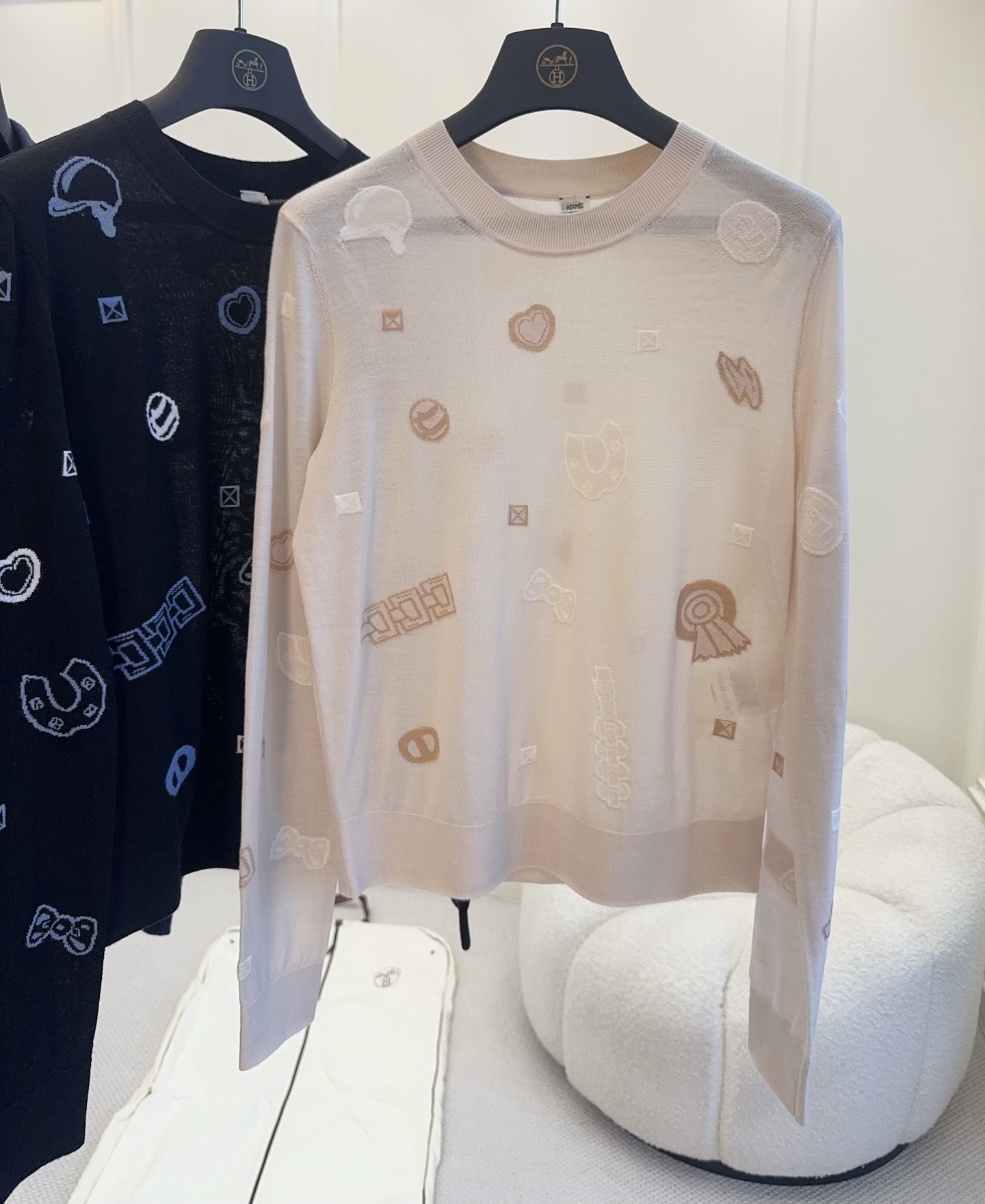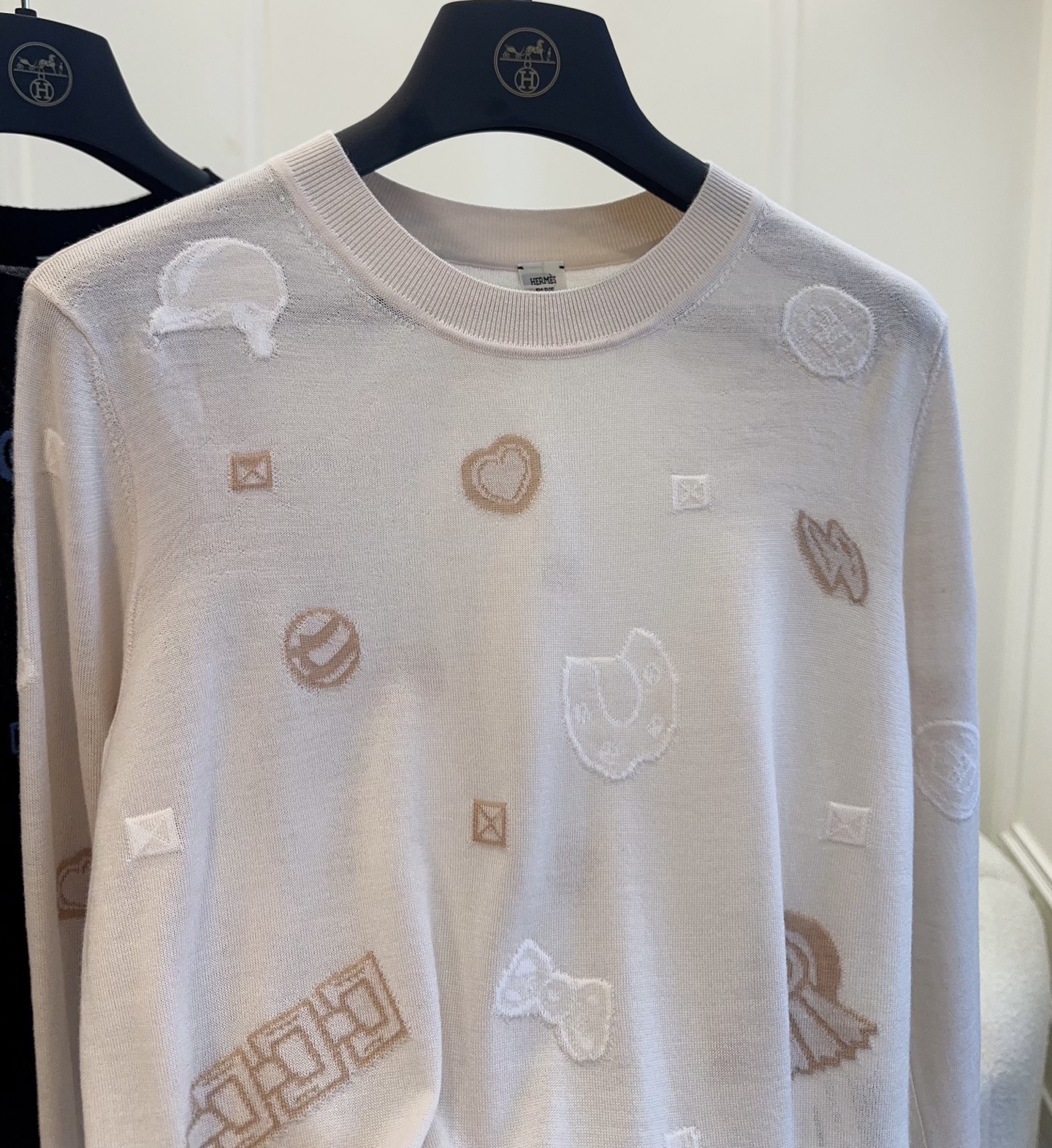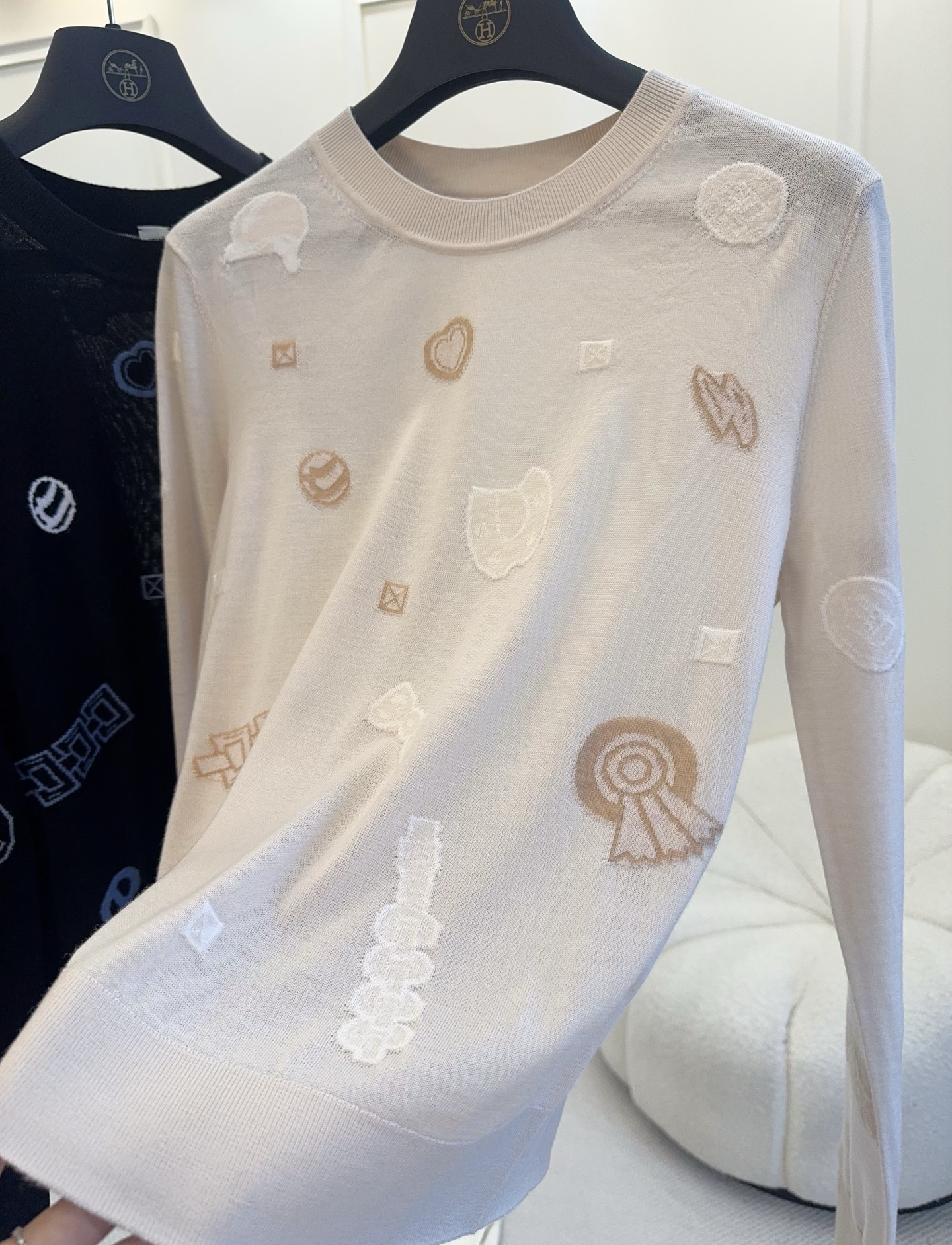 Hermes 2025 early autumn new jacquard knit sweater, 100% ultra-fine first-cut wool, fine knitting, soft and smooth texture, full of small patterns like pig nose and others, double-sided jacquard embroidery, three-dimensional jacquard, lightweight and not bulky, simple and elegant style, looks sophisticated and classy when worn!