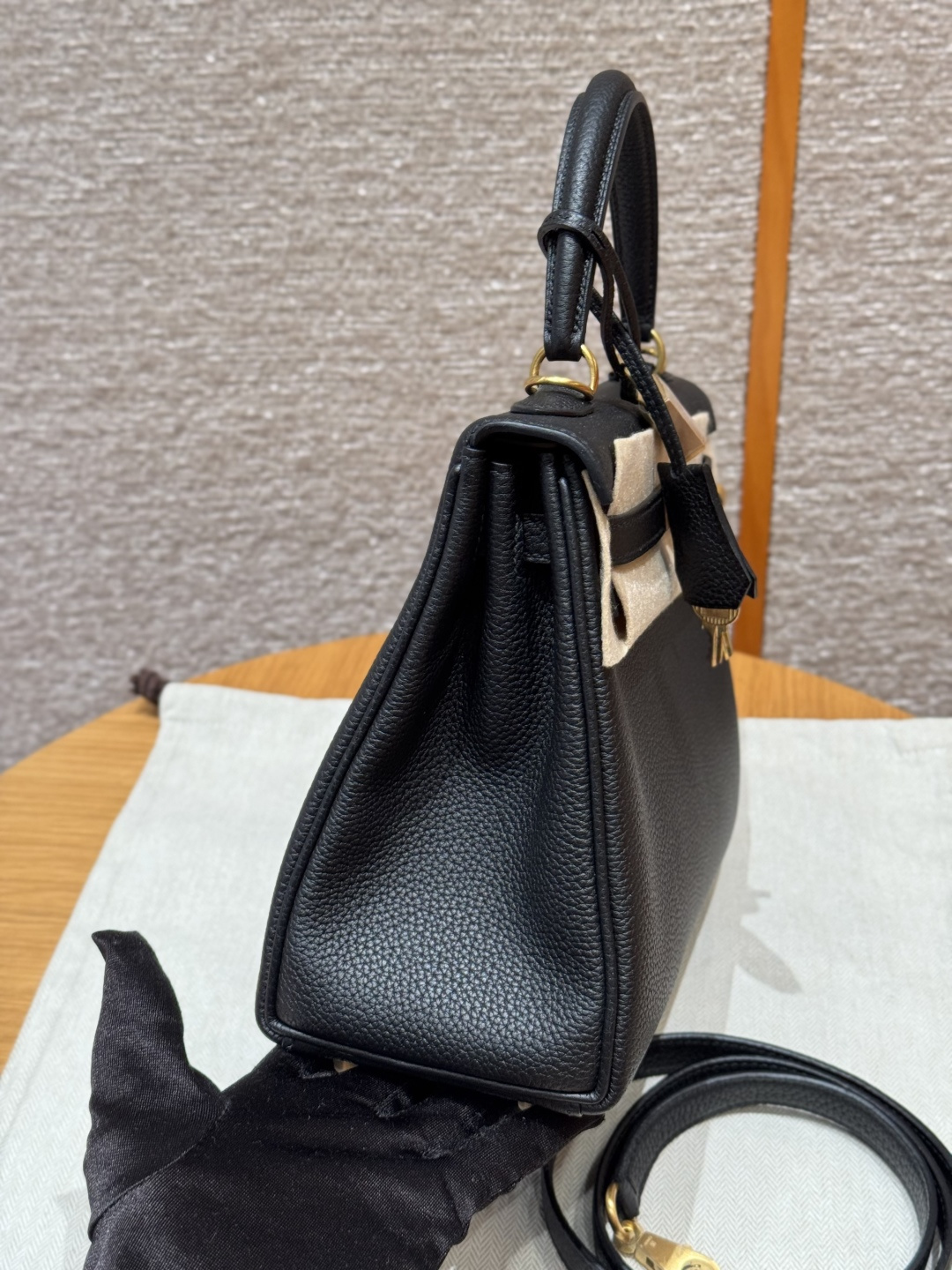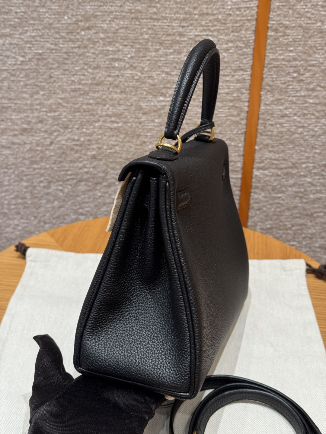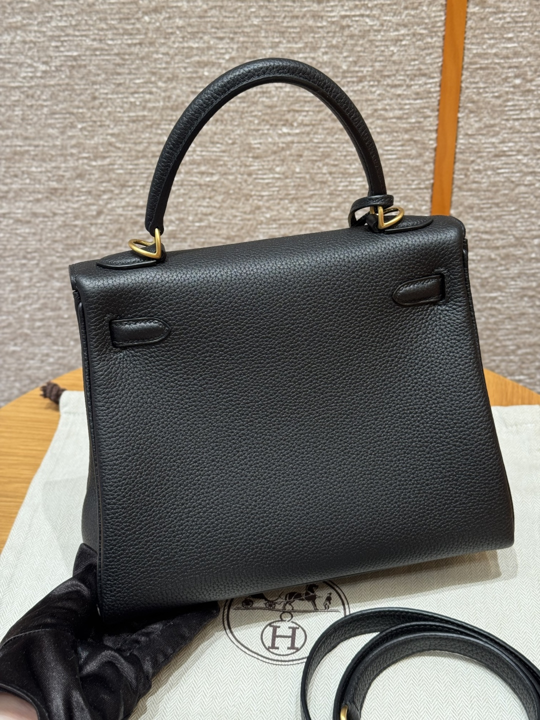 Kelly 25, black, French imported cowhide, brushed gold clasp, high-end fully handcrafted exclusive custom.