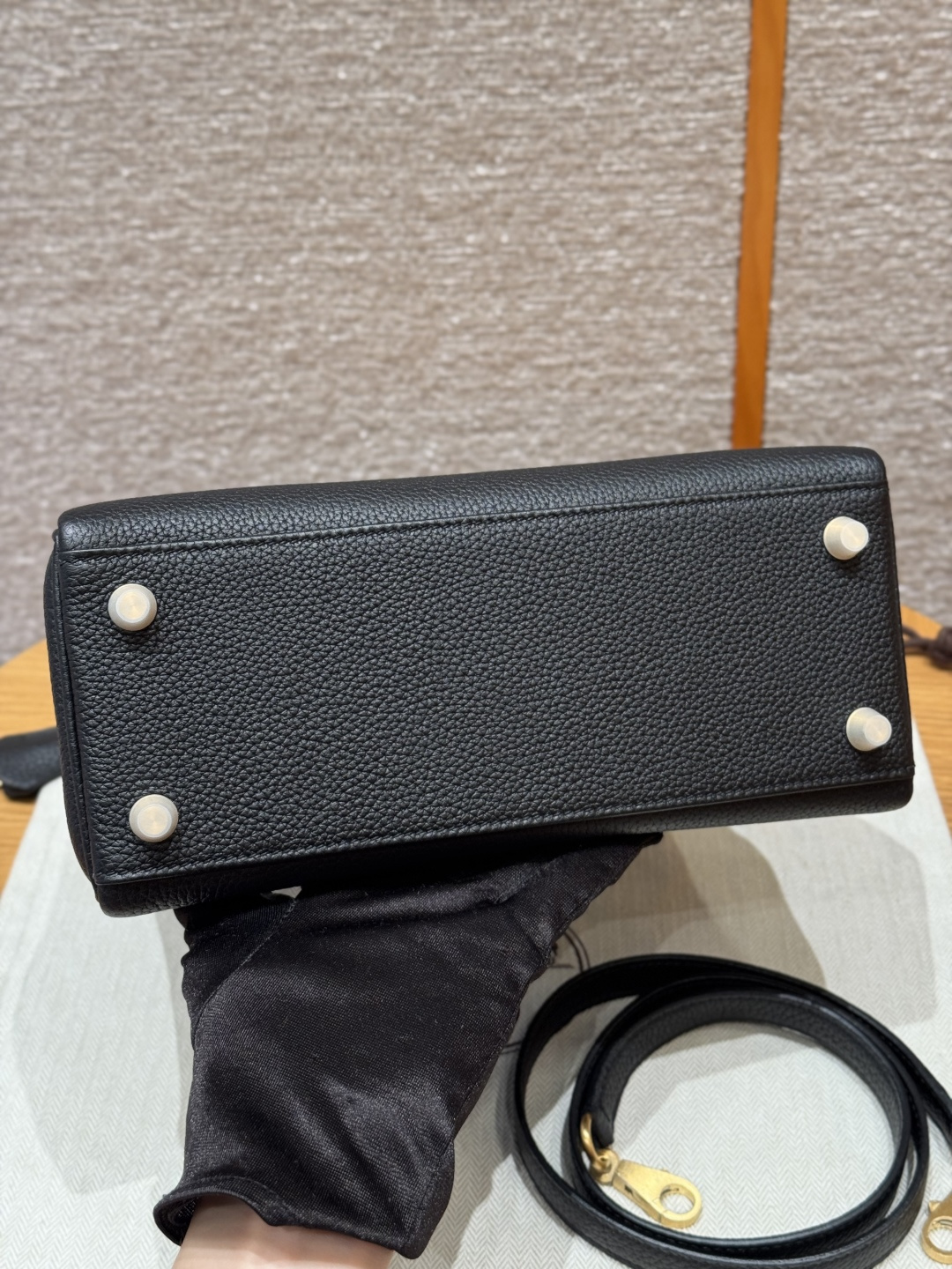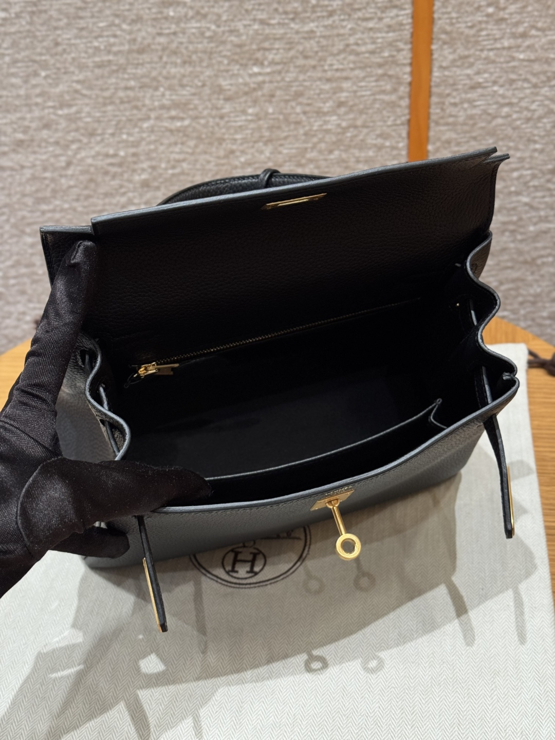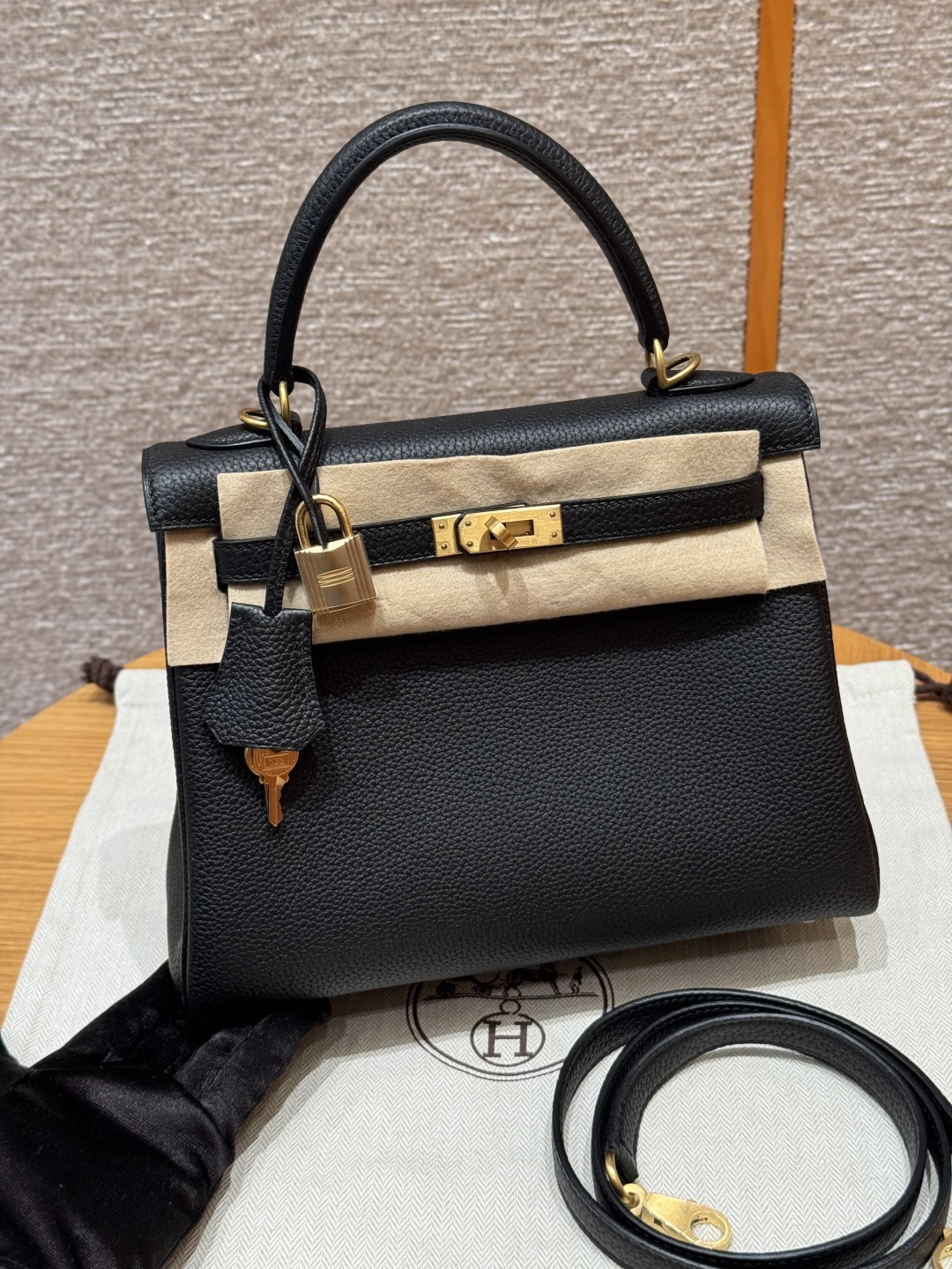 Kelly 25, black, French imported cowhide, brushed gold clasp, high-end fully handcrafted exclusive custom.