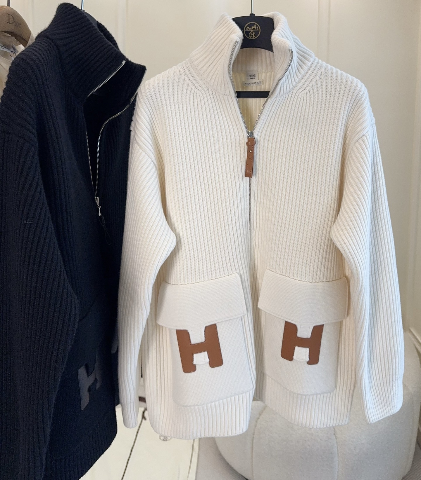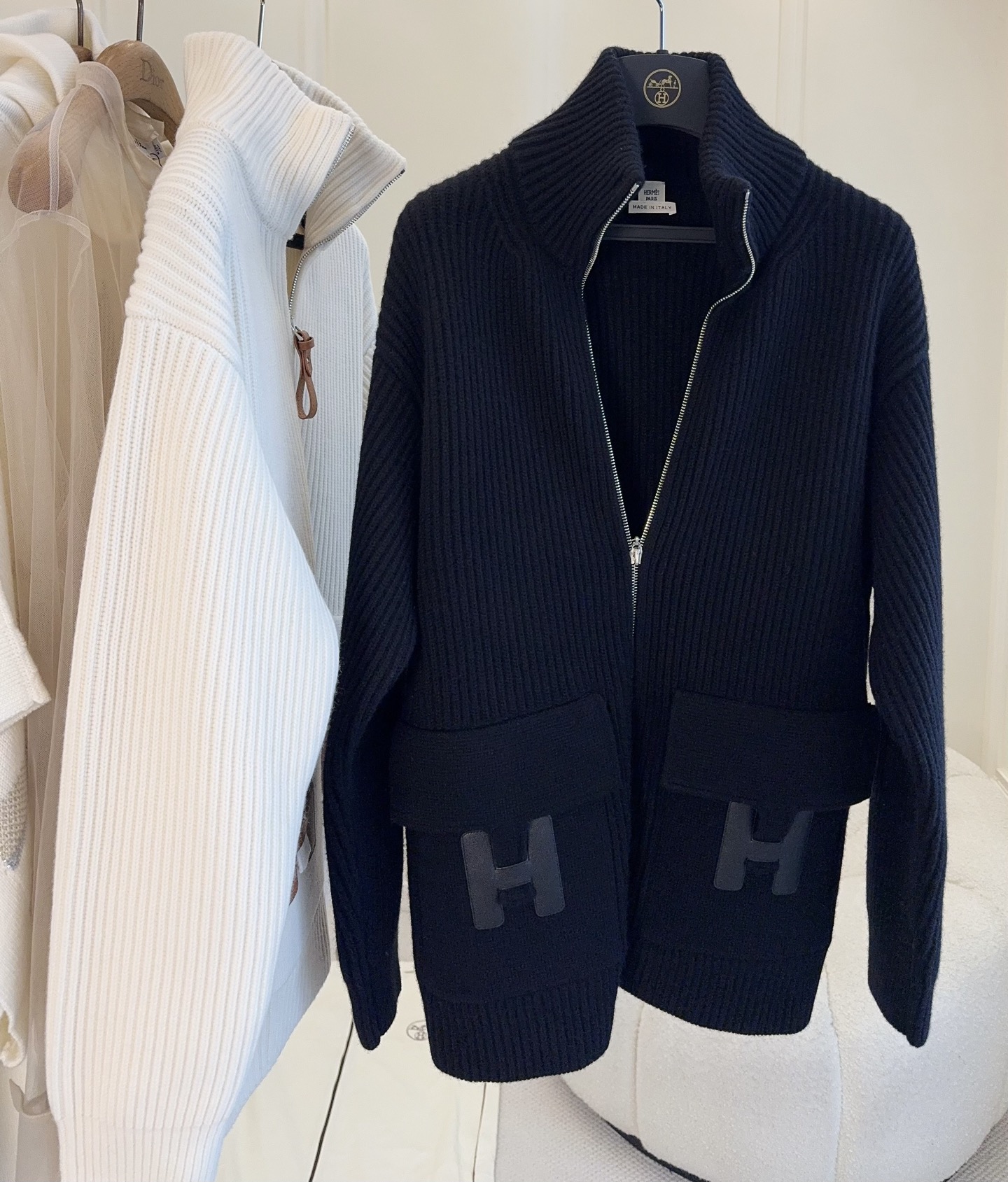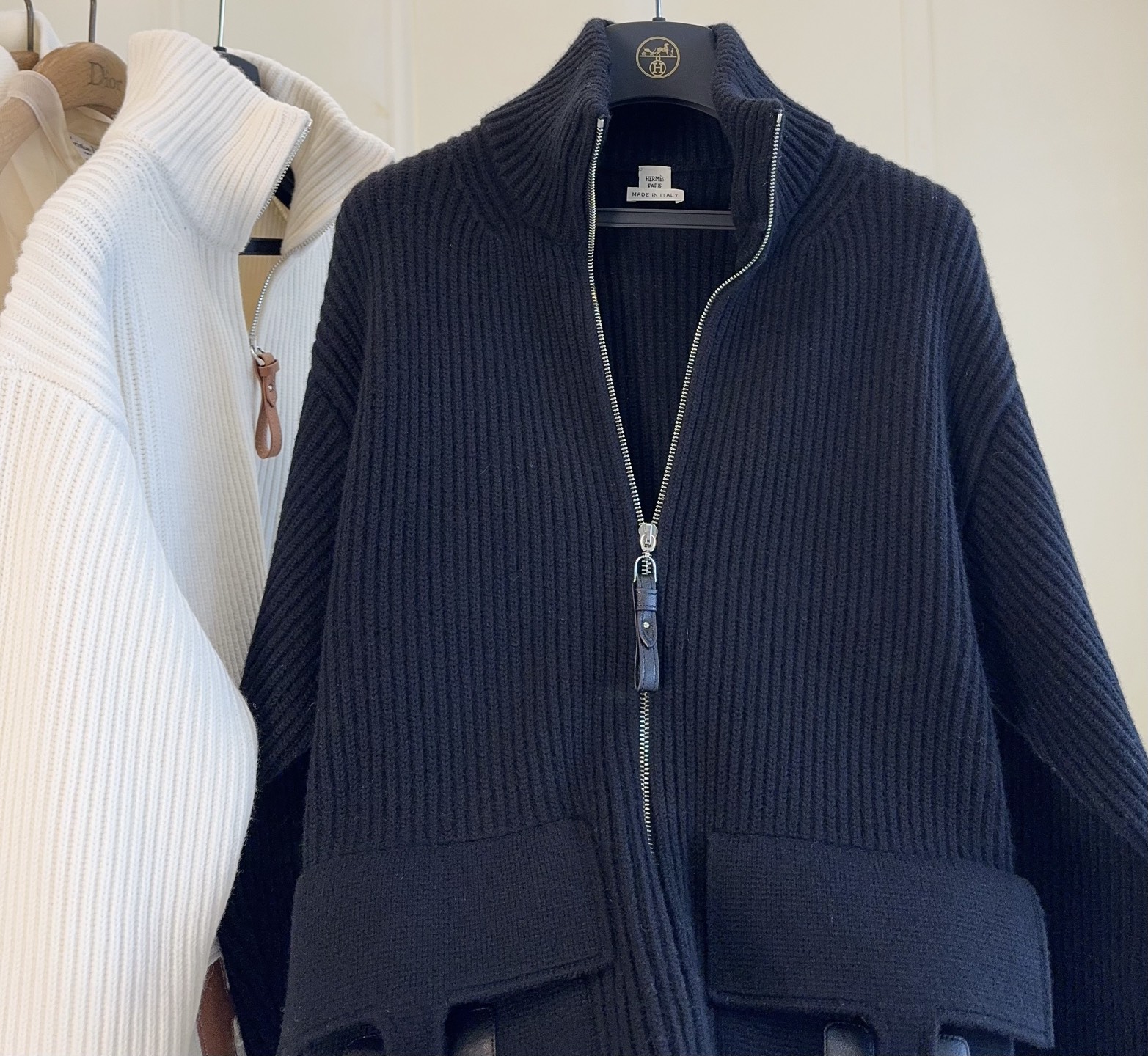 New Hermes leather-trimmed cardigan jacket, popular style now available in black. Made from imported Italian 60-ply ultra-fine wool blend, crafted with Japanese Shima machine authentic 7-gauge knitting technique. Delicate, soft, and plush to the touch, thick and warm—an exceptionally heavy piece. Features large pockets with leather trim design, distinctive and eye-catching. Slightly relaxed fit, sophisticated color scheme, versatile and elegant.