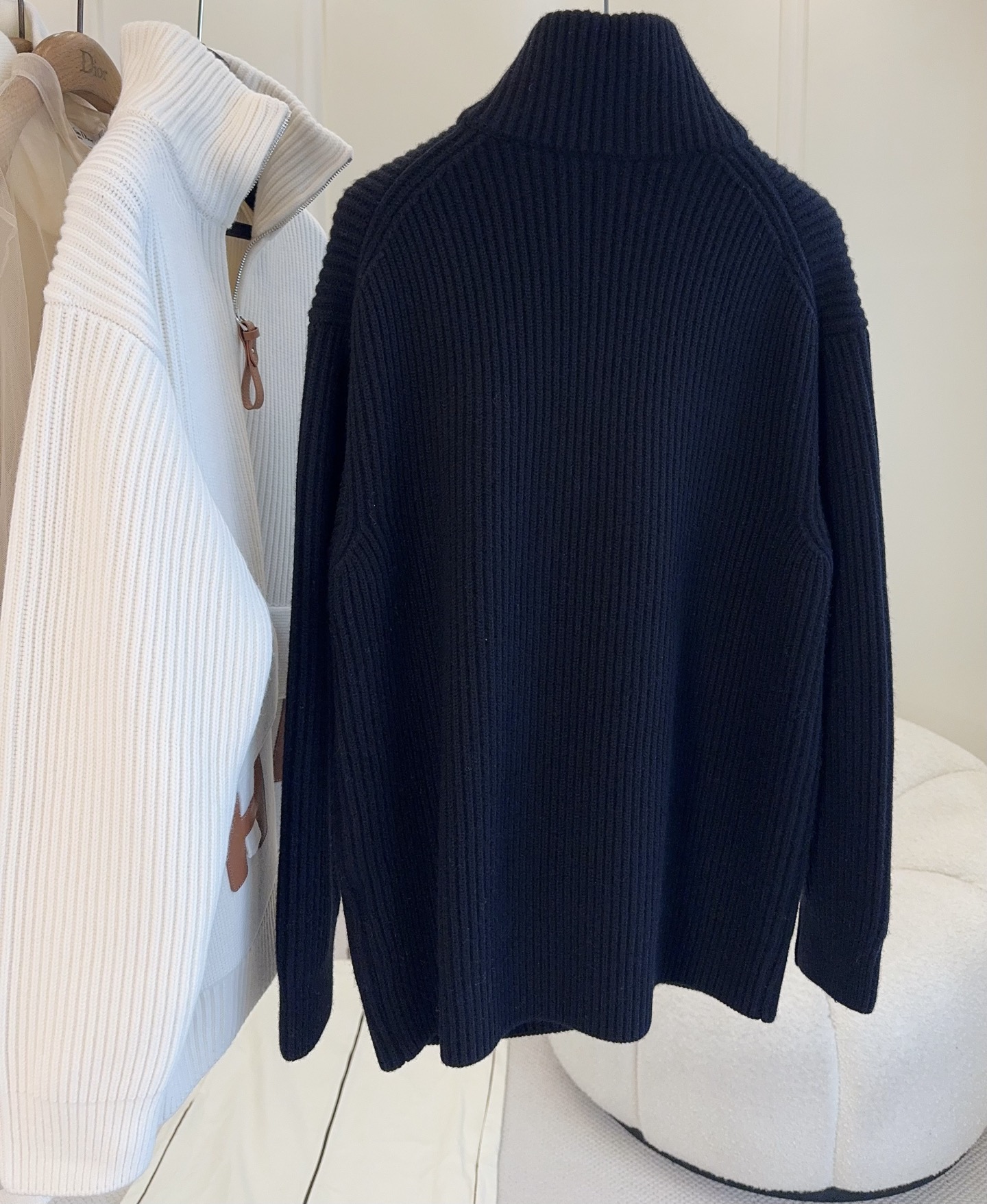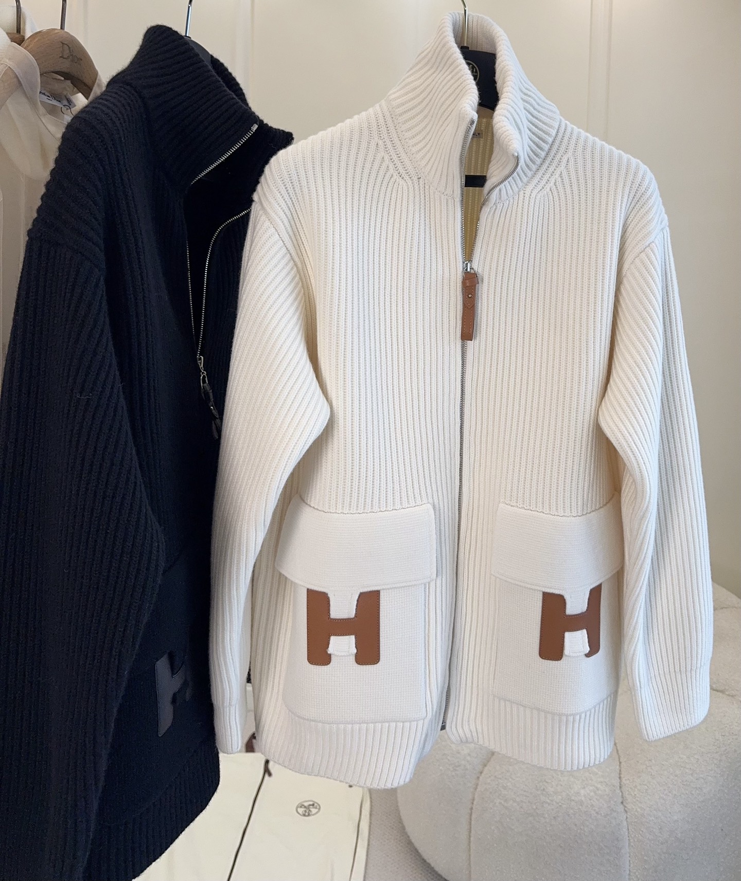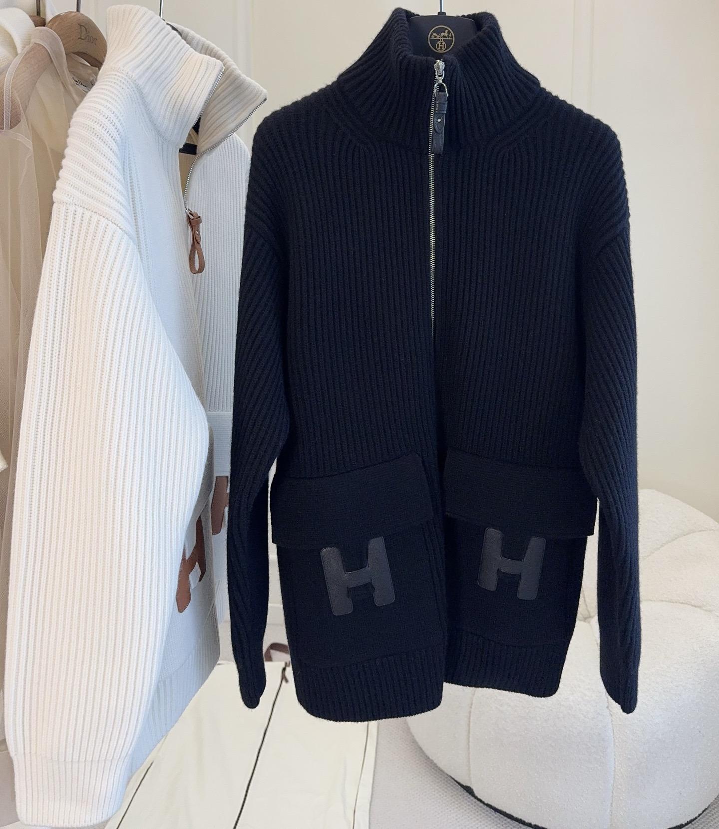 New Hermes leather-trimmed cardigan jacket, popular style now available in black. Made from imported Italian 60-ply ultra-fine wool blend, crafted with Japanese Shima machine authentic 7-gauge knitting technique. Delicate, soft, and plush to the touch, thick and warm—an exceptionally heavy piece. Features large pockets with leather trim design, distinctive and eye-catching. Slightly relaxed fit, sophisticated color scheme, versatile and elegant.