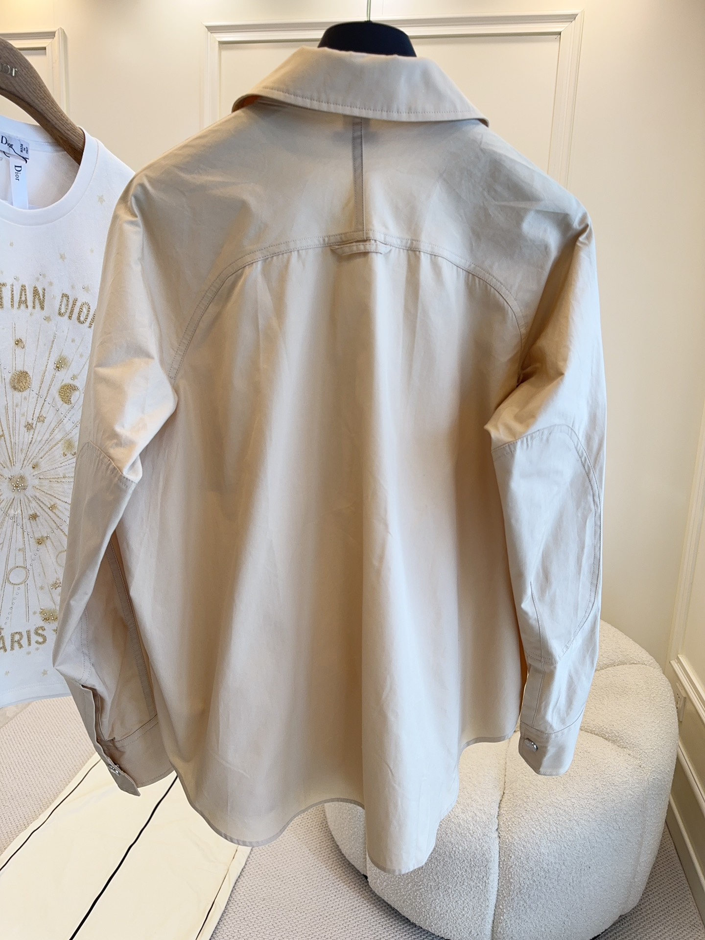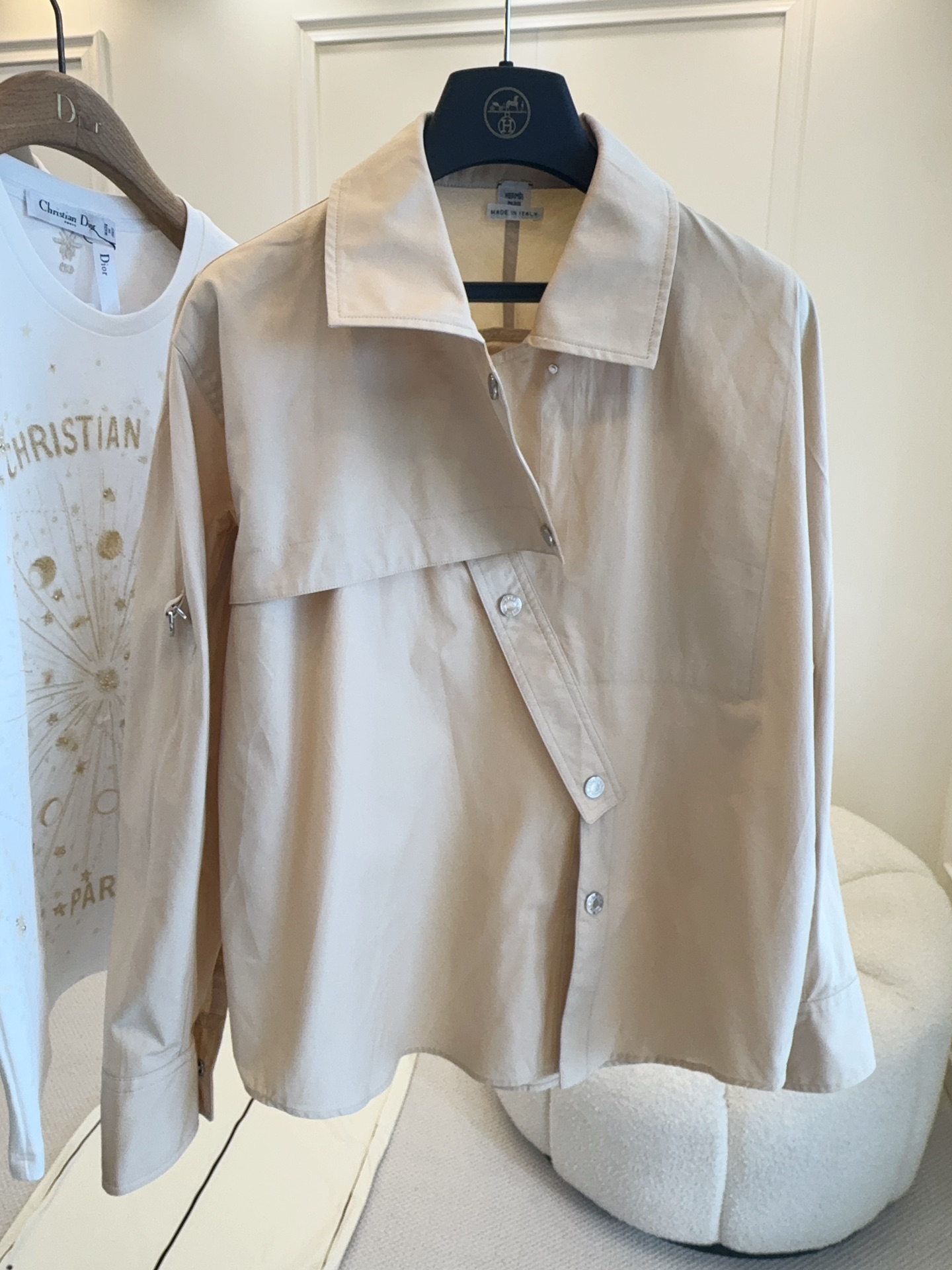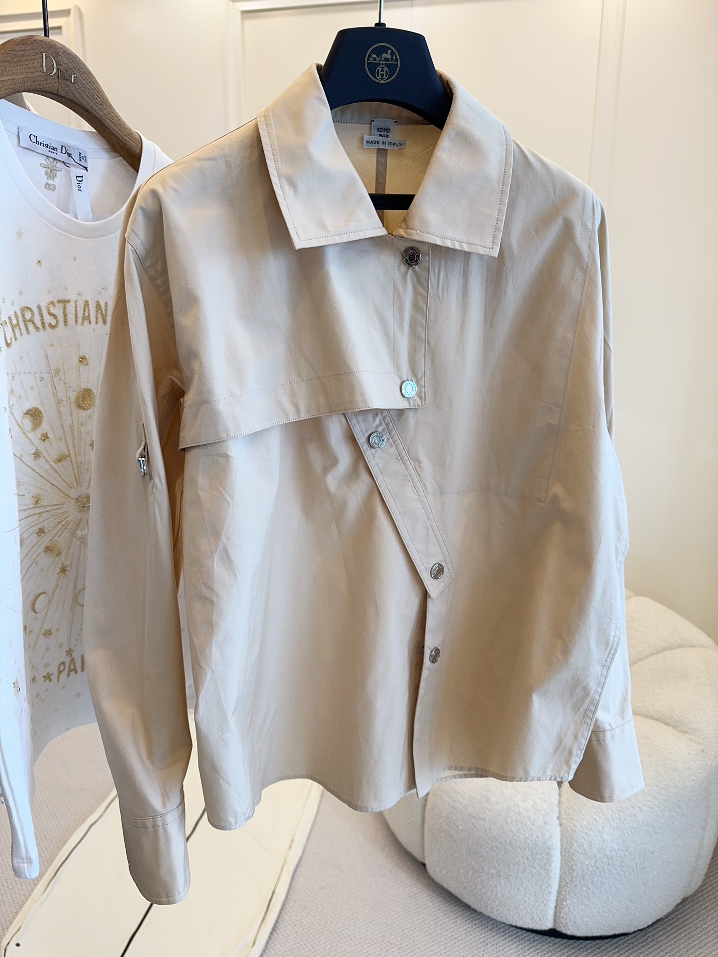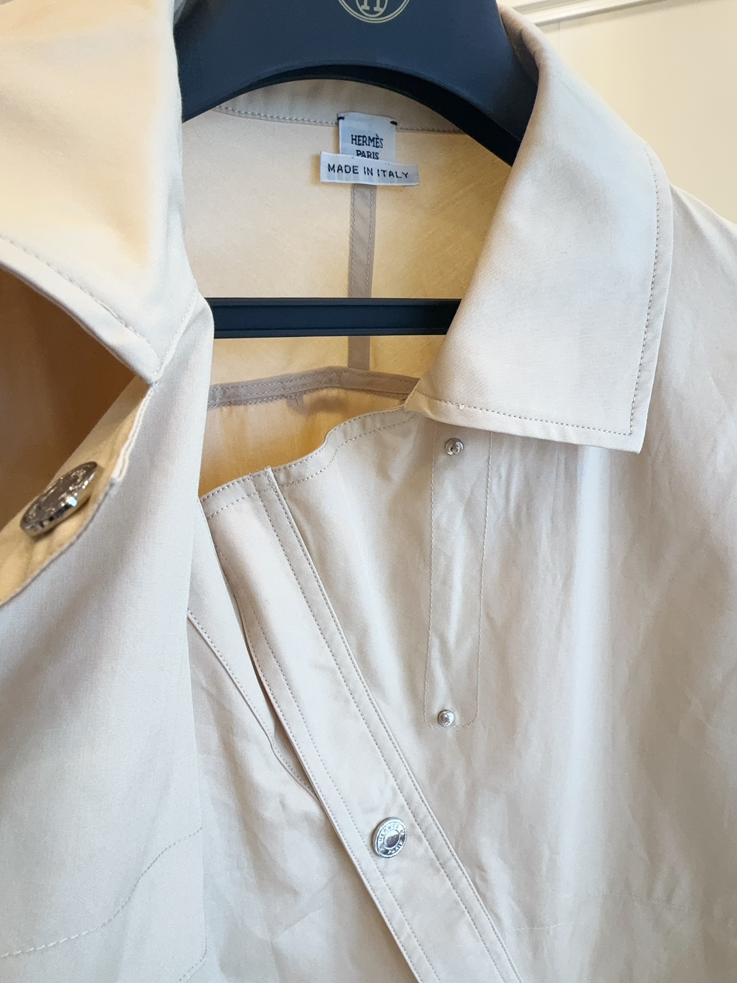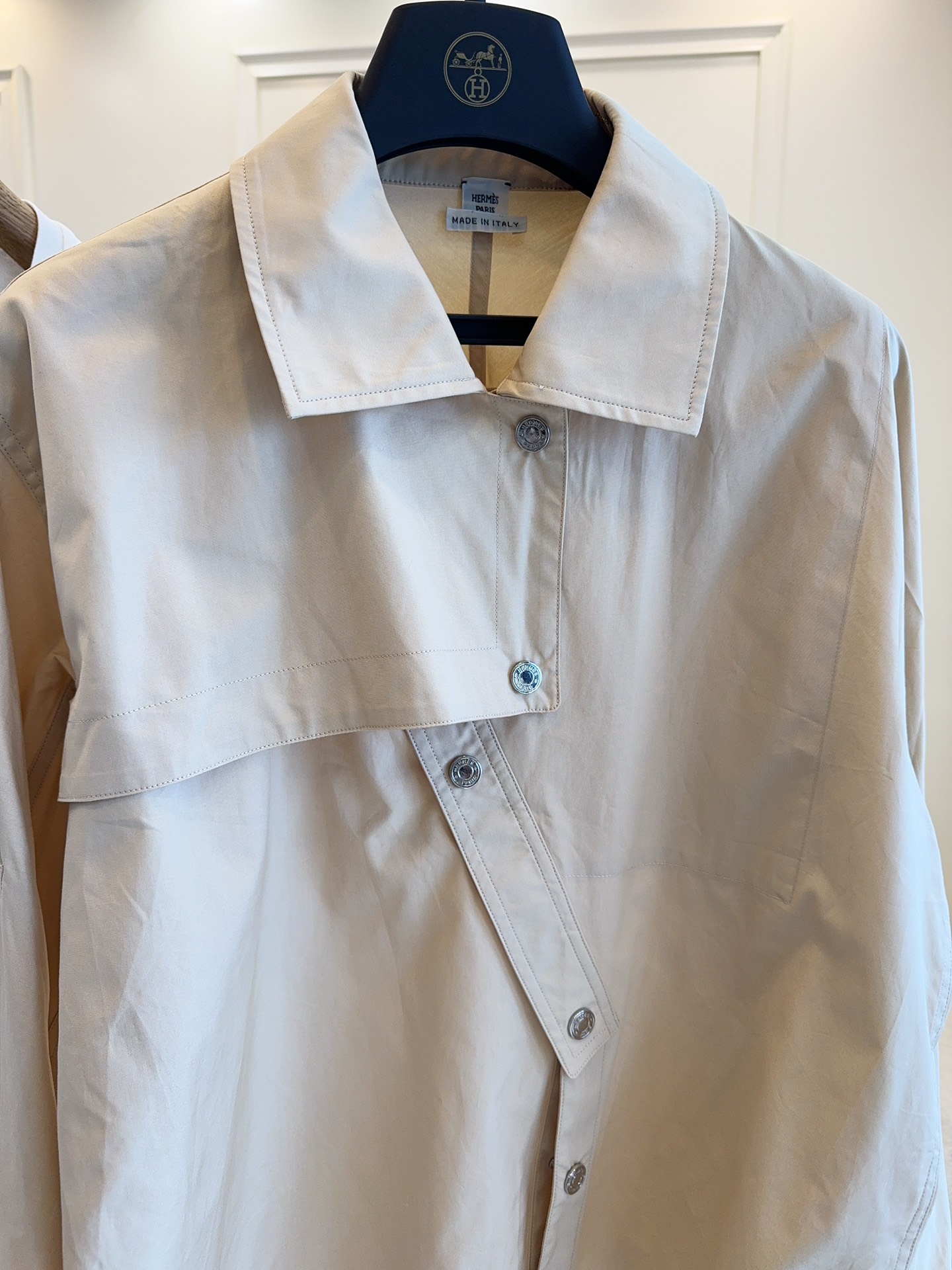 Hermes 2025 new runway shirt, custom pure cotton, stylish light khaki color, irregular design, very stylish, simple yet not plain, custom logo buttons, sleeves can be rolled up and fastened, very handsome!