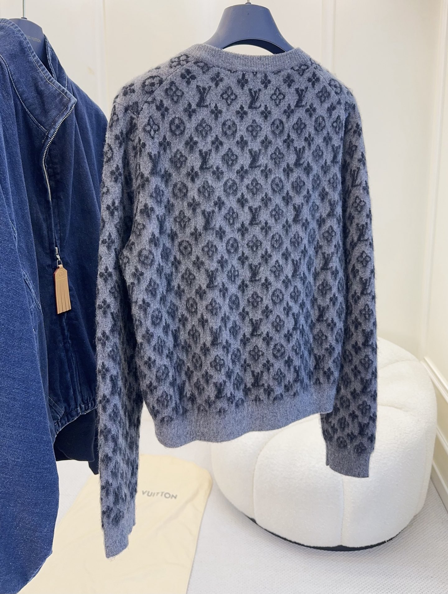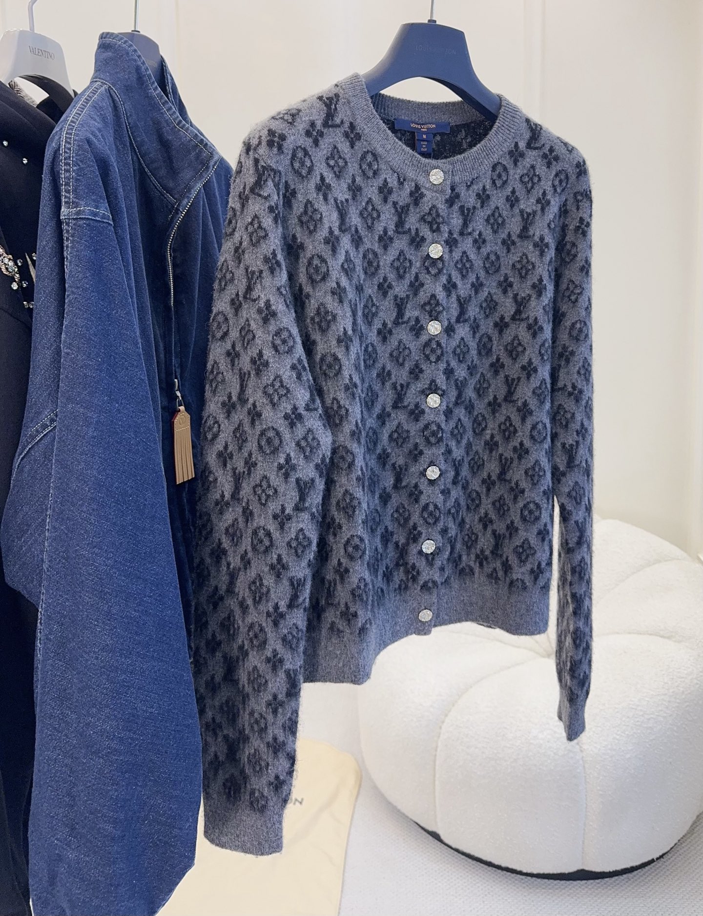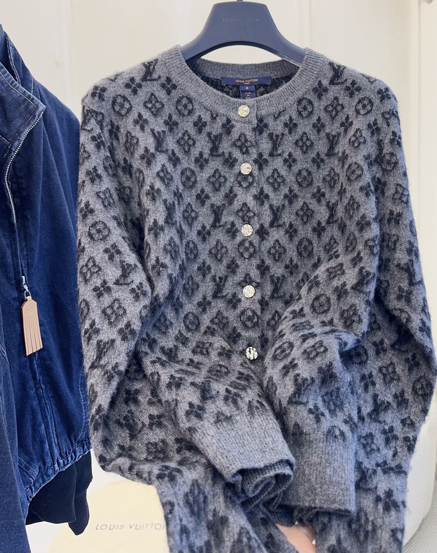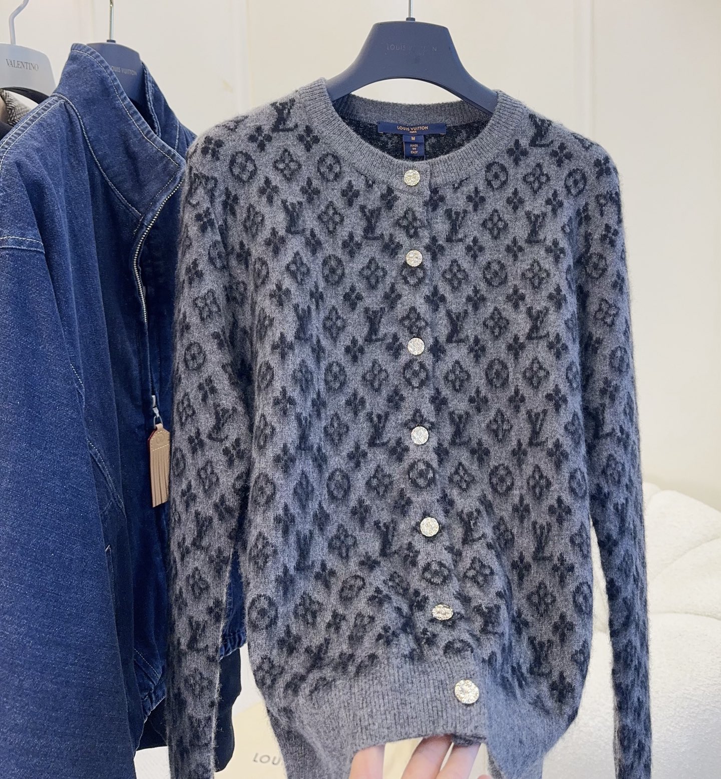 LV Monogram 2025 Autumn/Winter new knitted cardigan, classic monogram pattern + soft wool, alpaca, mohair materials, delicate and warm, metal buttons, fluffy 3D jacquard, full of exquisite sense, dark gray low-key and versatile, paired with a collared inner layer or jeans for an elegant and casual look, super suitable for autumn and winter seasons, practical with high brand recognition, a must-have for fashion enthusiasts!