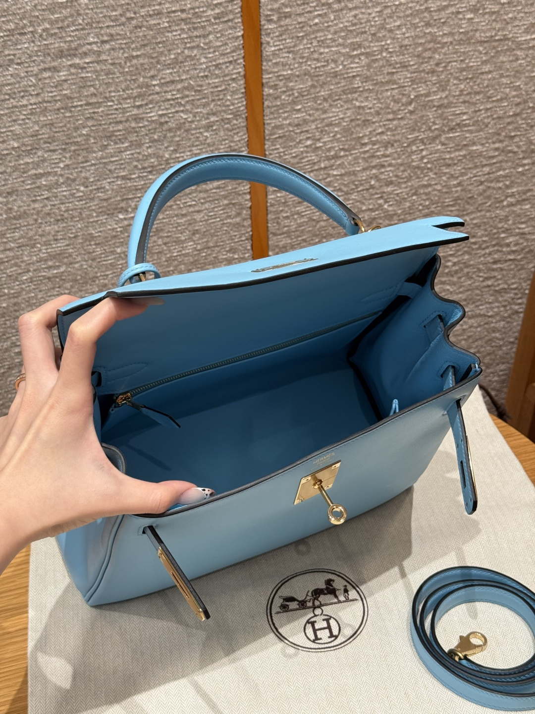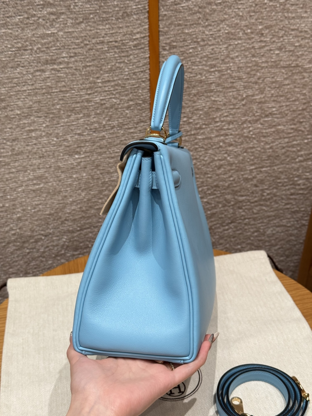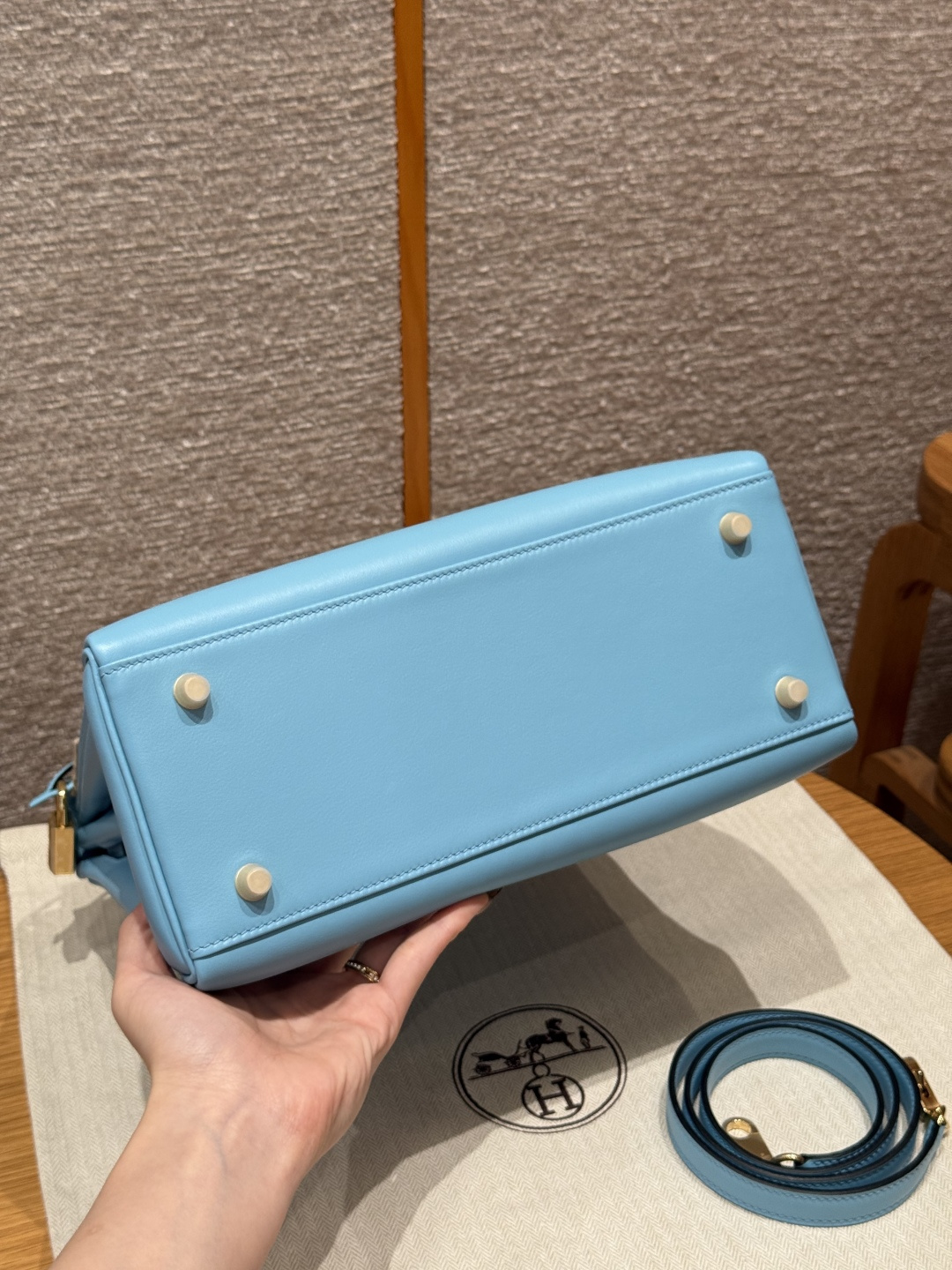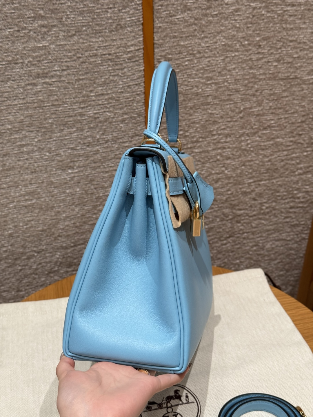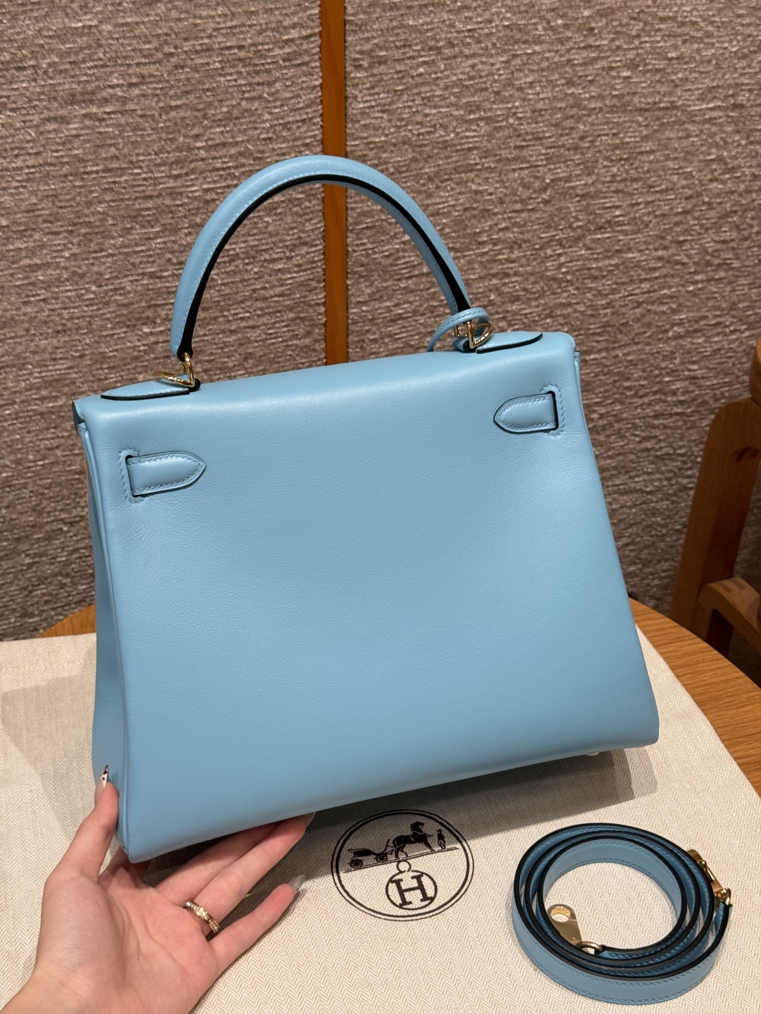 Kelly 28, Candy Blue, French imported smooth calfskin, gold clasp, high-end fully handcrafted exclusive customization.