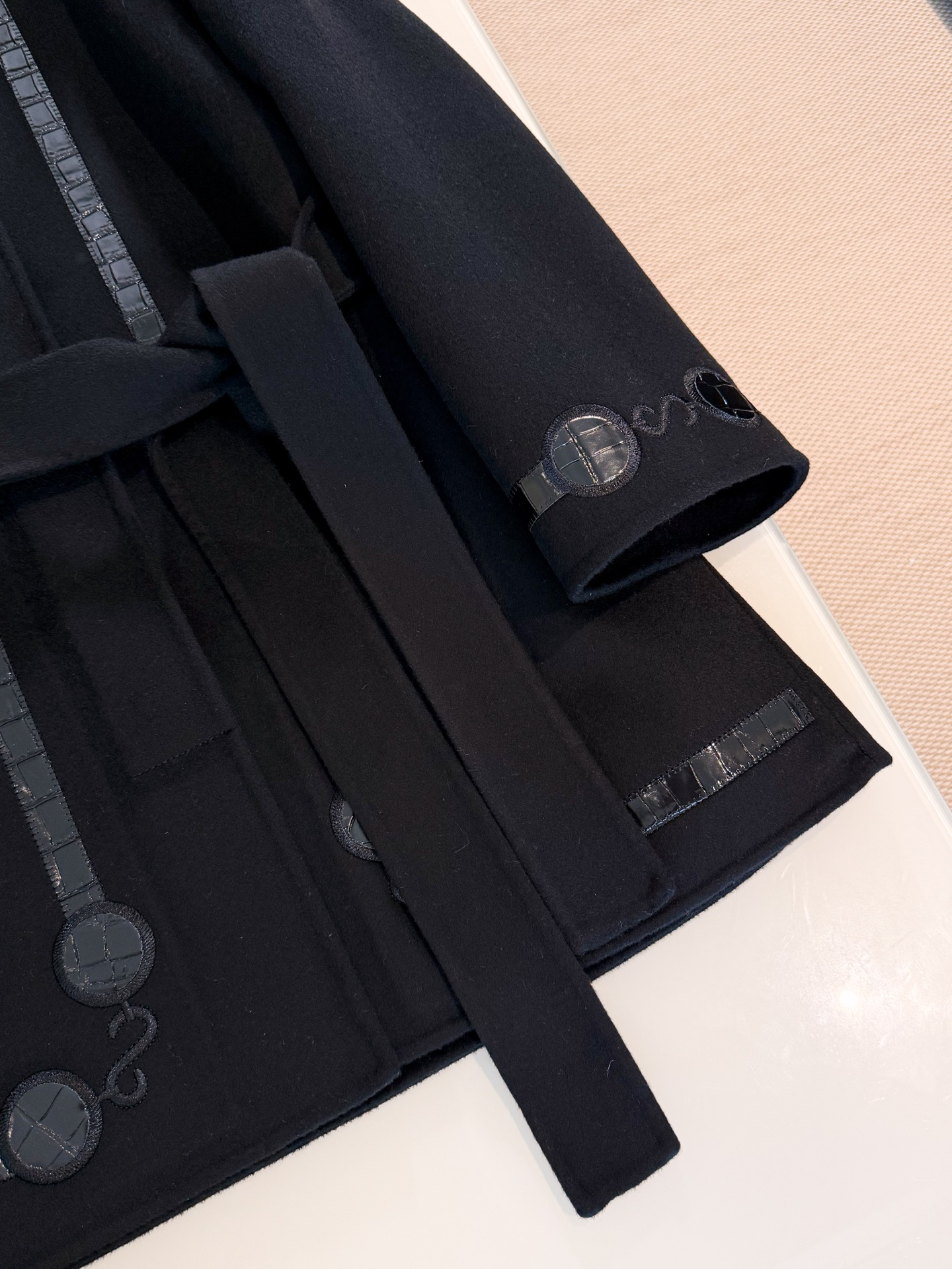 25S Black Crocodile Pattern Embroidered Belt Cashmere Coat
