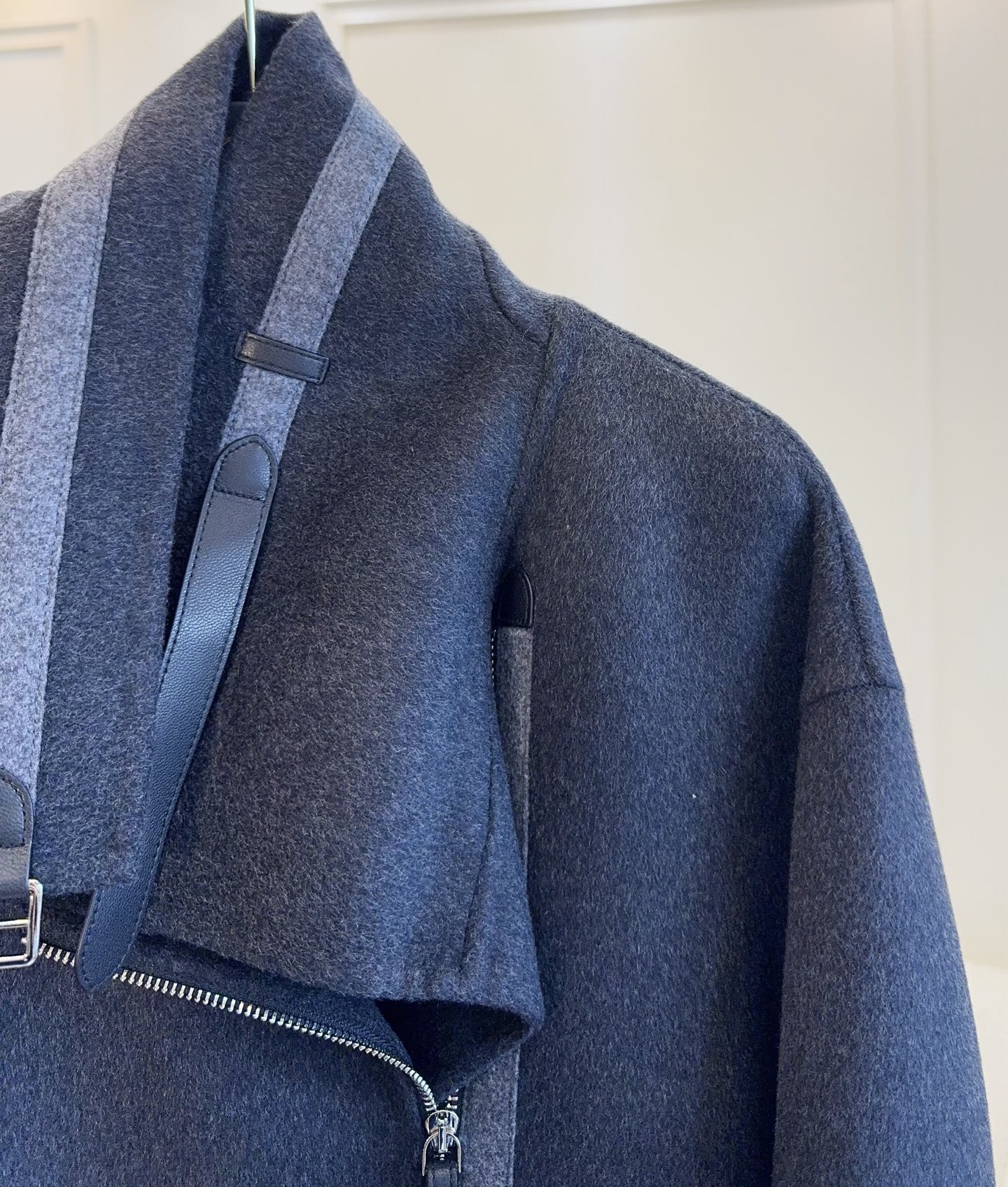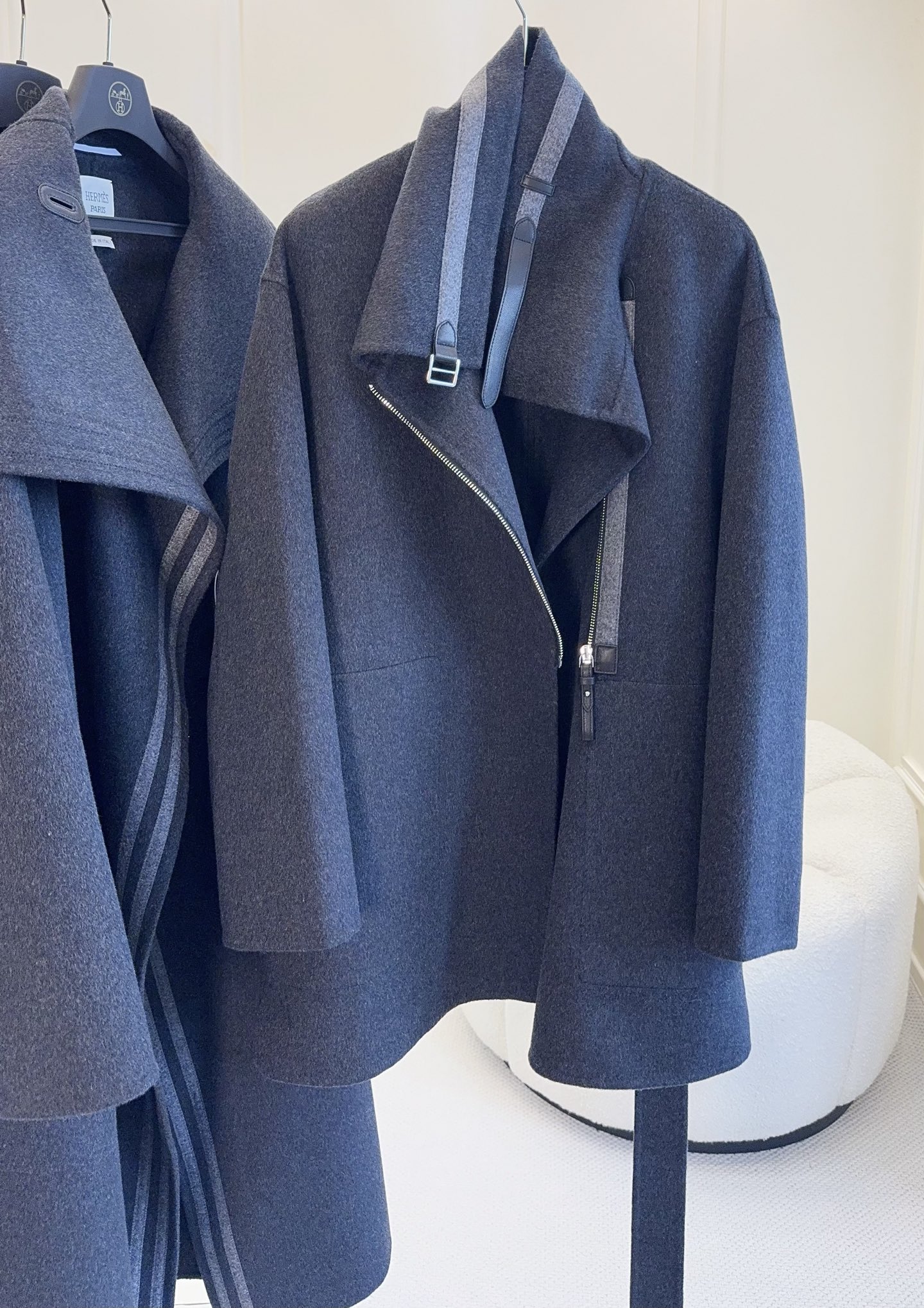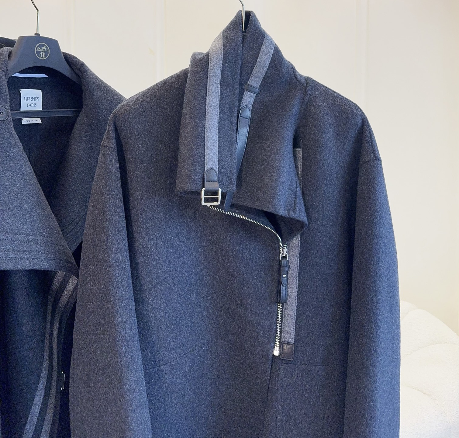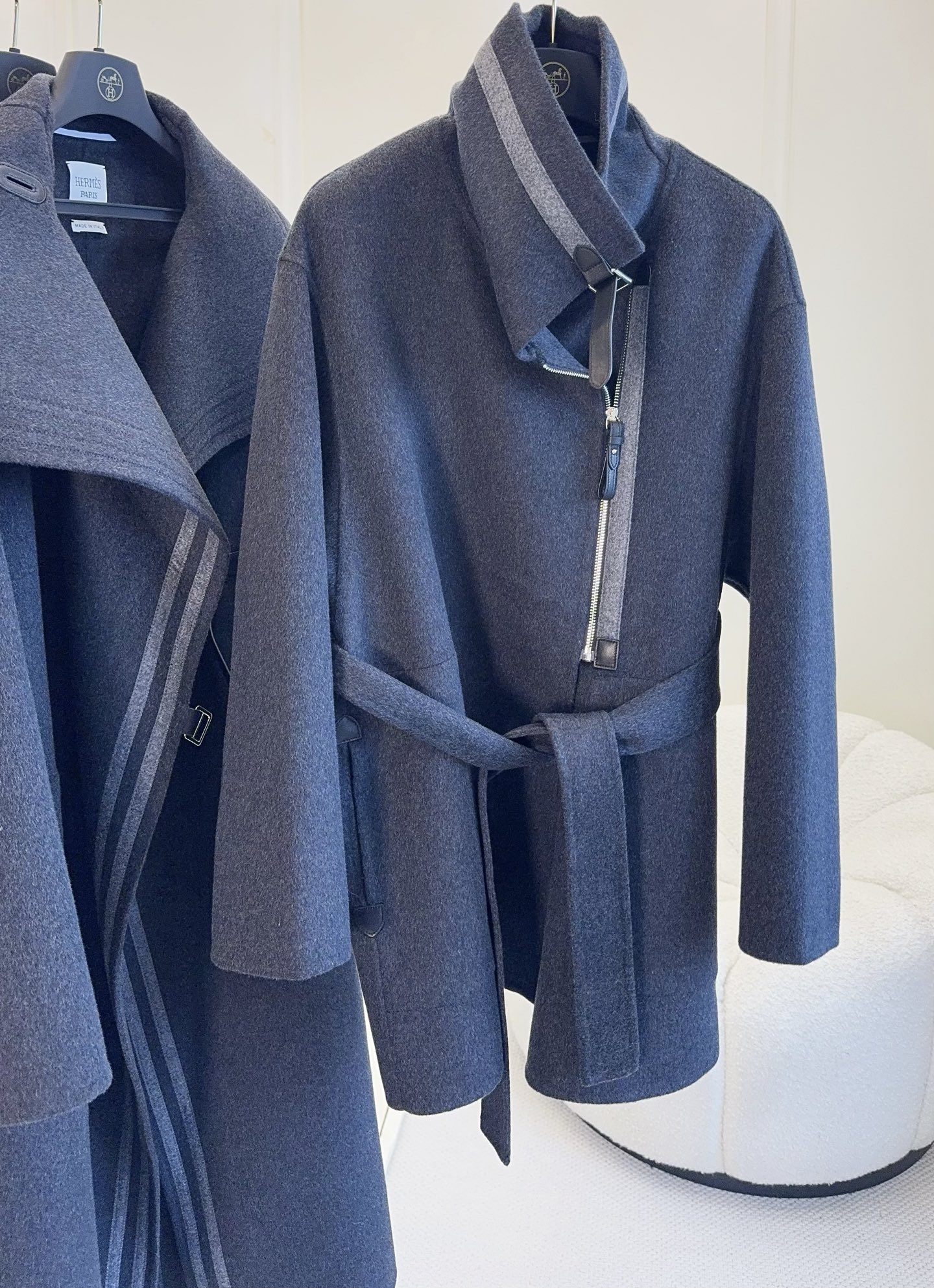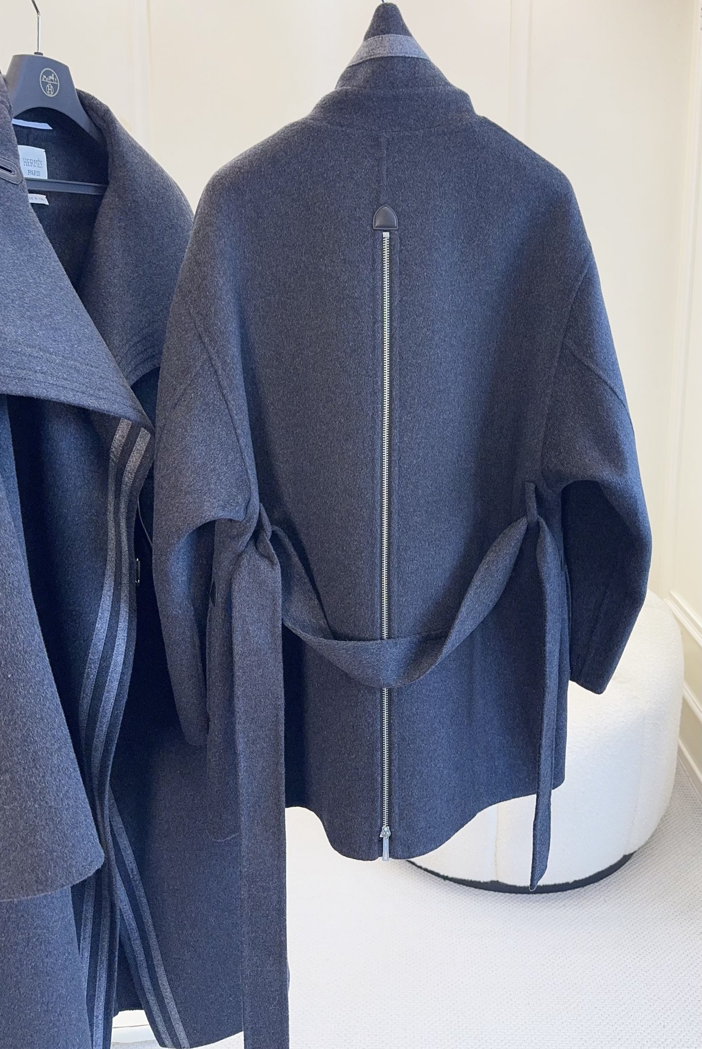 🆕🆕 Hermès 2025 Autumn/Winter new double-faced cashmere blend coat, mid-length style. The material is soft and lightweight, warm and comfortable, perfect for autumn and winter wear. The design is simple and elegant, with a zipper, lapel collar, and metal buttons—attention to detail is excellent. The mid-length cut is also friendly for petite figures, suitable for both work and casual occasions. Sophisticated dark gray color, understated yet textured, practical and stylish!