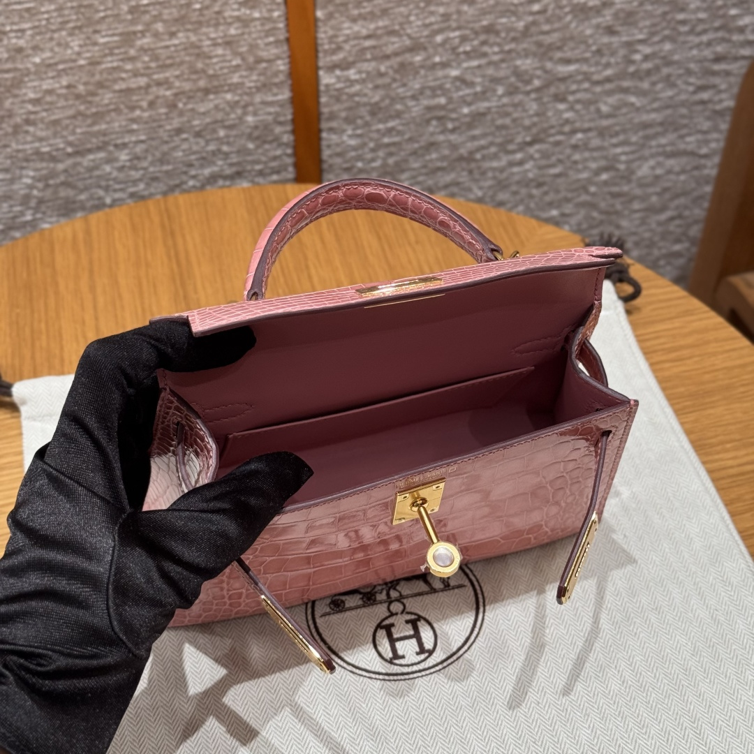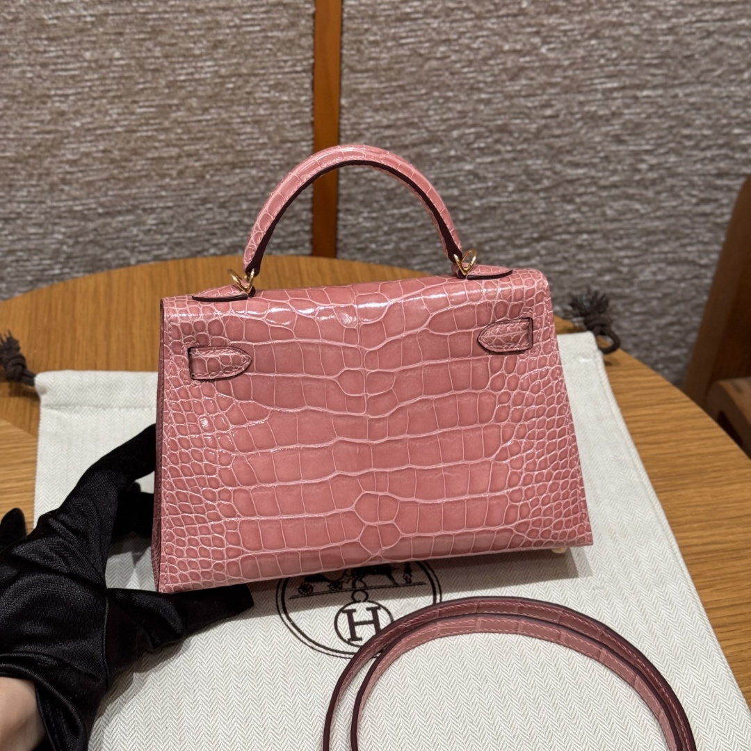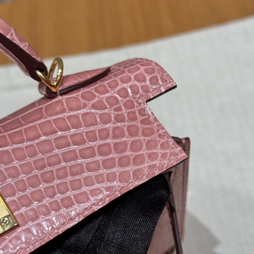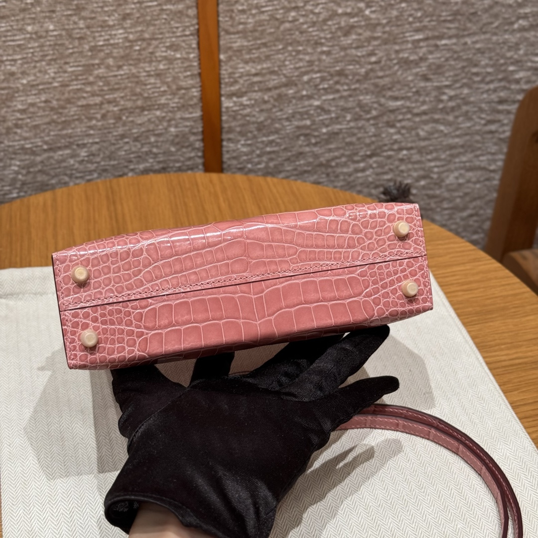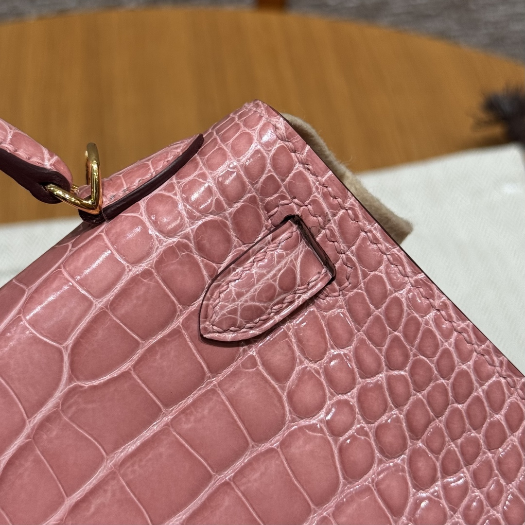 Mini Kelly second generation, milkshake pink, French imported bright American alligator, gold clasp, high-end fully handmade exclusive customization.