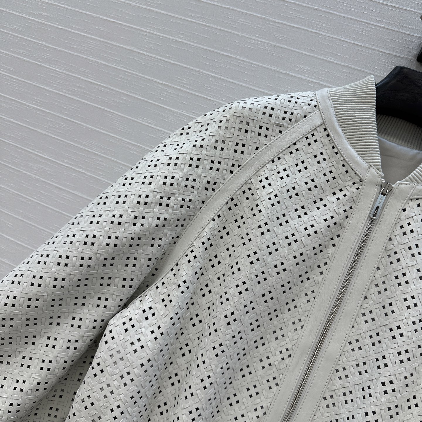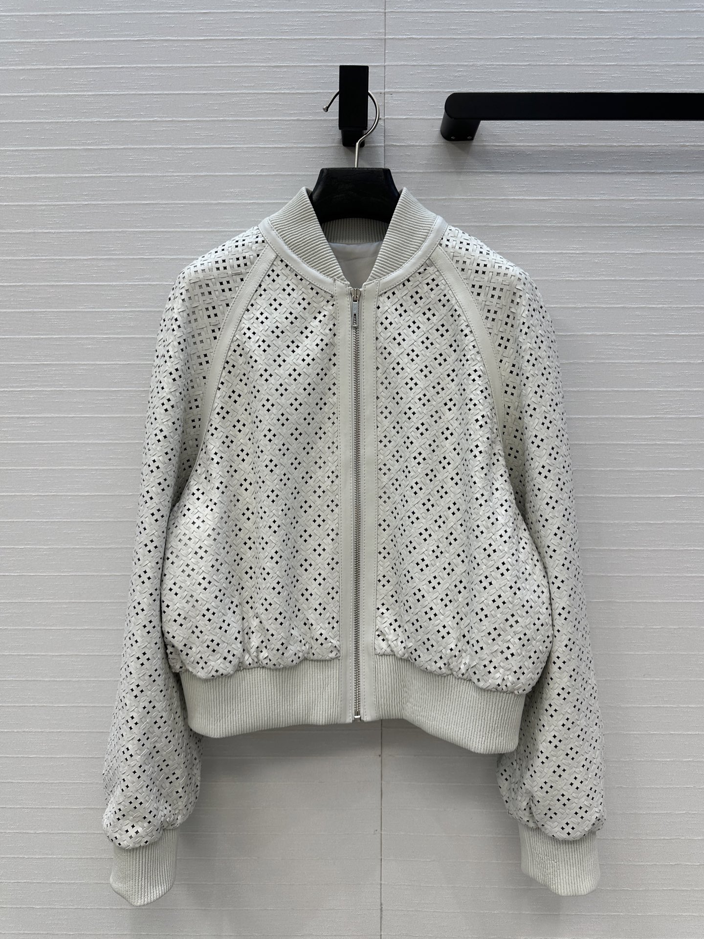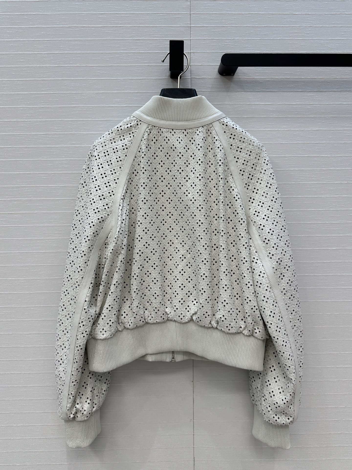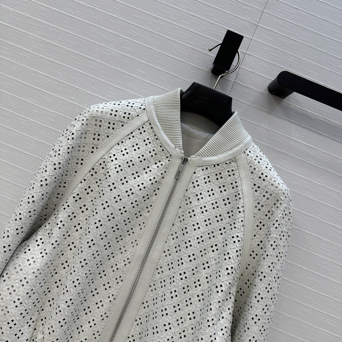 Exclusive First Release High-End Original Quality! H Autumn and Winter New Hollow Knit Craft Flight Jacket Leather Coat, Classic Stand-Up Collar Elastic Waist Design Short Style Suitable for Everyone, Sweet or Cool! Exclusive Custom Imported 100% Lamb Leather! Laser Small Diamond Hollow Craft, Leather is Soft and Tough. Elegant, Handsome, Stylish, and High-End Vibe! Perfect 3D Tailoring, Wearing It Looks Very Slimming! Two Colors, 3 Sizes. Size 38, Dropped Shoulder, Bust 112, Length 51.