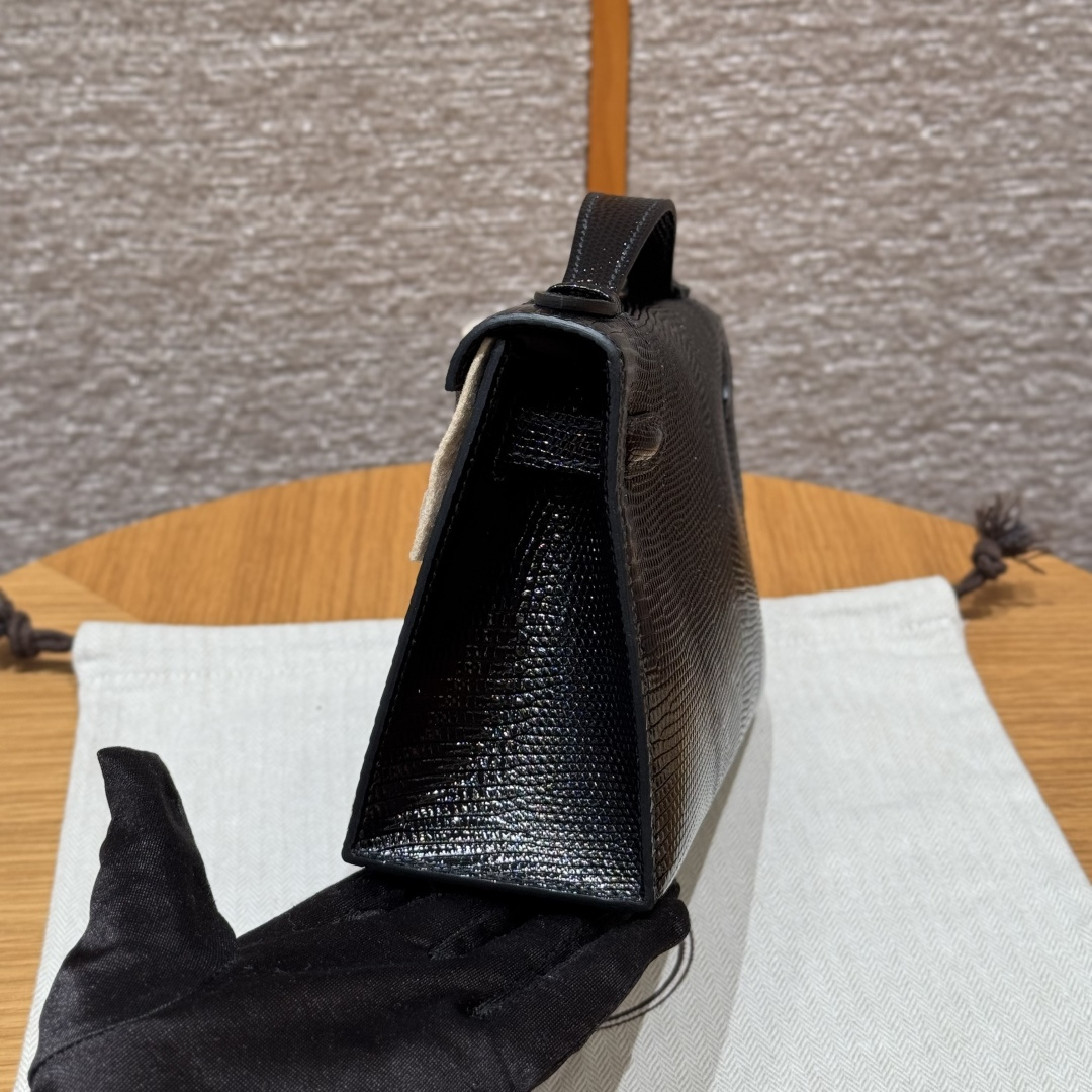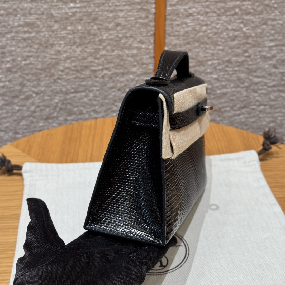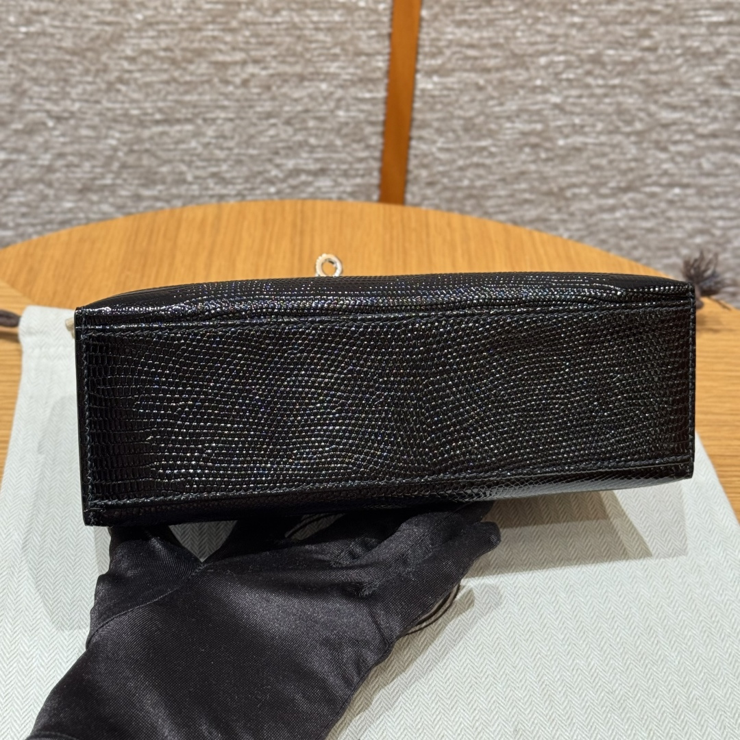 Mini Kelly first generation, black, French imported lizard skin, originally from South Africa, silver clasp, high-end fully handcrafted exclusive customization.