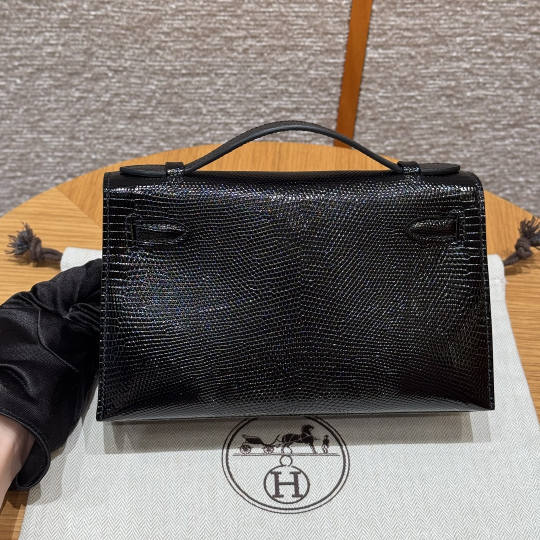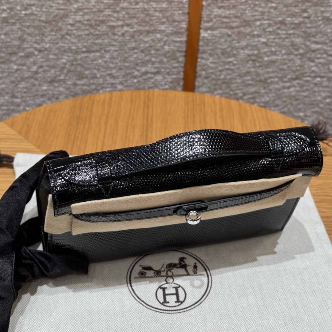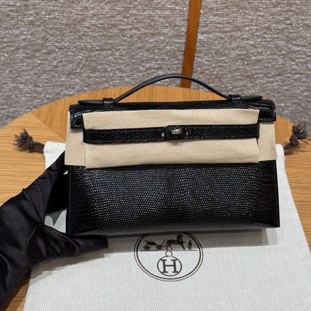 Mini Kelly first generation, black, French imported lizard skin, originally from South Africa, silver clasp, high-end fully handcrafted exclusive customization.