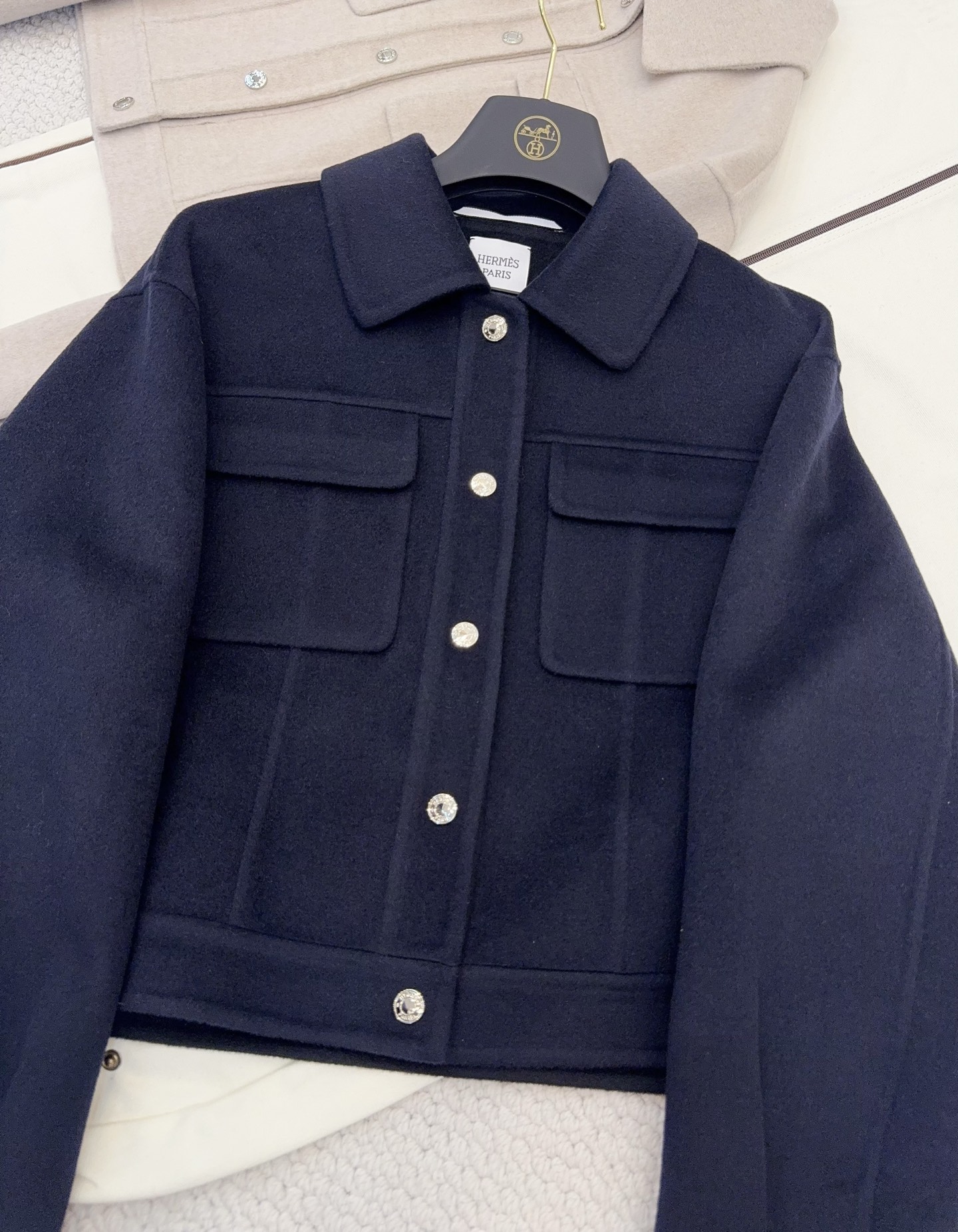 Ralph Lauren classic lapel zip jacket. Unisex. Colors: navy, khaki. Sizes: S, M, L, XL. Measurements provided.