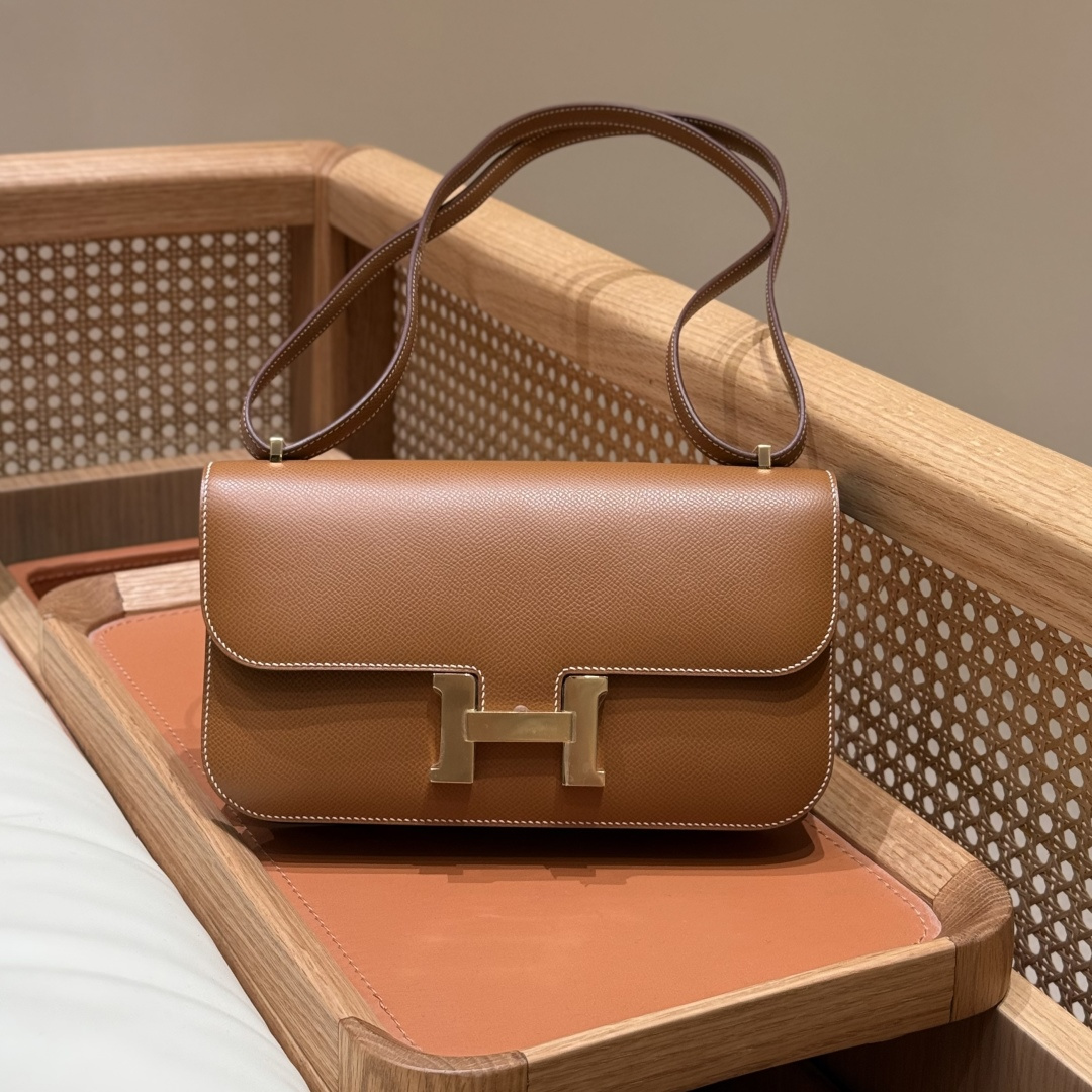 Constance underarm bag 24cm - mirror, golden brown, palm-grained leather, original imported cowhide from France, gold clasp, high-end fully handcrafted exclusive customization.