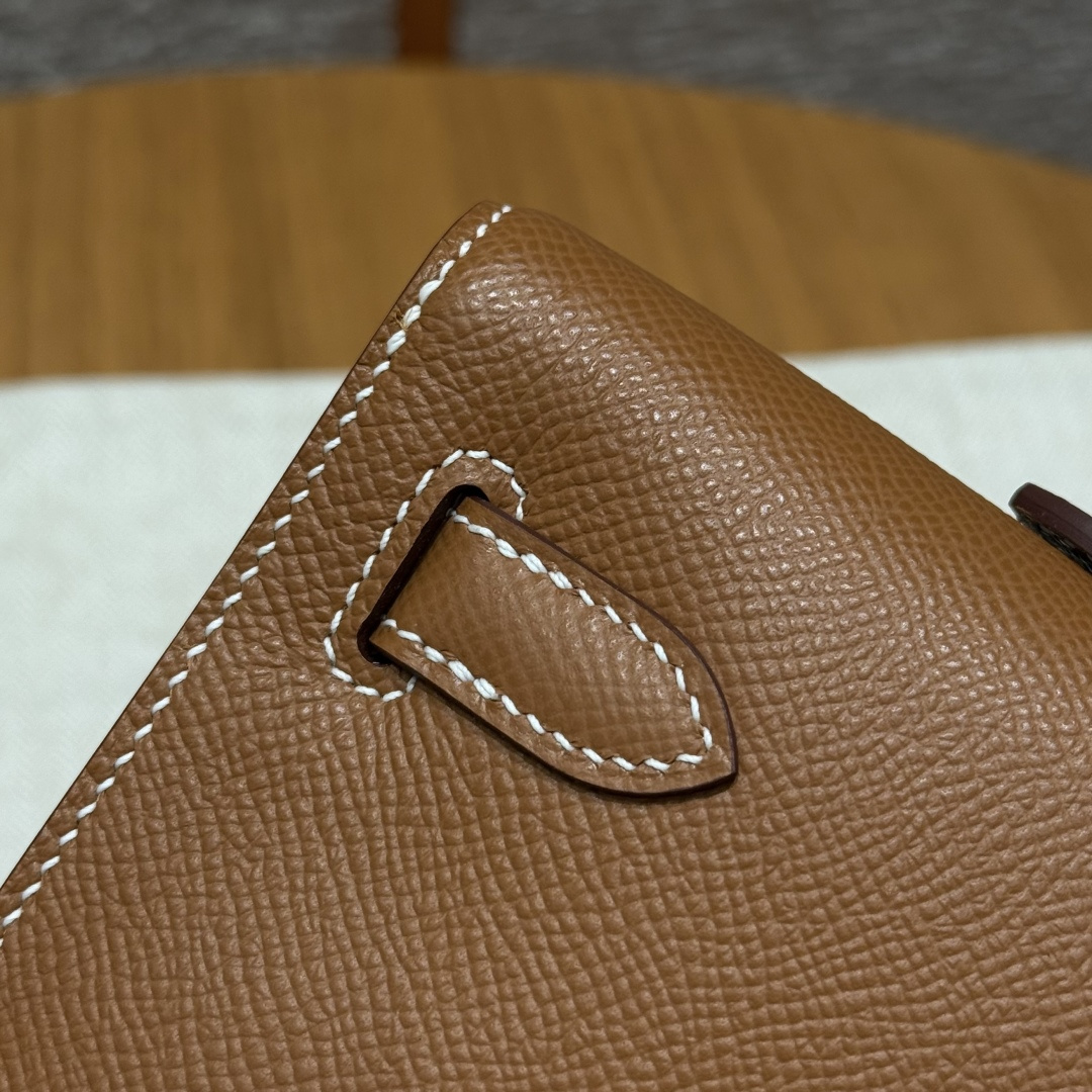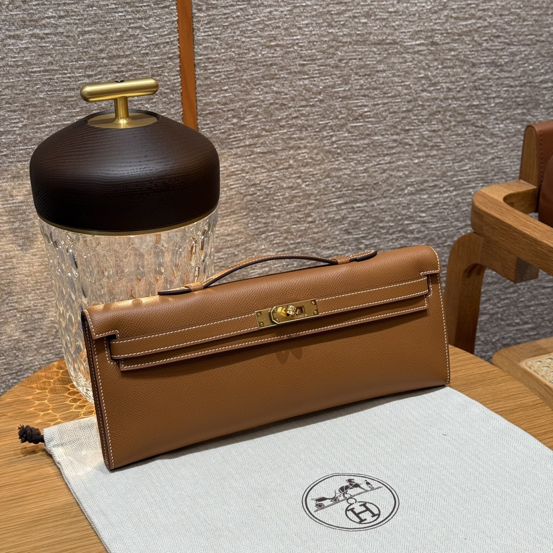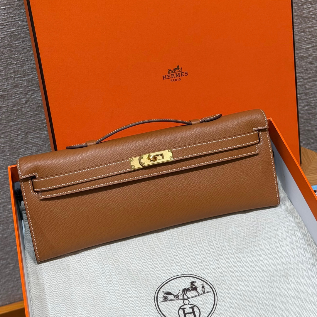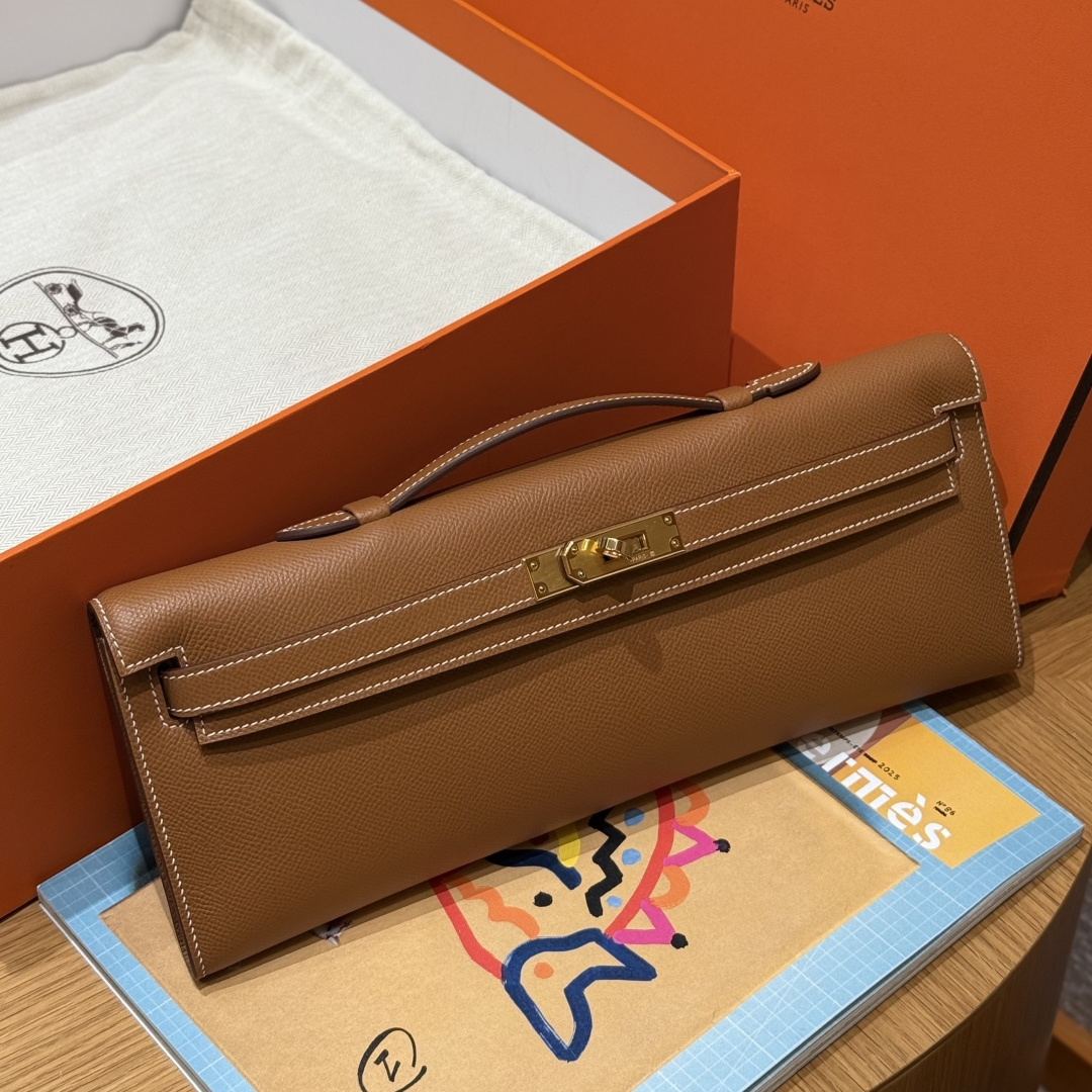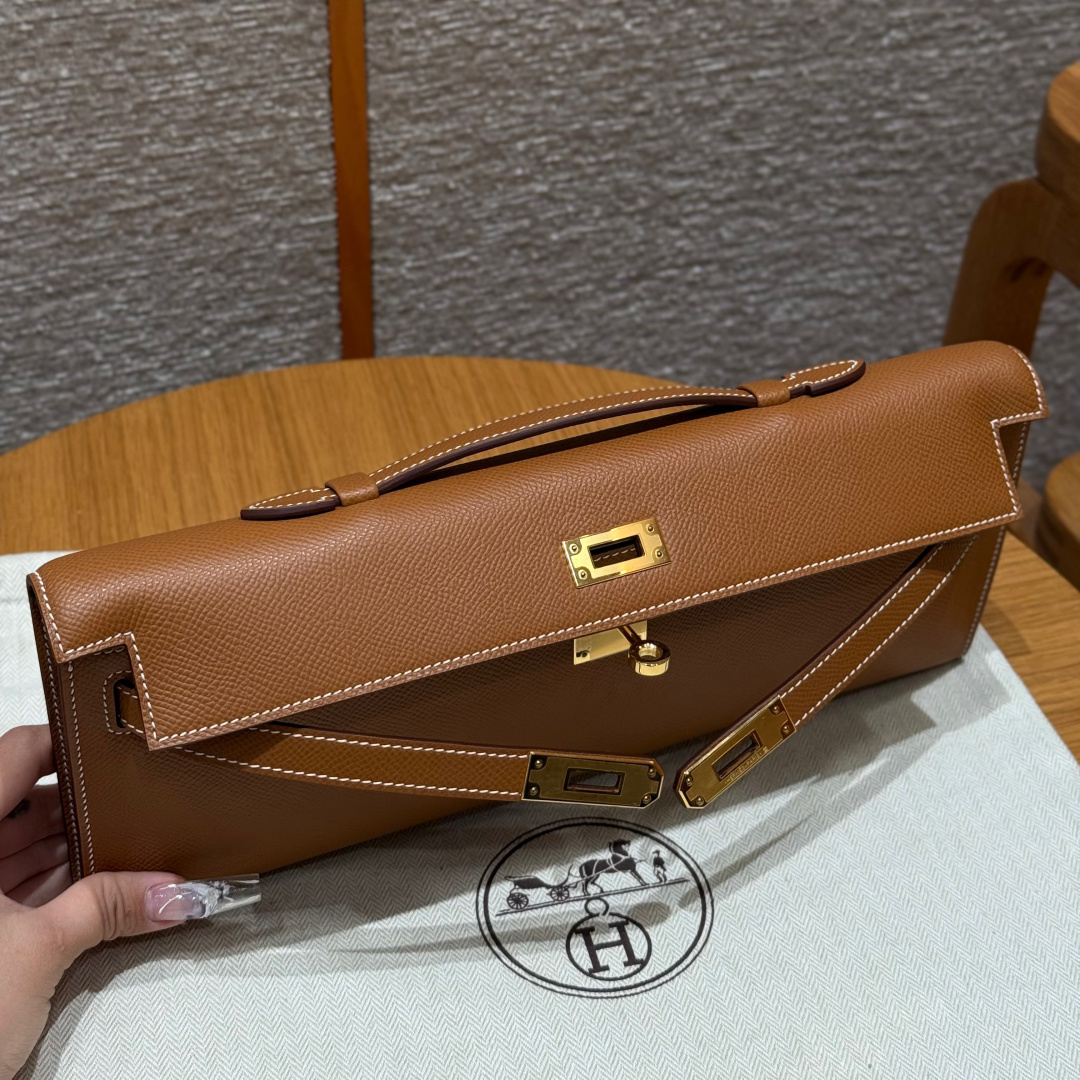 Evening bag 31cm, golden brown, grained leather, imported original cowhide from France, gold clasp, high-end fully handcrafted exclusive customization.
