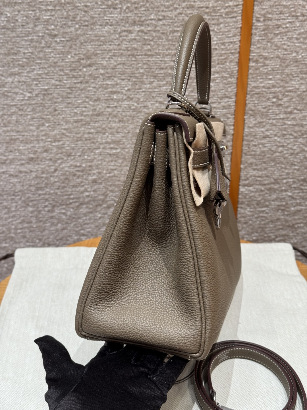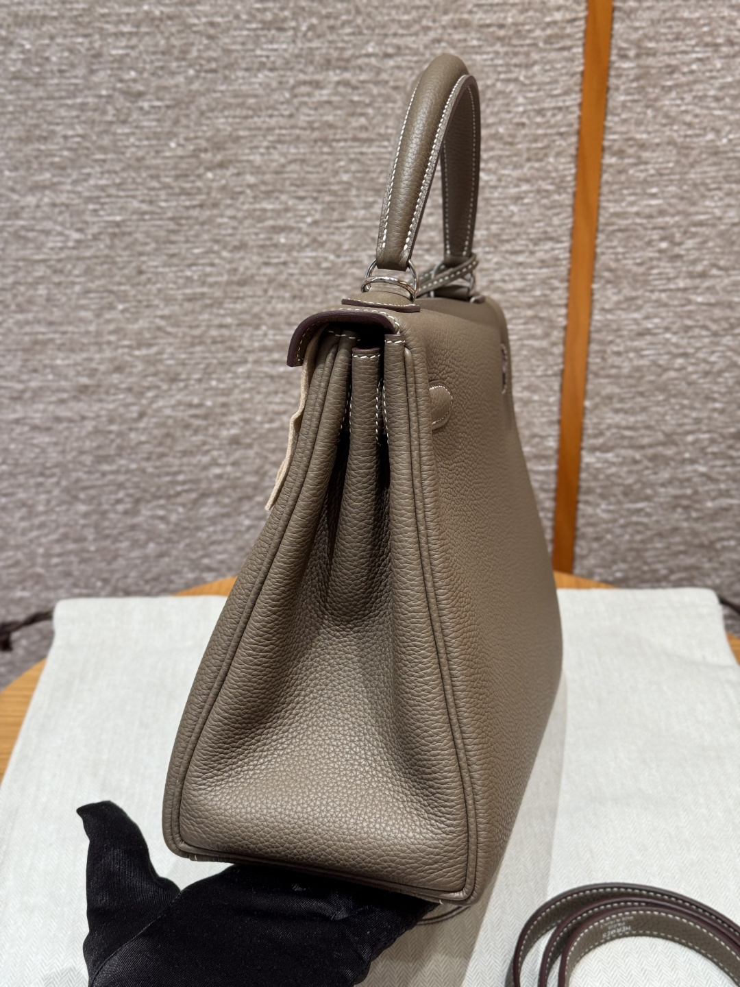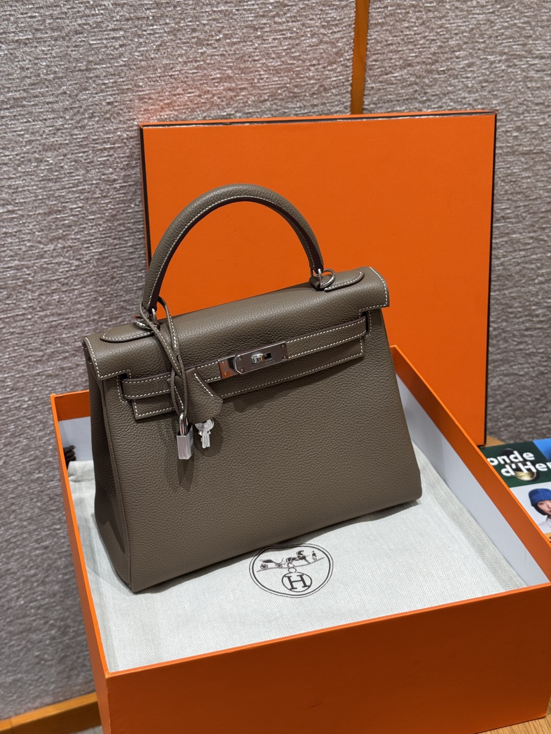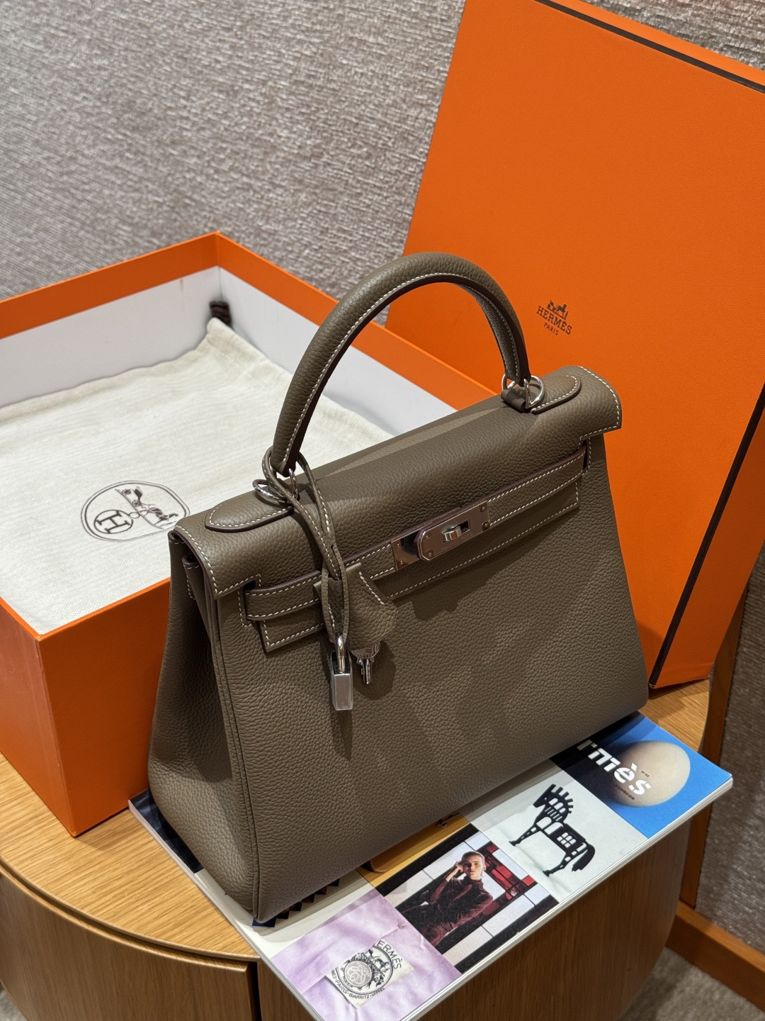 Kelly 28, Elephant Gray, imported cowhide from France, silver clasp, advanced fully handmade exclusive customization.
