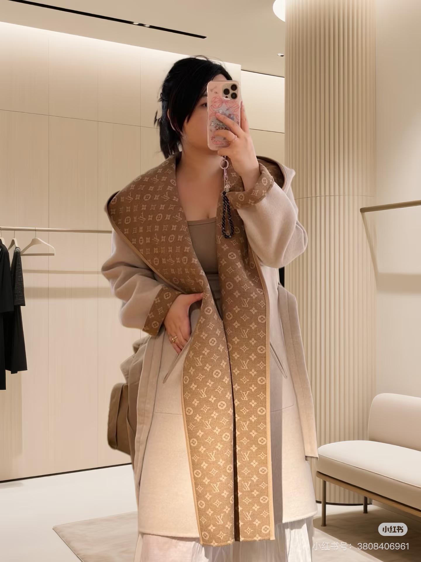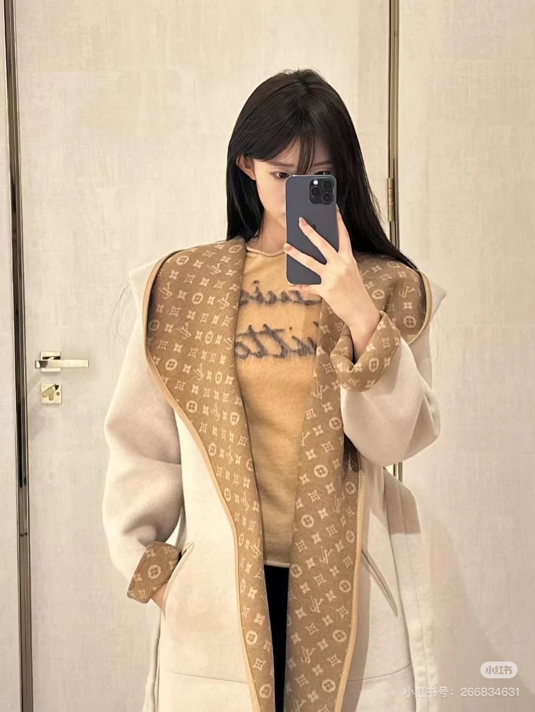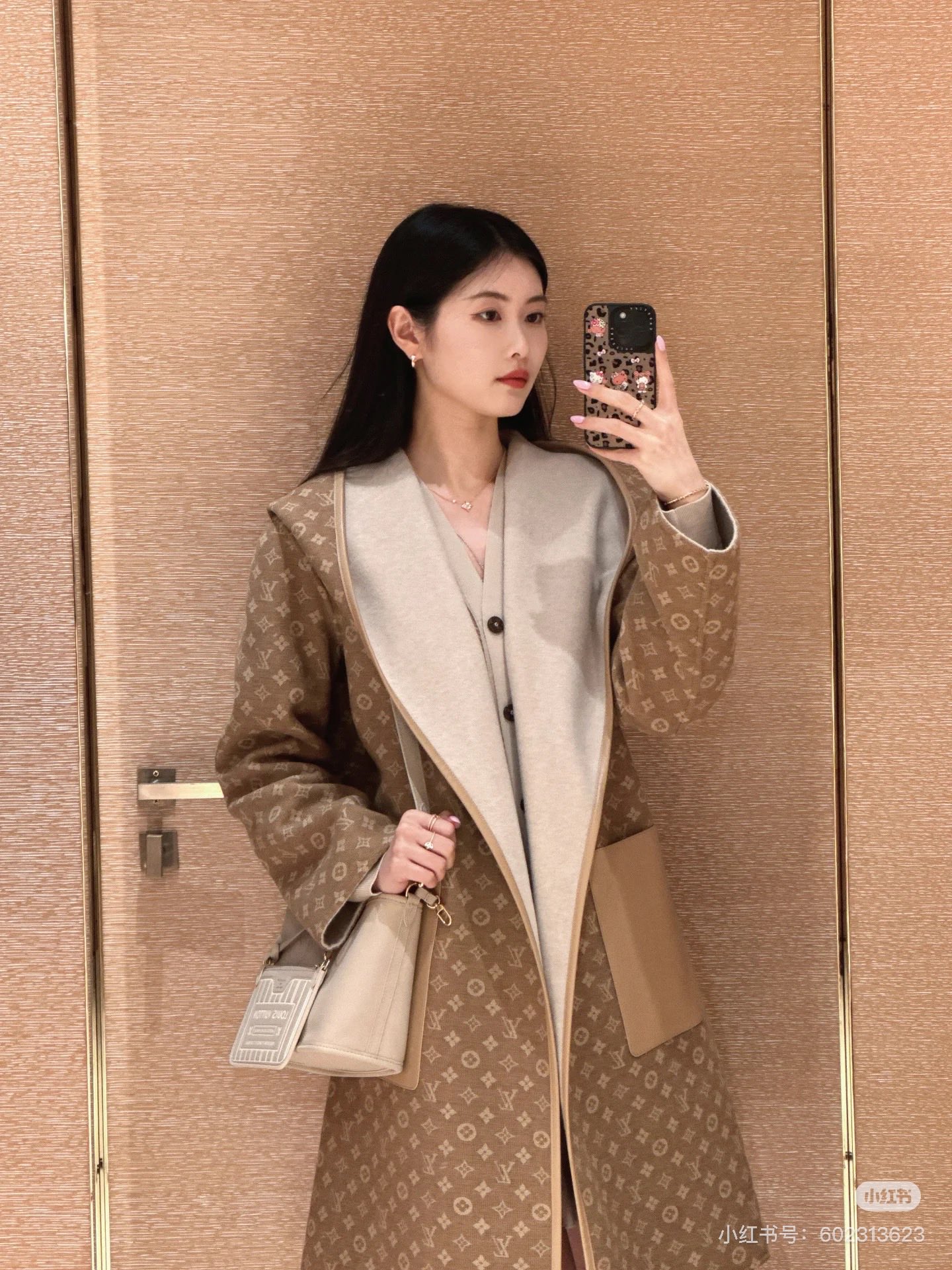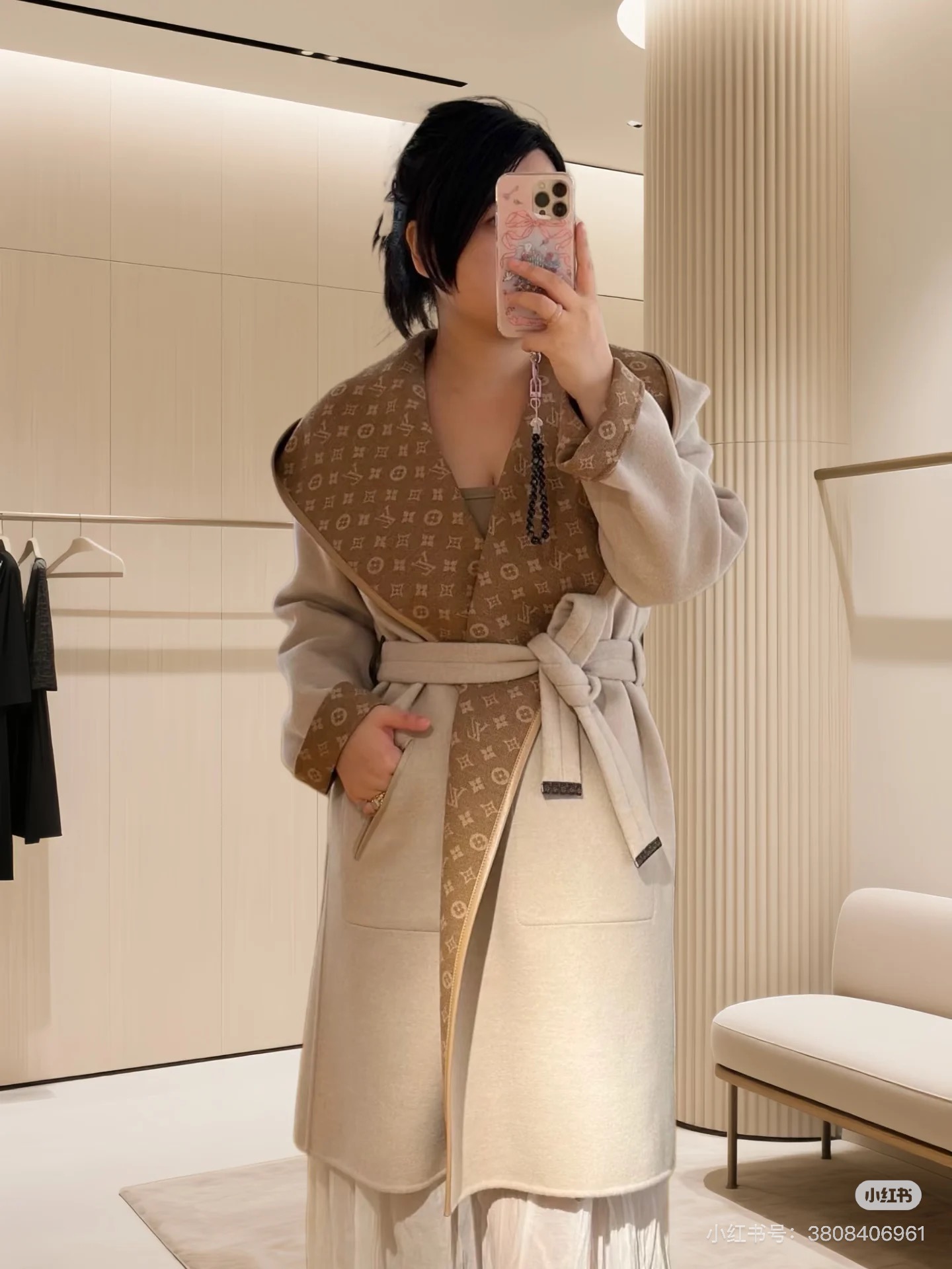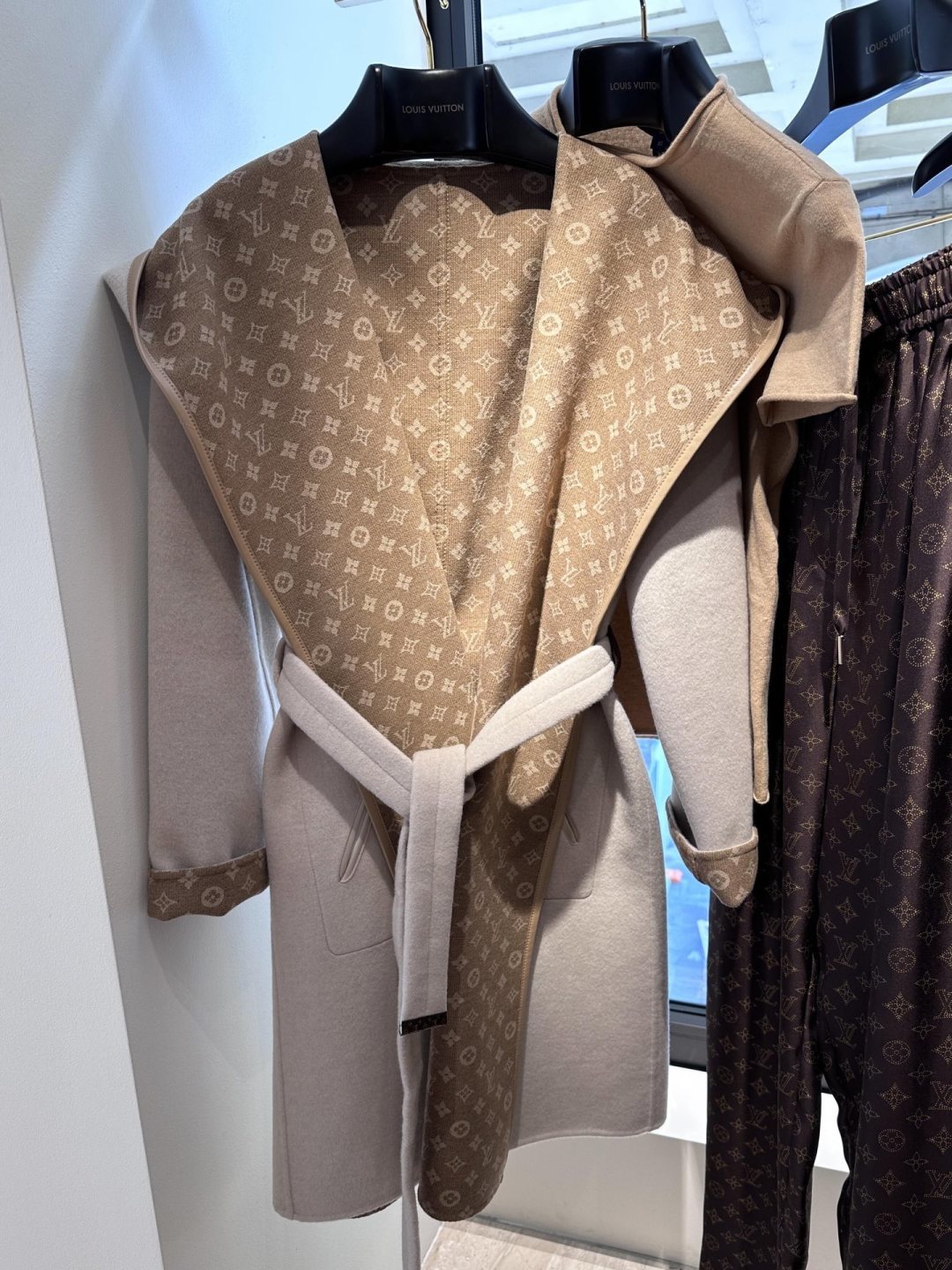 YB development, custom fabric, patch pockets and detachable leather collar. The inner jacquard pattern presents a three-dimensional effect. Silk and wool blend, cowhide emblem belt position. Can be worn on both sides.