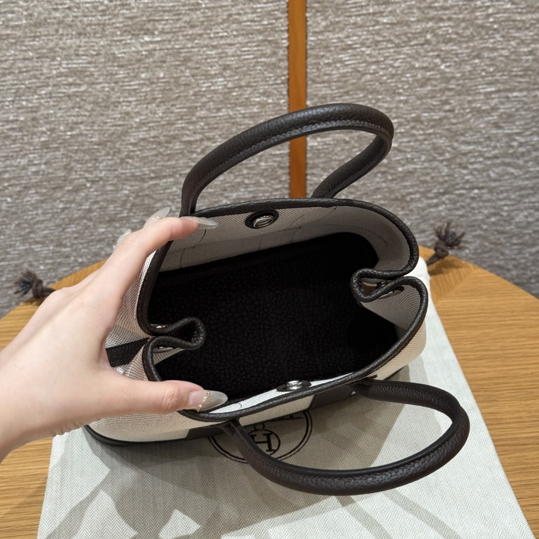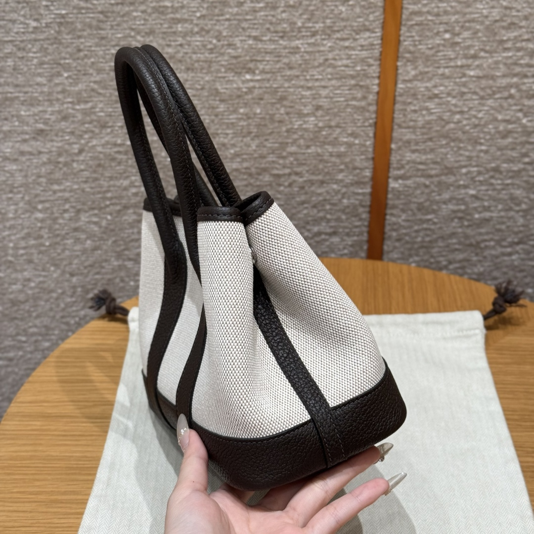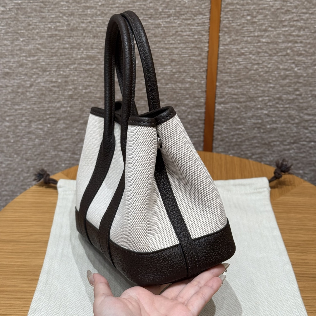 Garden bag 23cm, light beige/beige/ebony, canvas with NTOGO, French imported original cowhide, silver clasp, fully hand-stitched handmade high-end custom.