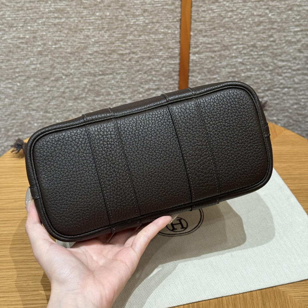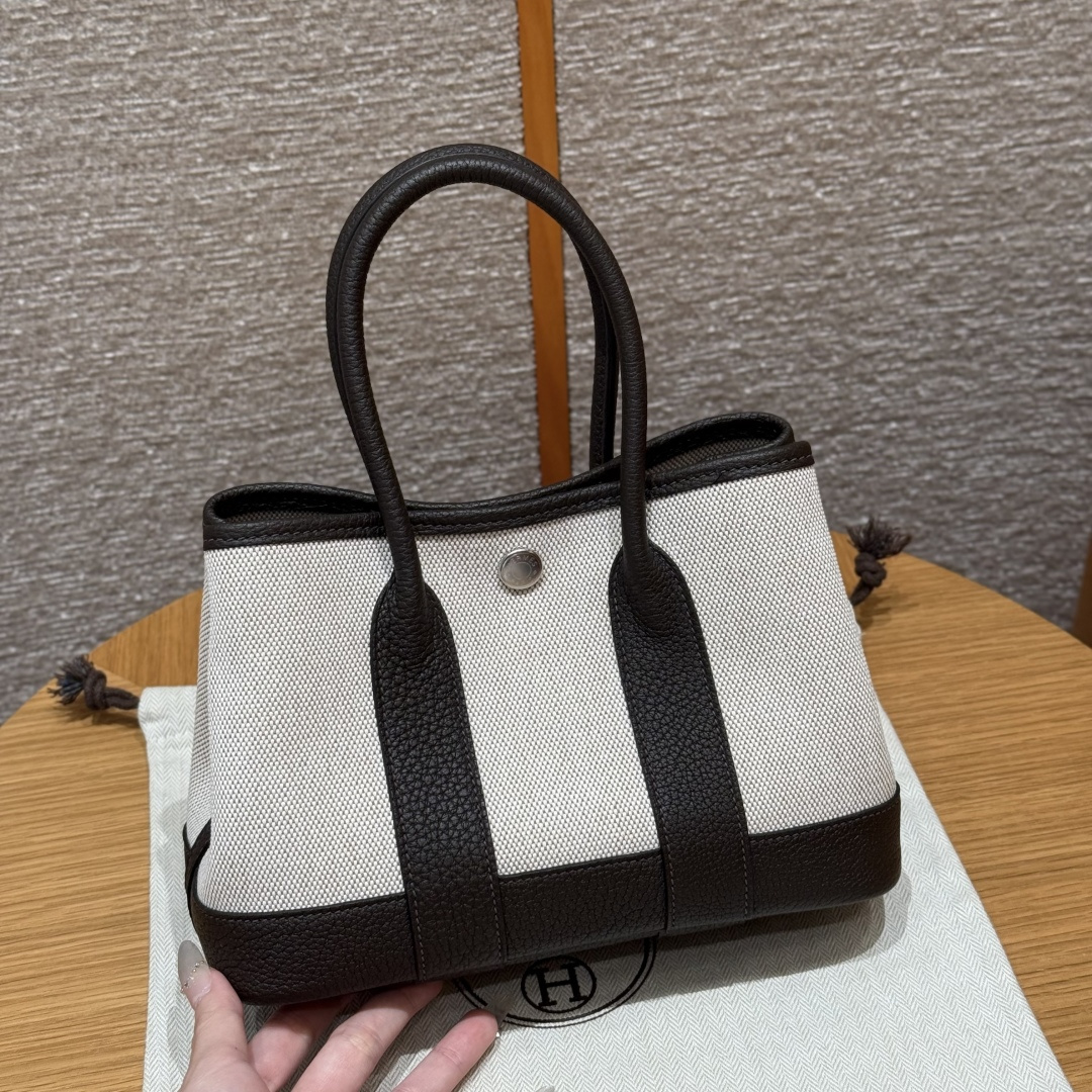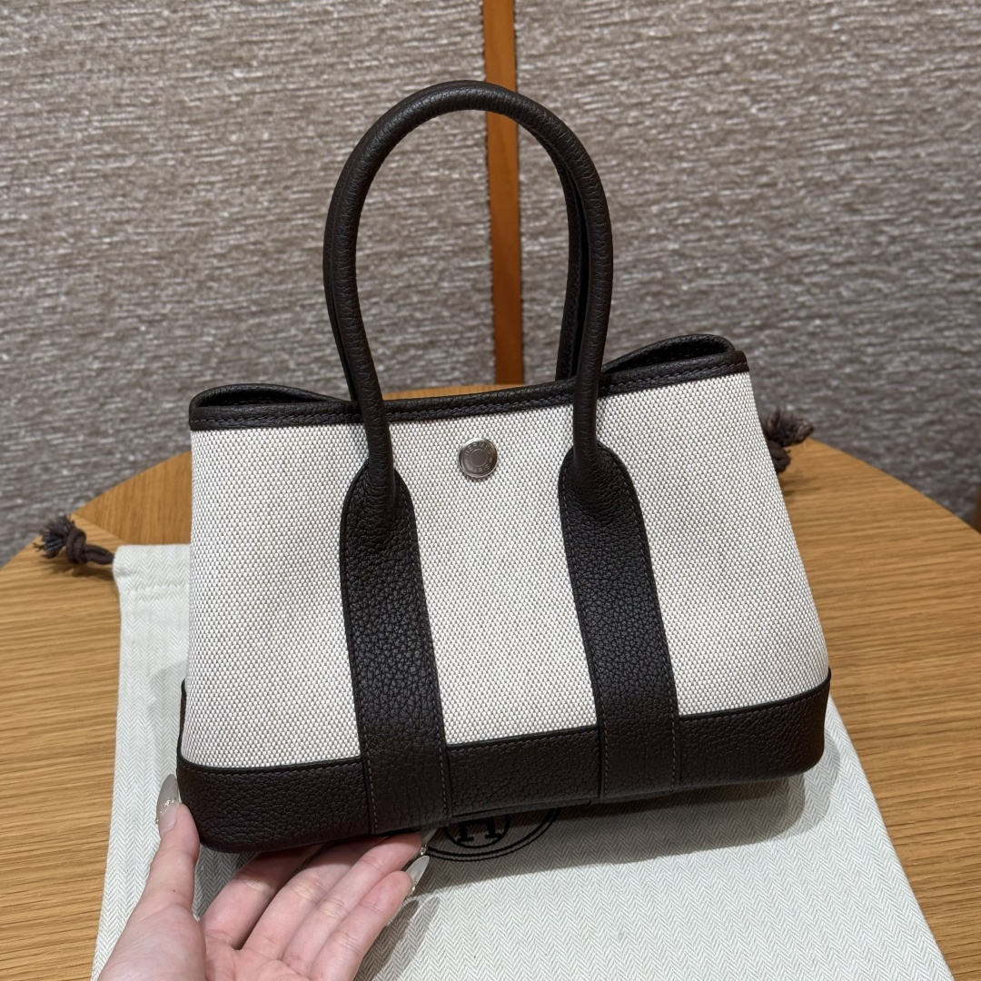 Garden bag 23cm, light beige/beige/ebony, canvas with NTOGO, French imported original cowhide, silver clasp, fully hand-stitched handmade high-end custom.