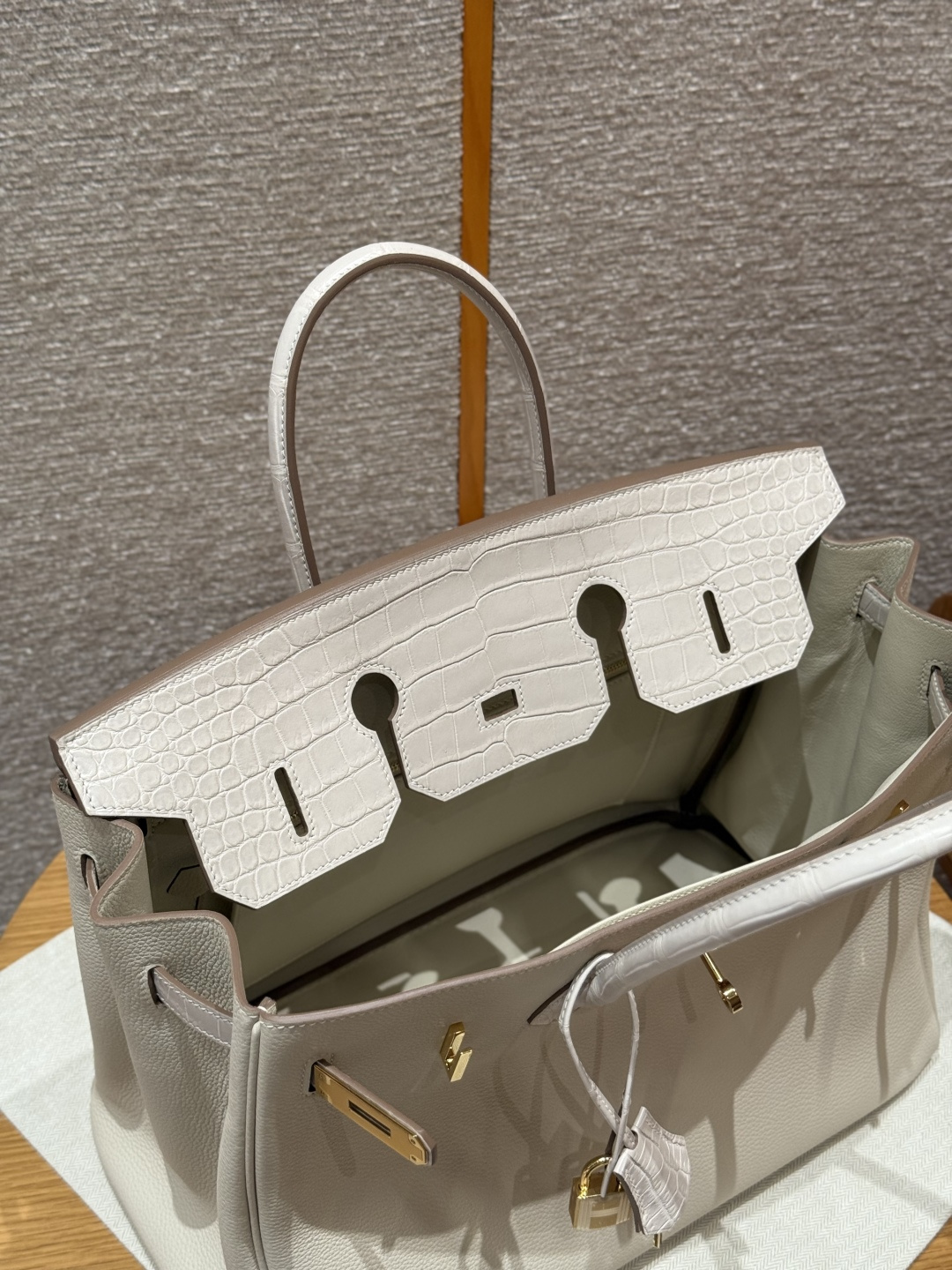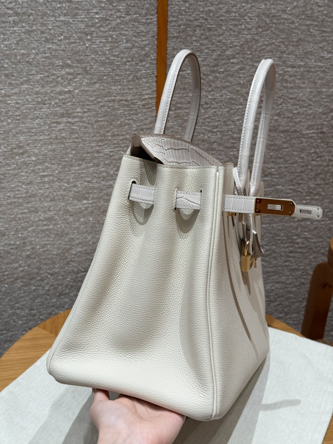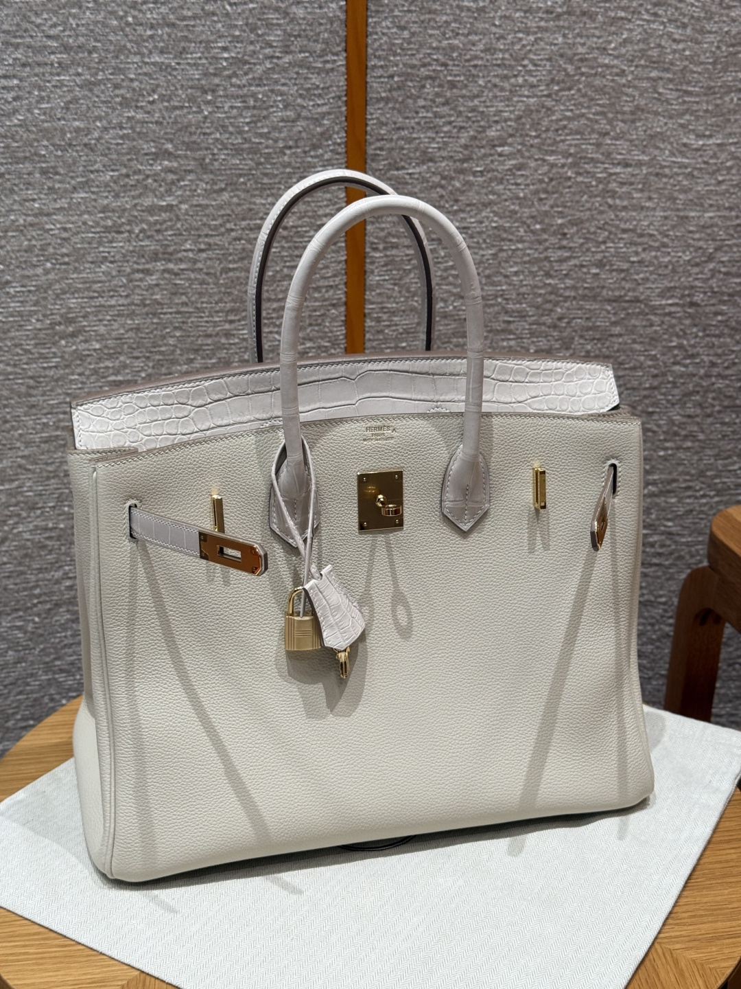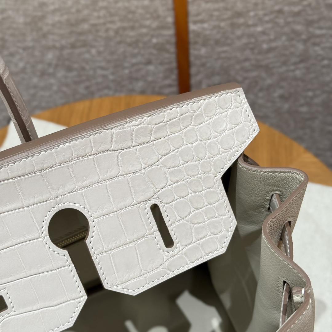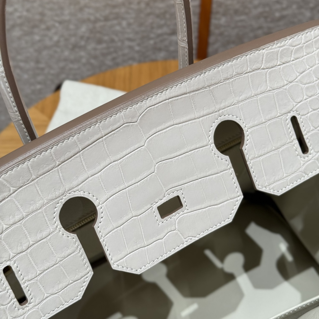 Platinum 35cm, milky white, togo leather, original French imported cowhide, combined with saltwater crocodile, gold clasp, high-end fully handcrafted exclusive customization.
