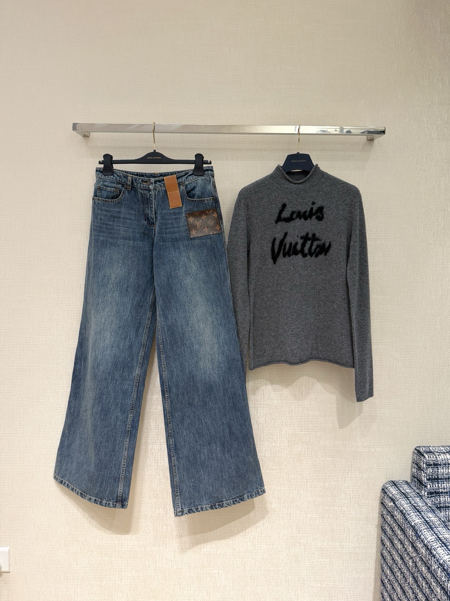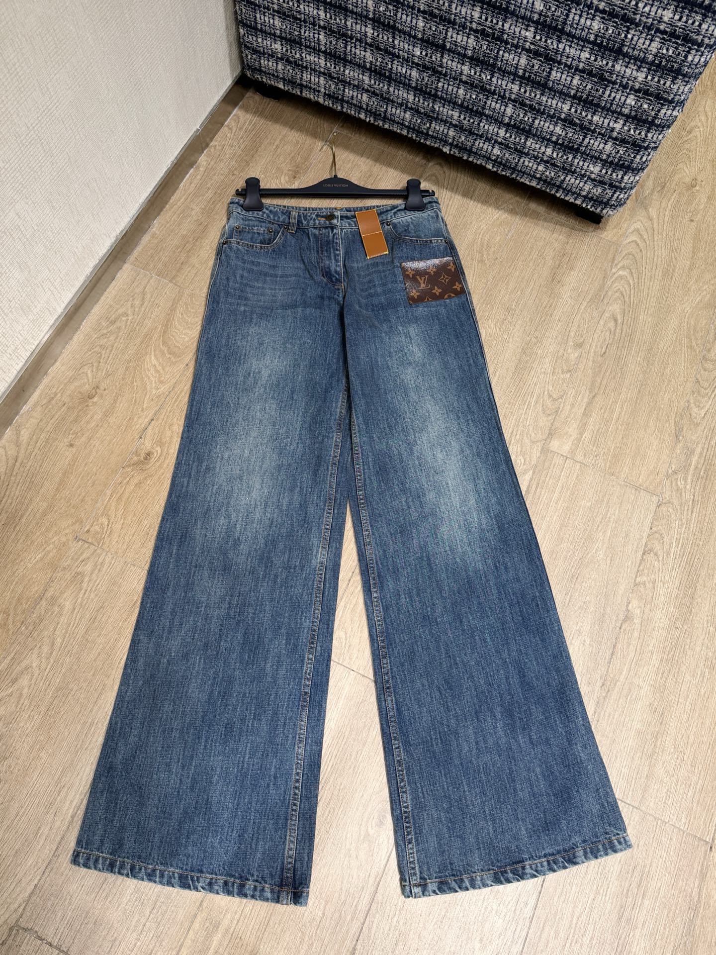 Louis Vuitton monogram leather-patched jeans | Many have been looking for these. The previous fringe-hem style has been selling well, and the two designs have distinct differences in cut. They feature a mid to low waist with wider legs, hugging the hip curve without being too tight. The lines are just right, really making your legs look straight! The overall wash has a nostalgic feel, full of character. Styling is flexible and unrestricted—you can go for a cool and sharp look or an elegant, feminine vibe. If you want the Bella style, pair it with a high-waisted cropped top, following the "narrow on top, wide at the bottom" rule, and add a pair of pointed flat shoes. Just walk down the street confidently and own your style.