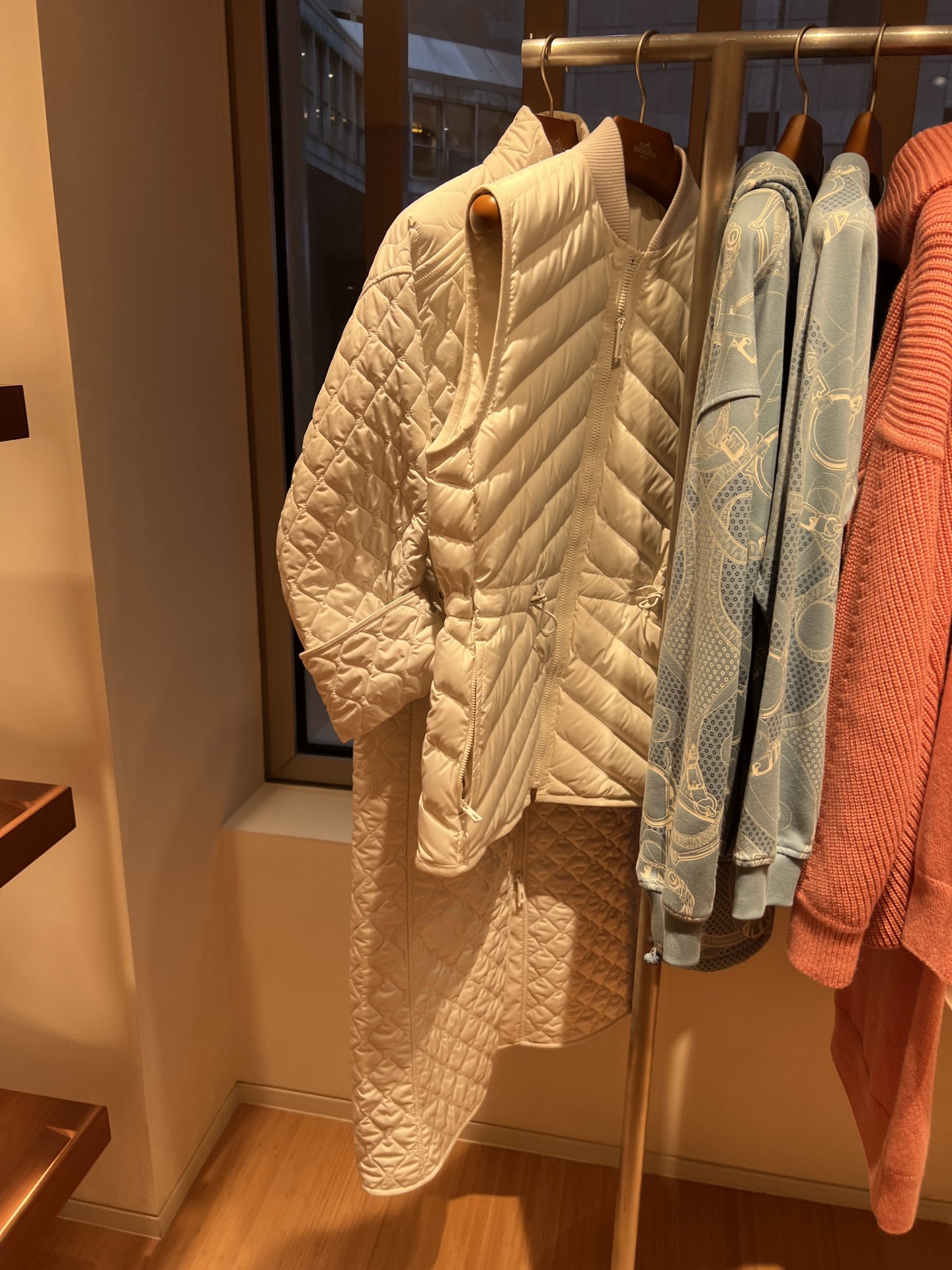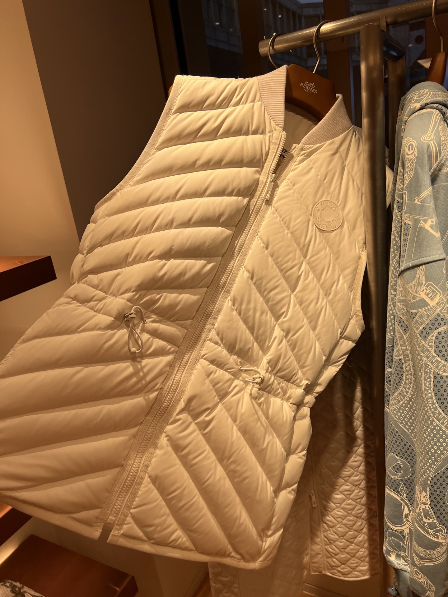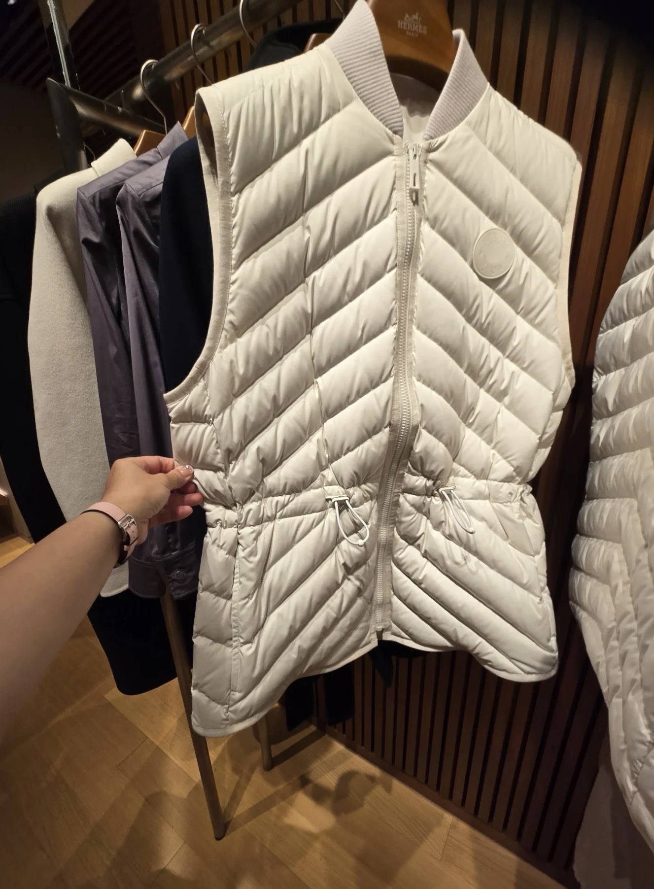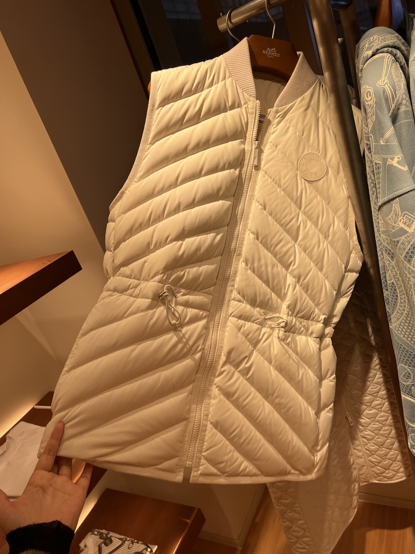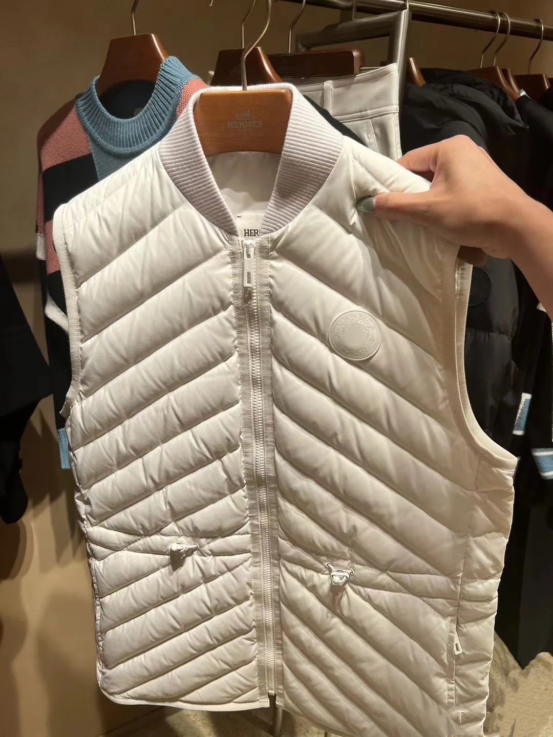 Down vest, solid color ribbed edge collar, drawstring waist design, diagonal pockets on both sides for a sense of layering and practicality, lightweight and warm fabric.