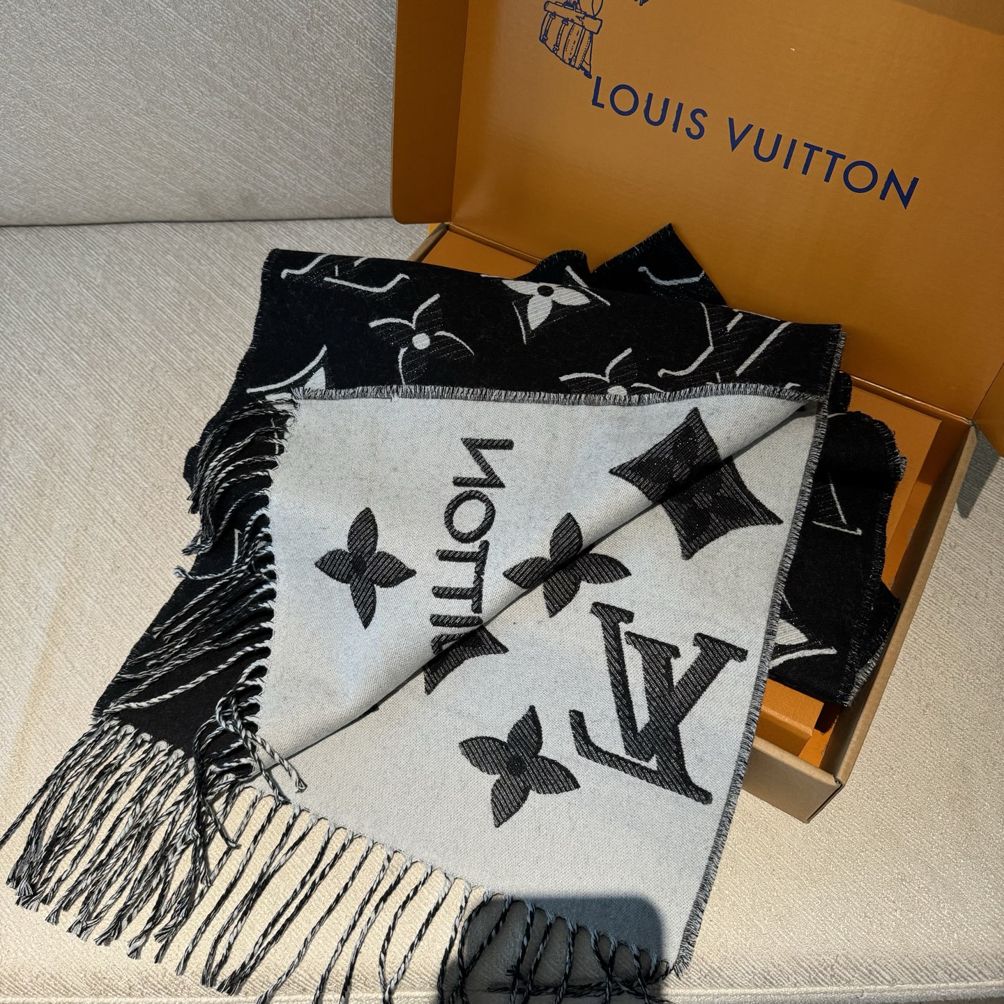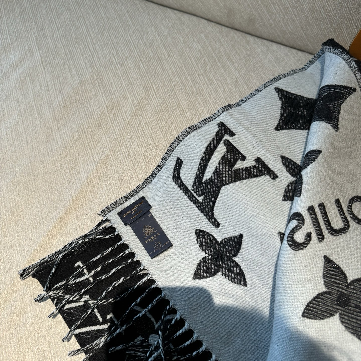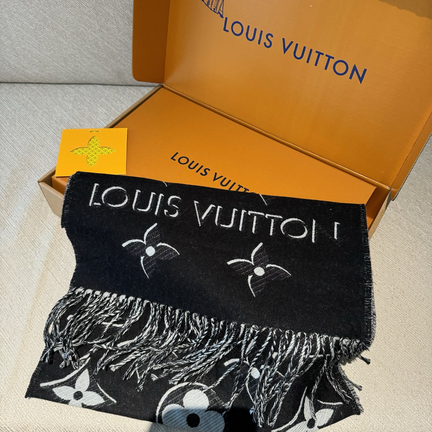 [Golden Thread Monogram Double-sided Long Scarf] [▪️LV's latest golden thread edition❗️Super stylish and full of presence!! The highest version available online—welcome to compare👍!!!] The classic monogram shawl has a new feel—truly stunning and very textured!! [Top version! Product numbers and other details are fully consistent, with the latest anti-counterfeiting features from the boutique!] Unbeatable value that outshines other versions! Welcome to compare~ truly great value and amazing!! Sim LV scarf enlarges the iconic Monogram pattern, accentuated with golden threads, highlighting Louis Vuitton's design heritage while adding a focal point to everyday outfits. Paired with long tassels, it offers a relaxed alternative to the Reykjavik and Logomania scarves. Wearing it gives you an incredible presence!!! It exudes the most sophisticated charm—you'll feel irresistibly narcissistic in front of the mirror! It looks高级 with any outfit!! Suitable for everyone—once you master styling the classic monogram shawl, you'll find it incredibly practical for daily wear!! Dimensions: 34*180cm! 100% wool long scarf!
