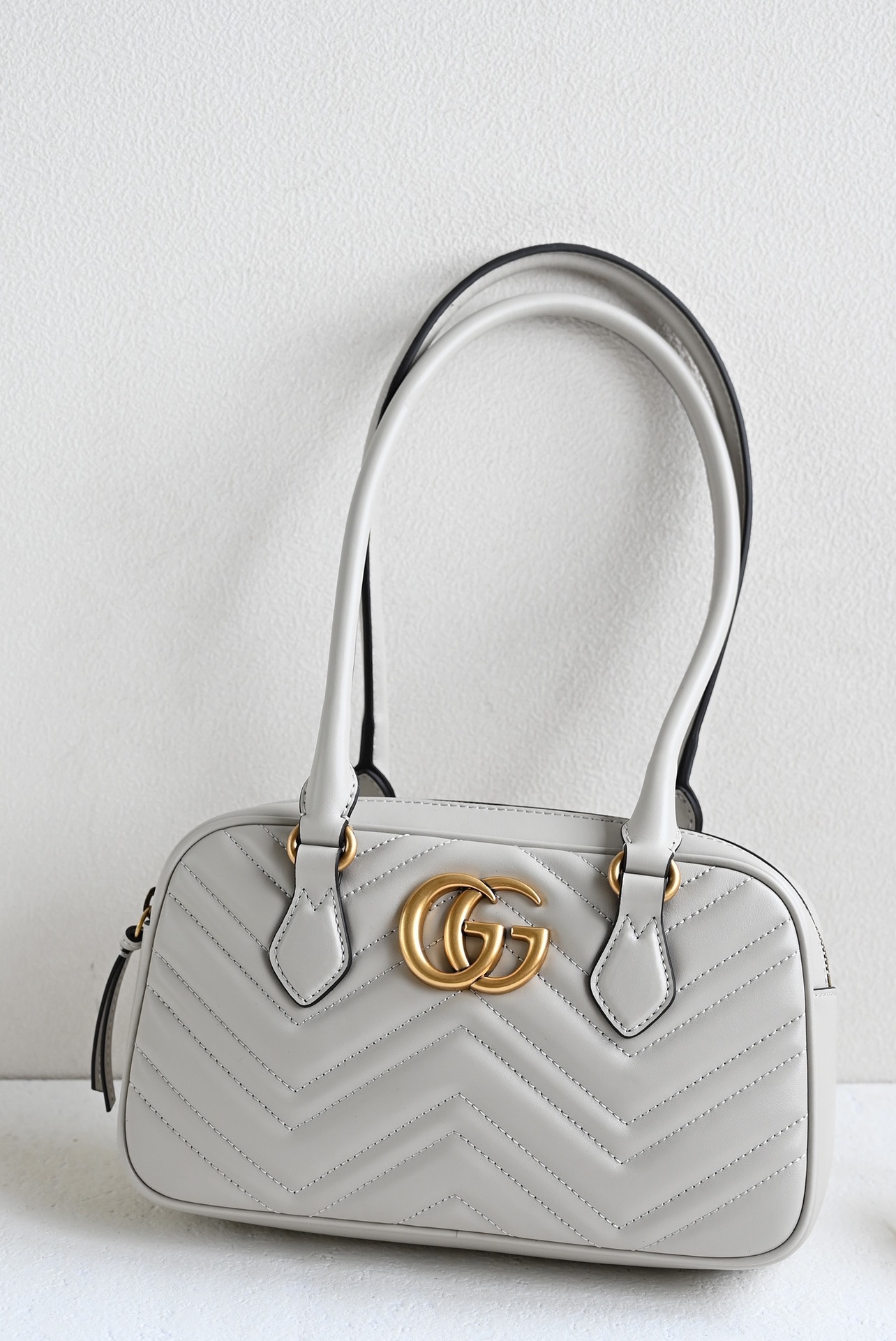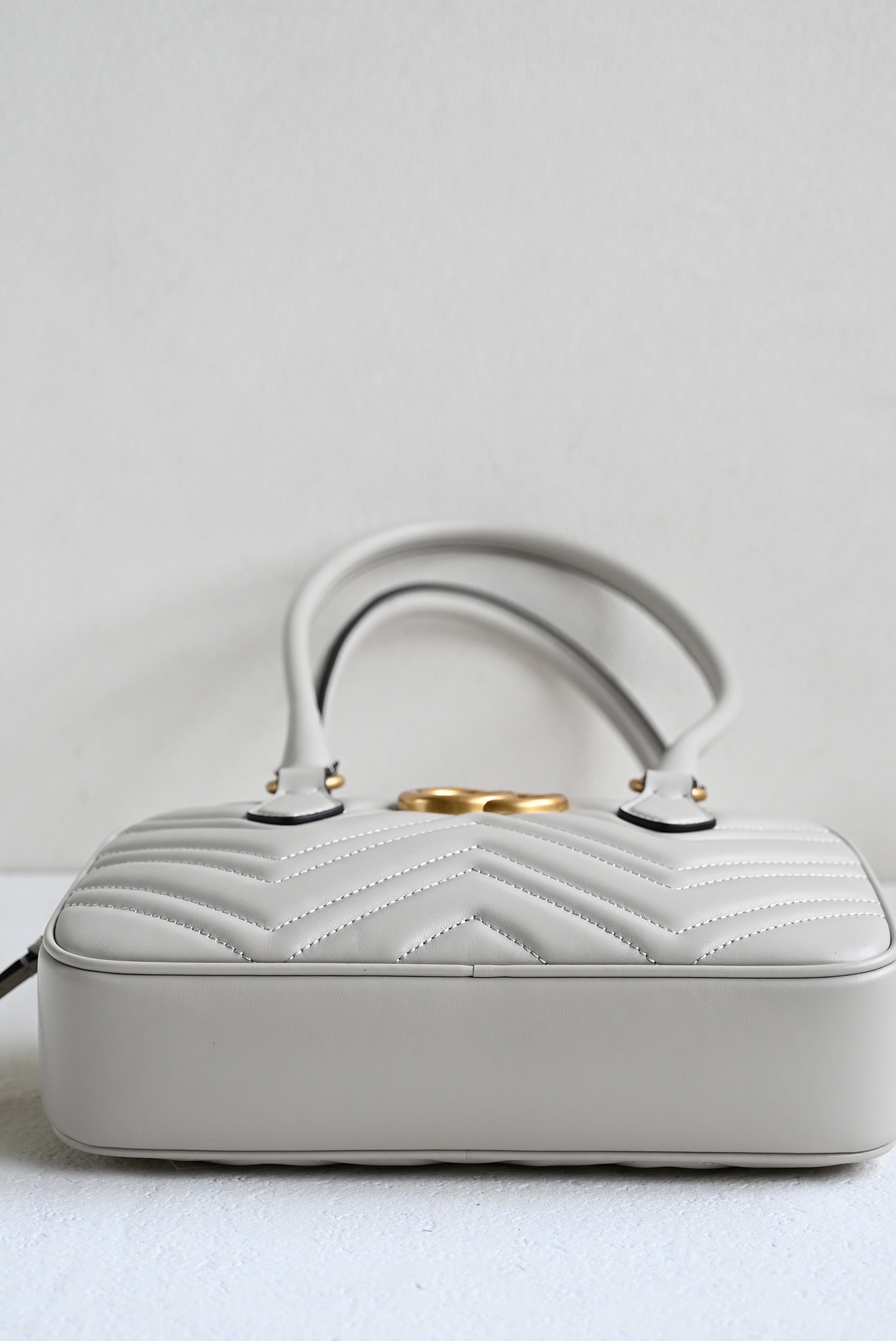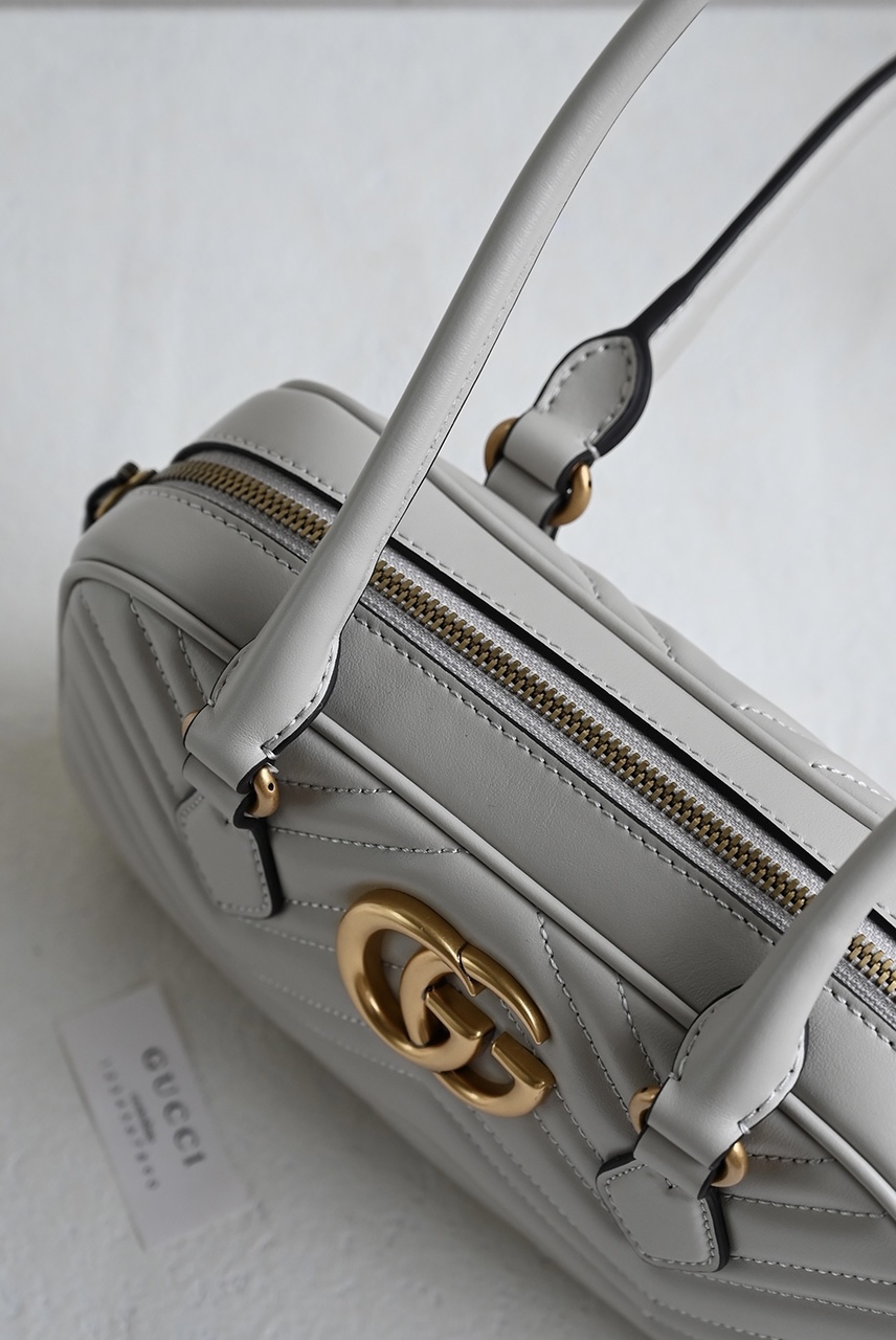 The GG Marmont series highlights the iconic matelassé chevron leather in new shapes and sizes for the pre-fall season. This small top-handle bag is crafted in a light gray hue, with gold hardware accentuating its modern silhouette. Light gray matelassé chevron leather