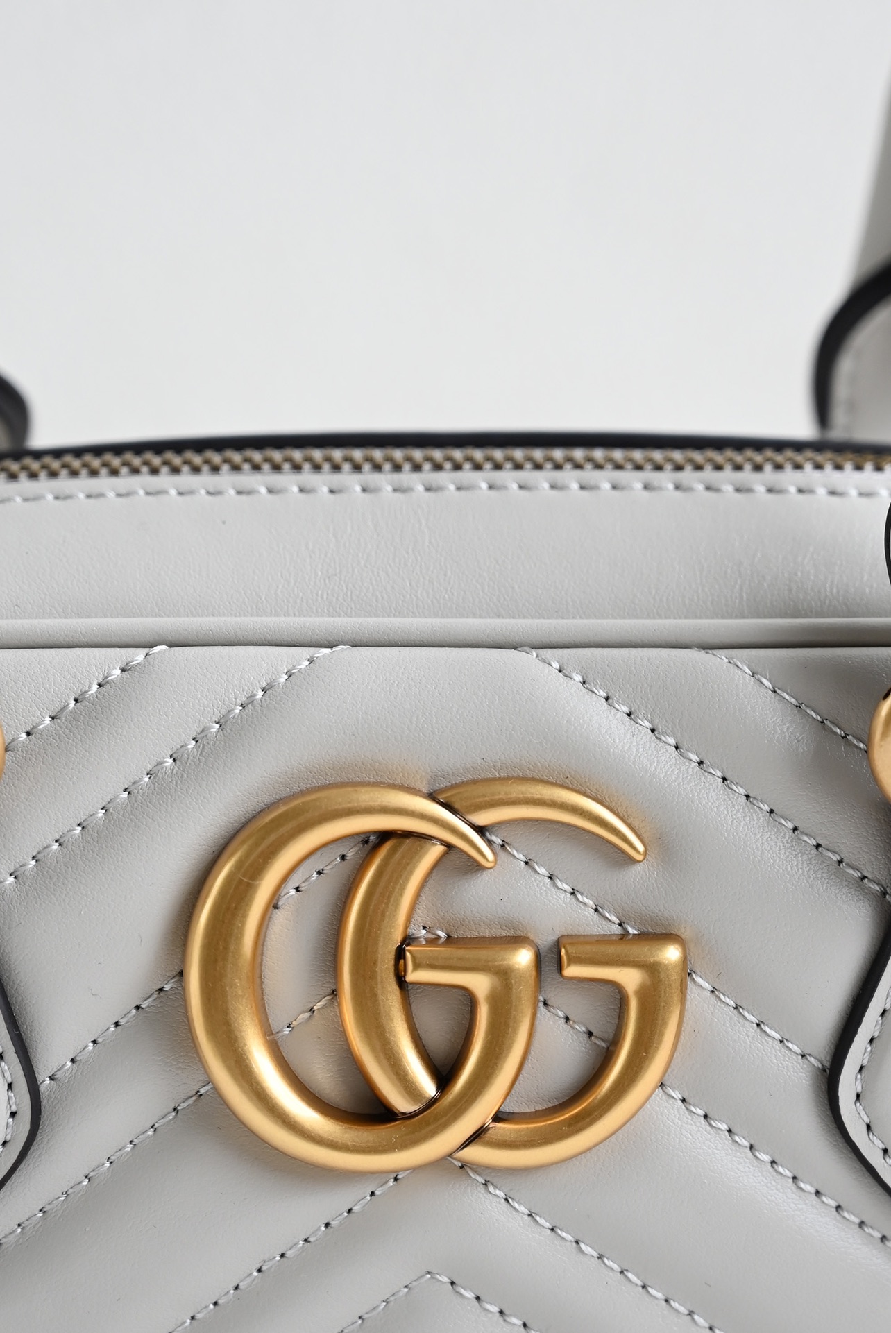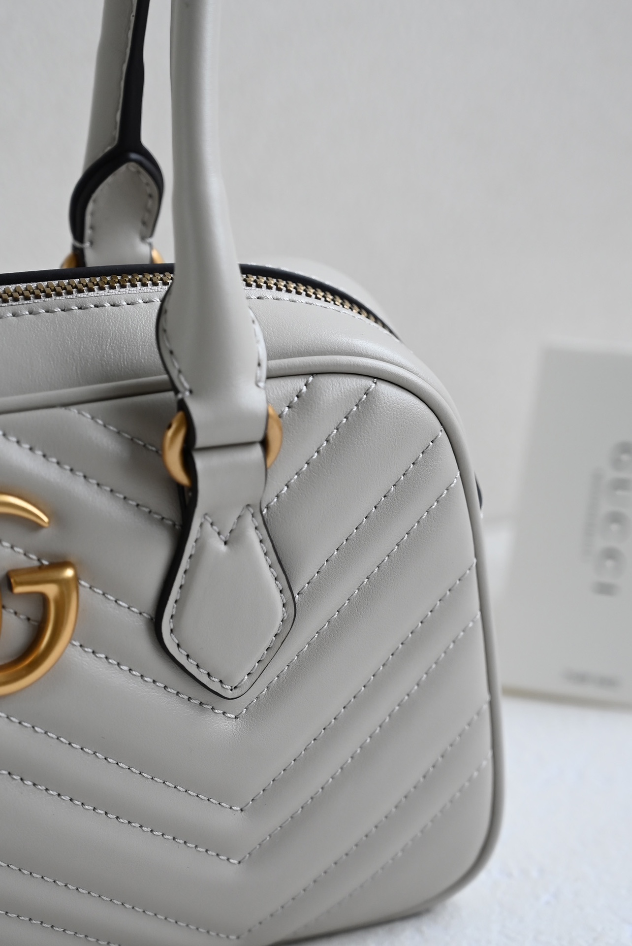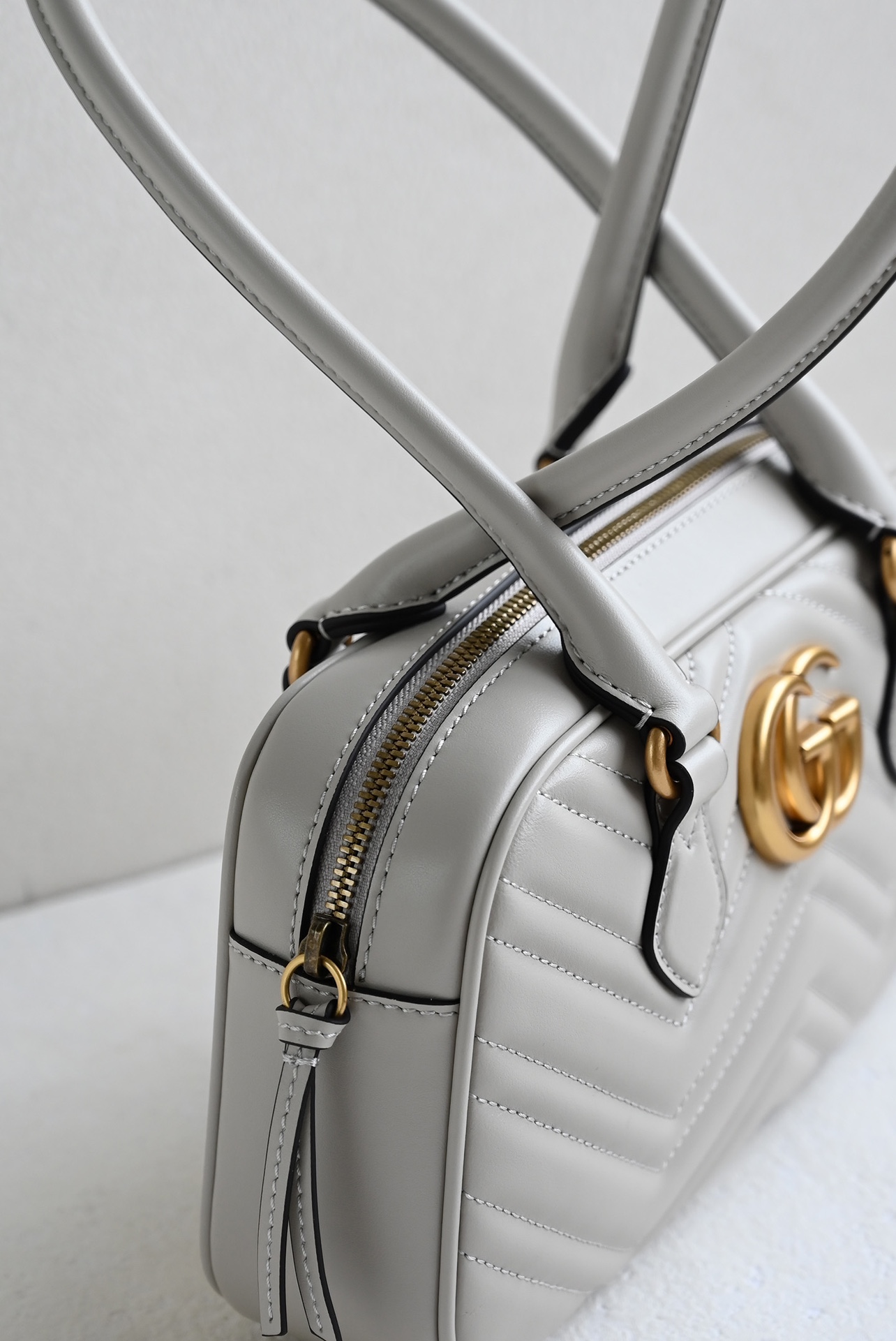 The GG Marmont series highlights the iconic matelassé chevron leather in new shapes and sizes for the pre-fall season. This small top-handle bag is crafted in a light gray hue, with gold hardware accentuating its modern silhouette. Light gray matelassé chevron leather
