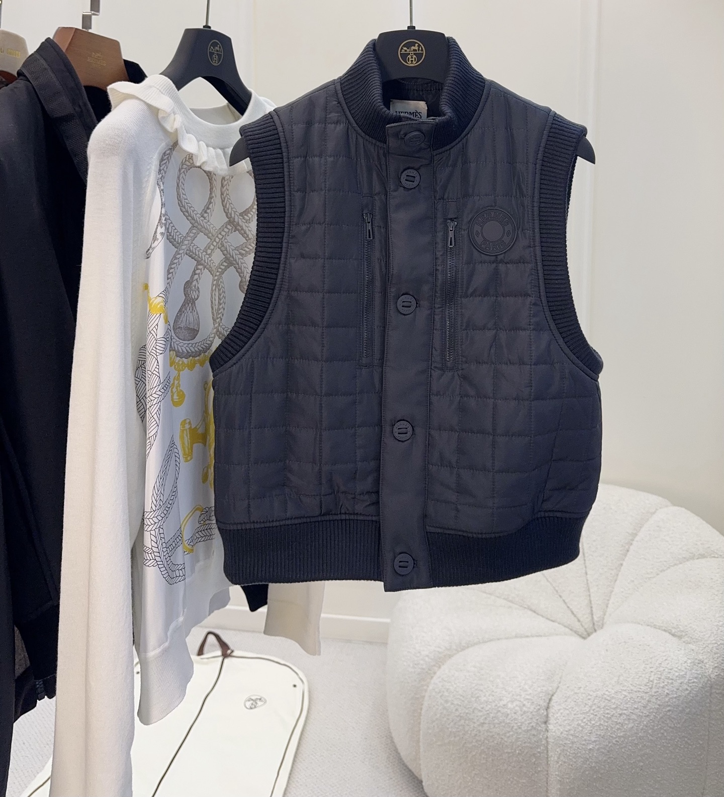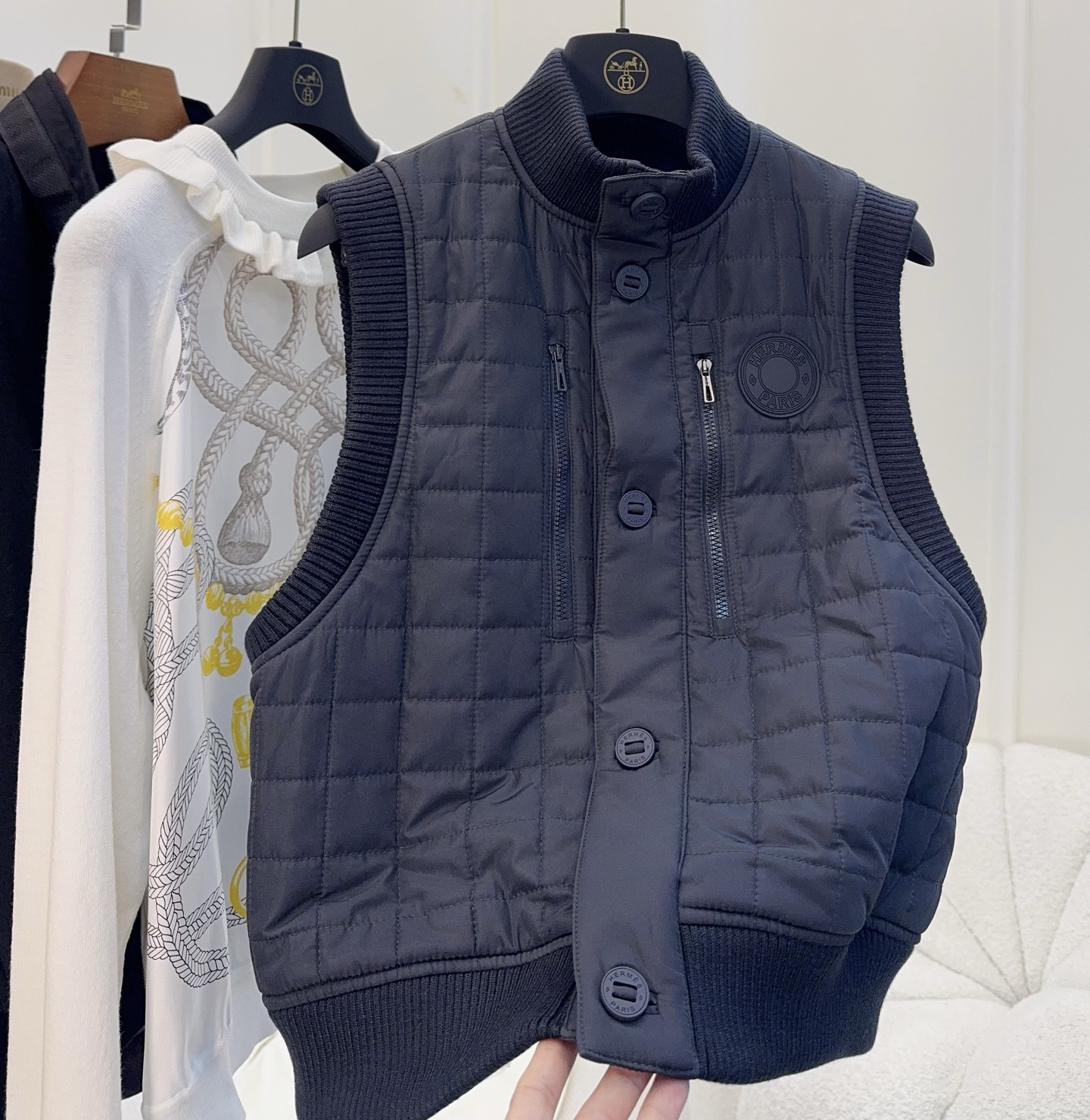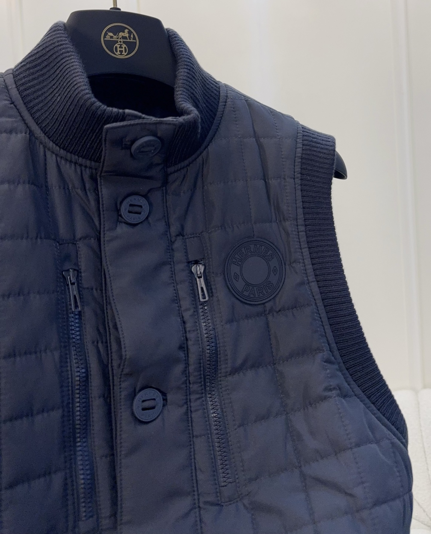 🆕🆕Hermes 2025 Autumn-Winter New Series Cotton Vest, Dark Navy Blue, High-End Quilting Craft, Cotton Filled, Warm and Lightweight, Ribbed Knit Collar and Cuffs, Full of Details, Front Button Closure, Easy to Wear and Take Off, Short Design, Petite-Friendly, Pairs Well with Knit Cardigans or Short Sleeves, Can Be Worn from Early Autumn to Deep Winter~ Practical and Stylish, It is an Essential Versatile Item for the Autumn-Winter Wardrobe!