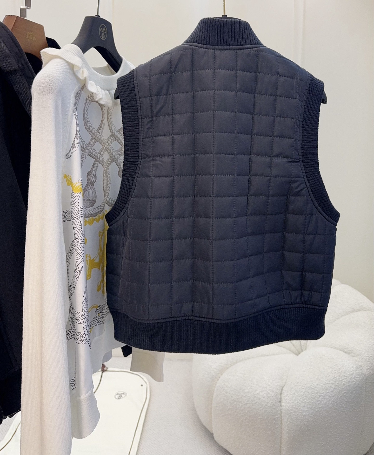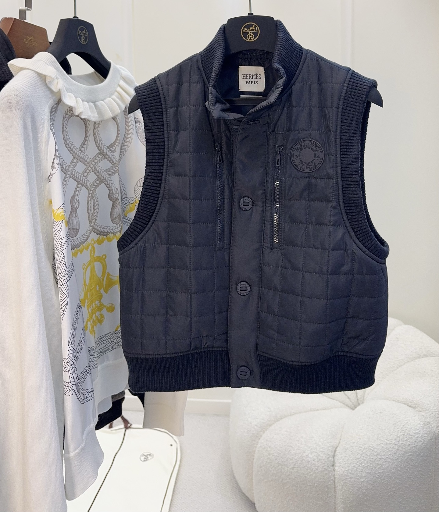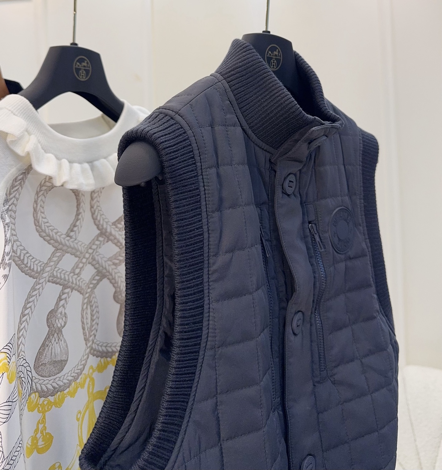 🆕🆕Hermes 2025 Autumn-Winter New Series Cotton Vest, Dark Navy Blue, High-End Quilting Craft, Cotton Filled, Warm and Lightweight, Ribbed Knit Collar and Cuffs, Full of Details, Front Button Closure, Easy to Wear and Take Off, Short Design, Petite-Friendly, Pairs Well with Knit Cardigans or Short Sleeves, Can Be Worn from Early Autumn to Deep Winter~ Practical and Stylish, It is an Essential Versatile Item for the Autumn-Winter Wardrobe!