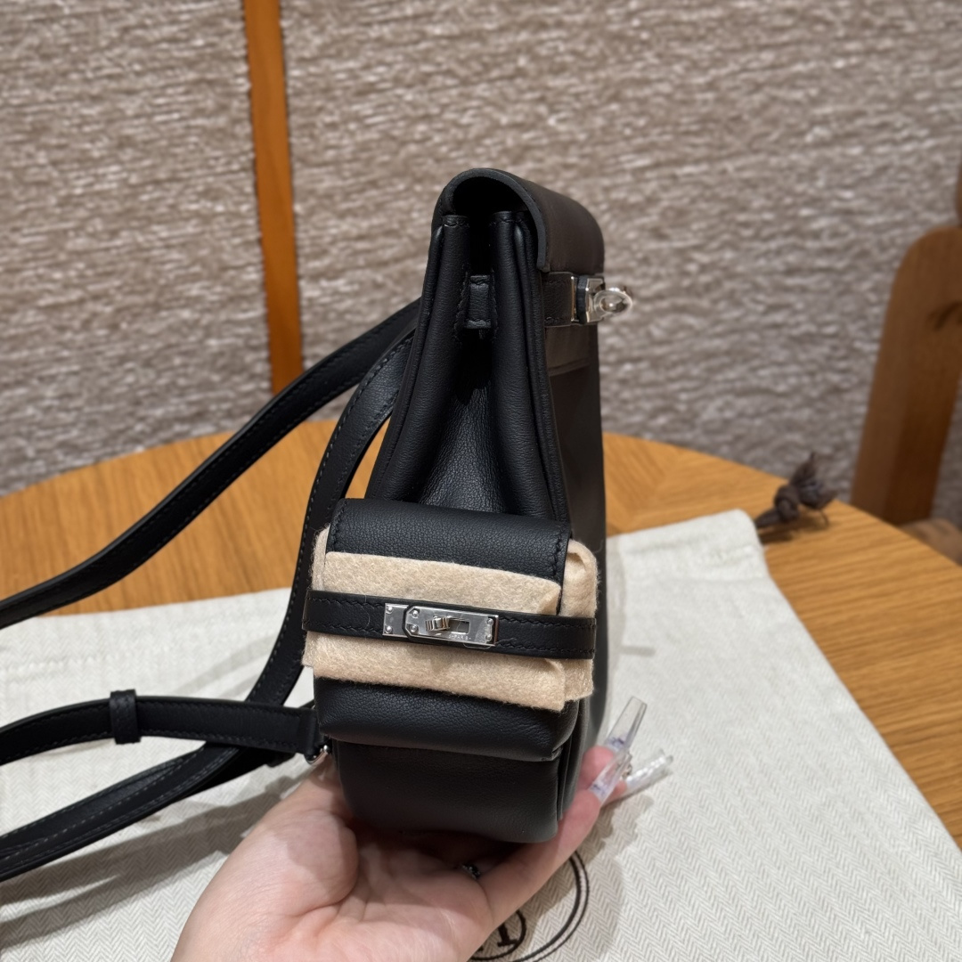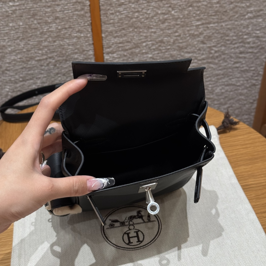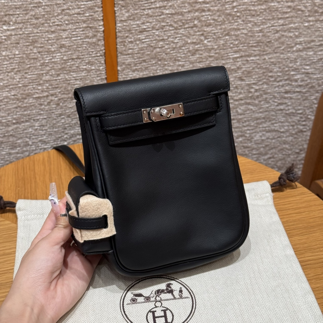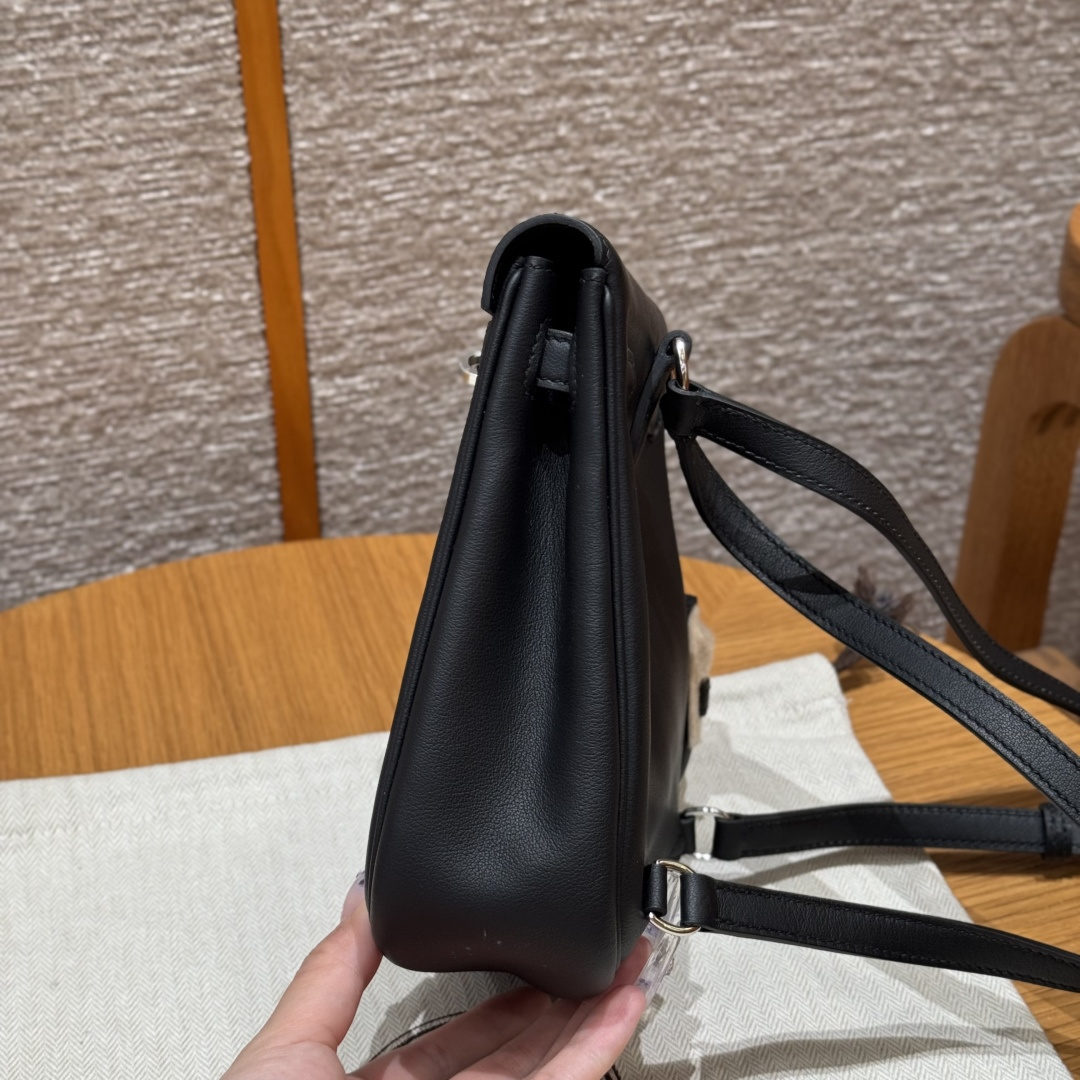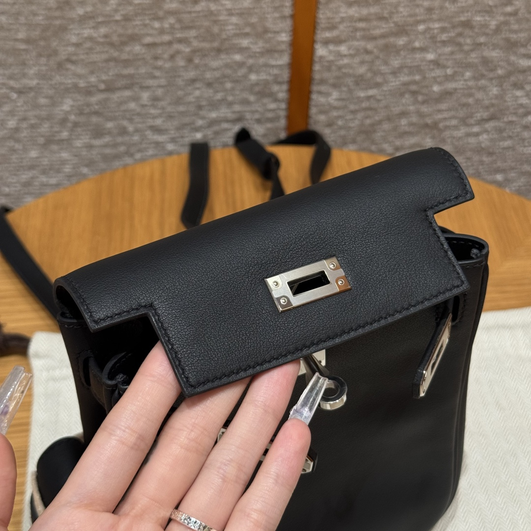 New Kelly backpack 18cm, black, plain grain leather, original French imported cowhide, silver clasp, high-end fully handcrafted exclusive customization.