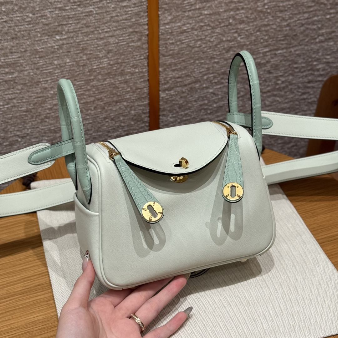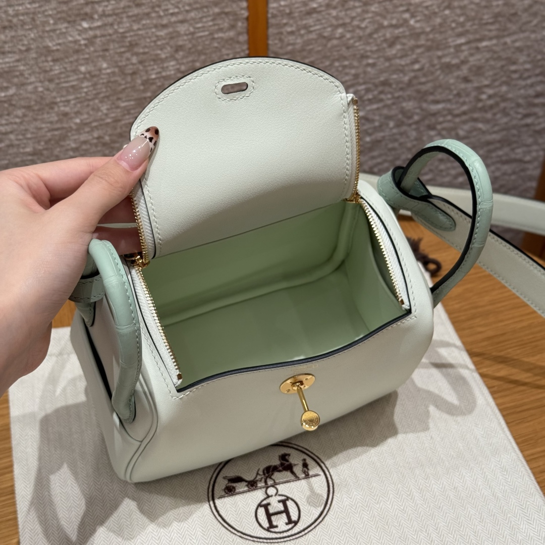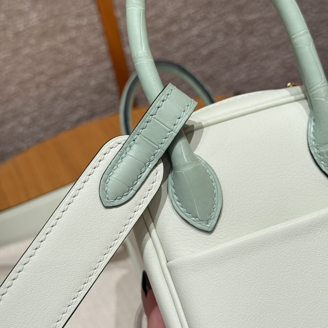 Mini Lindy, bubble green with mint green, imported French original plain leather, combined with matte American alligator originally from Mississippi, gold buckle, advanced full manual exclusive customization.