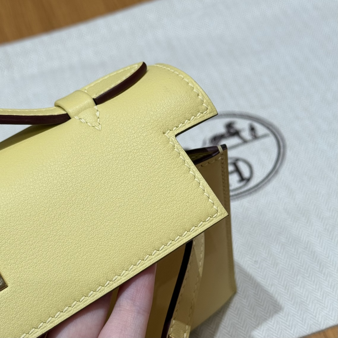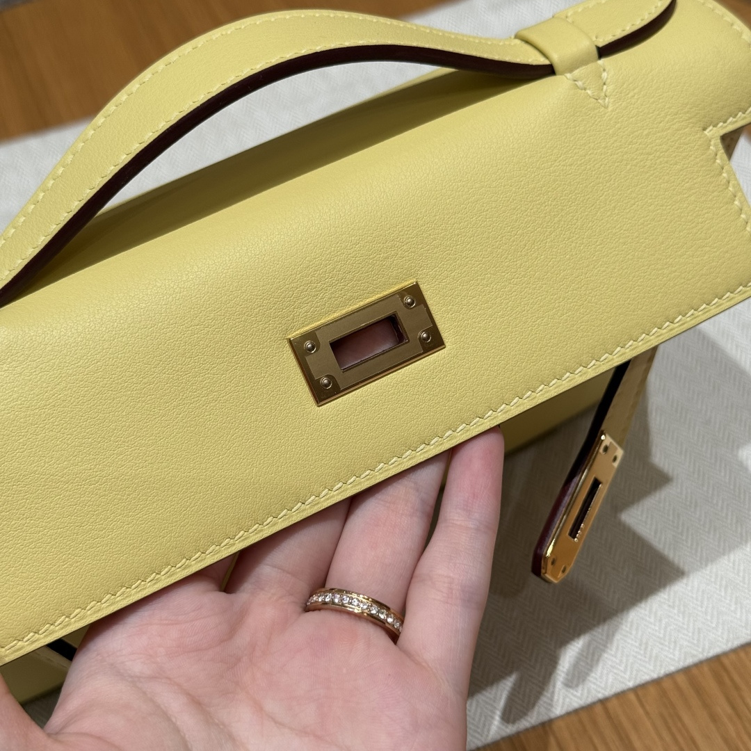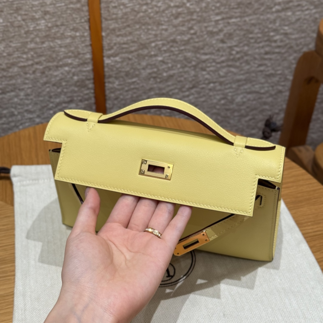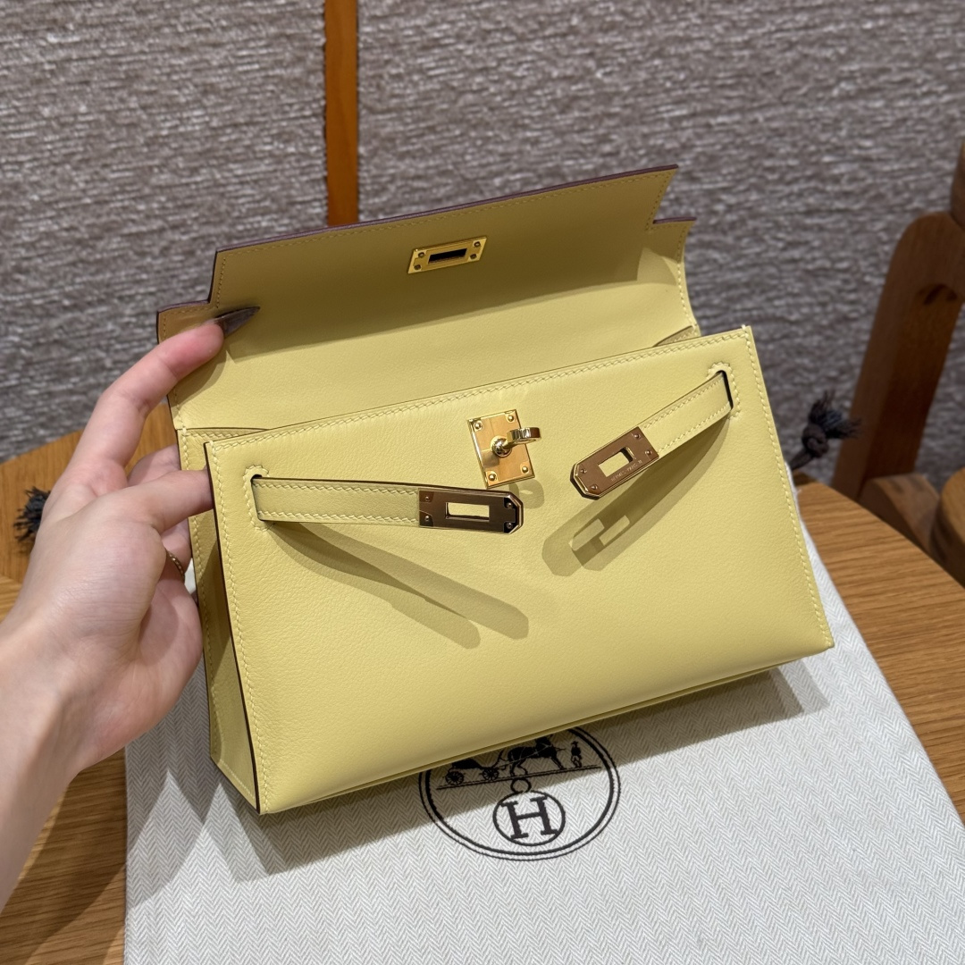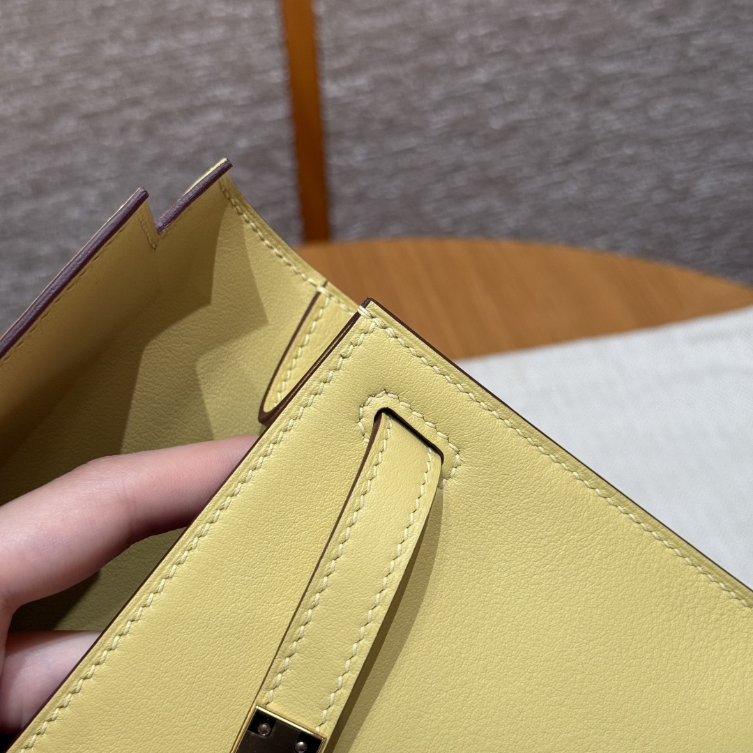 Mini Kelly first generation, chick yellow, plain grain leather, imported original French cowhide, gold clasp, high-end fully handcrafted exclusive customization.