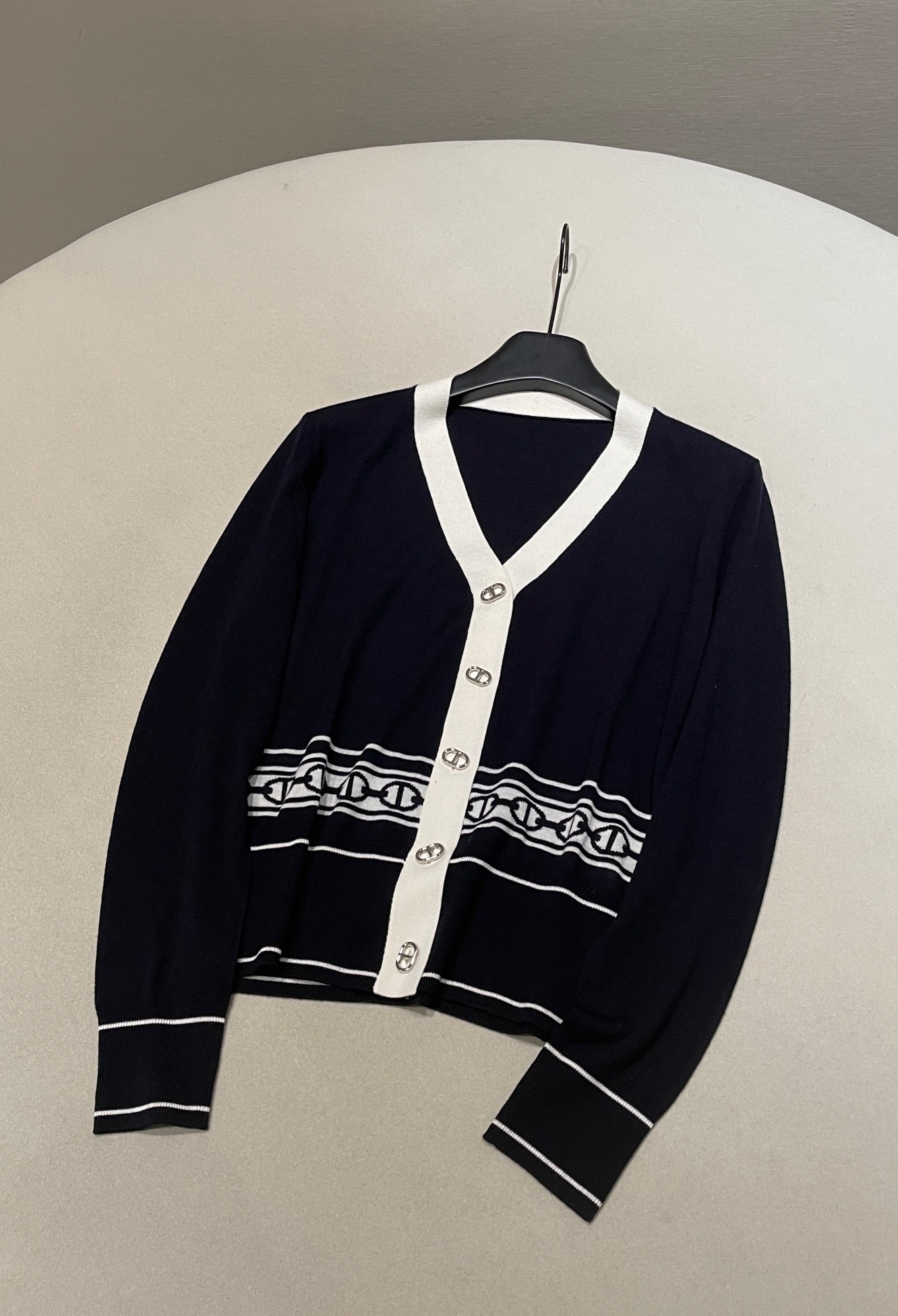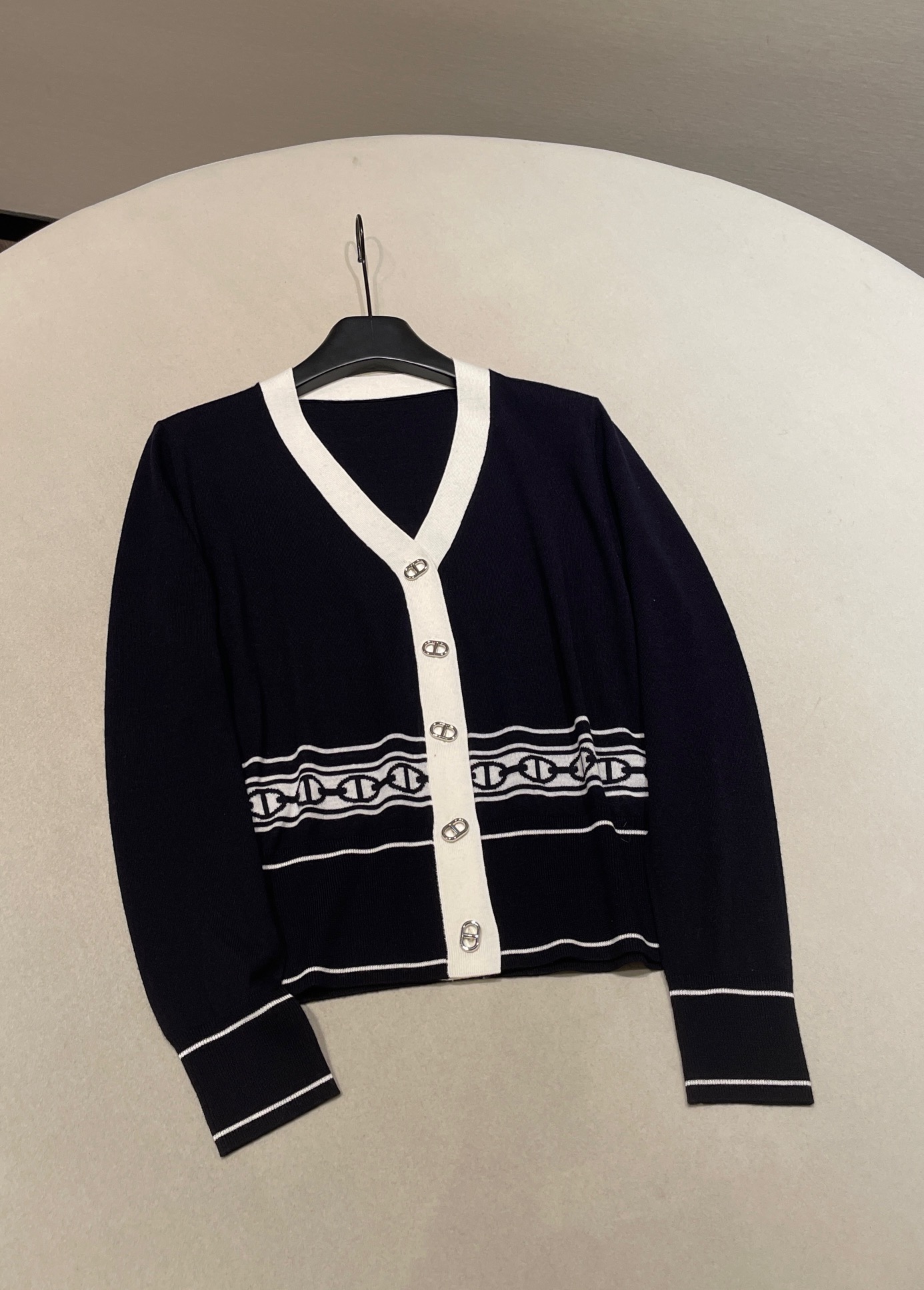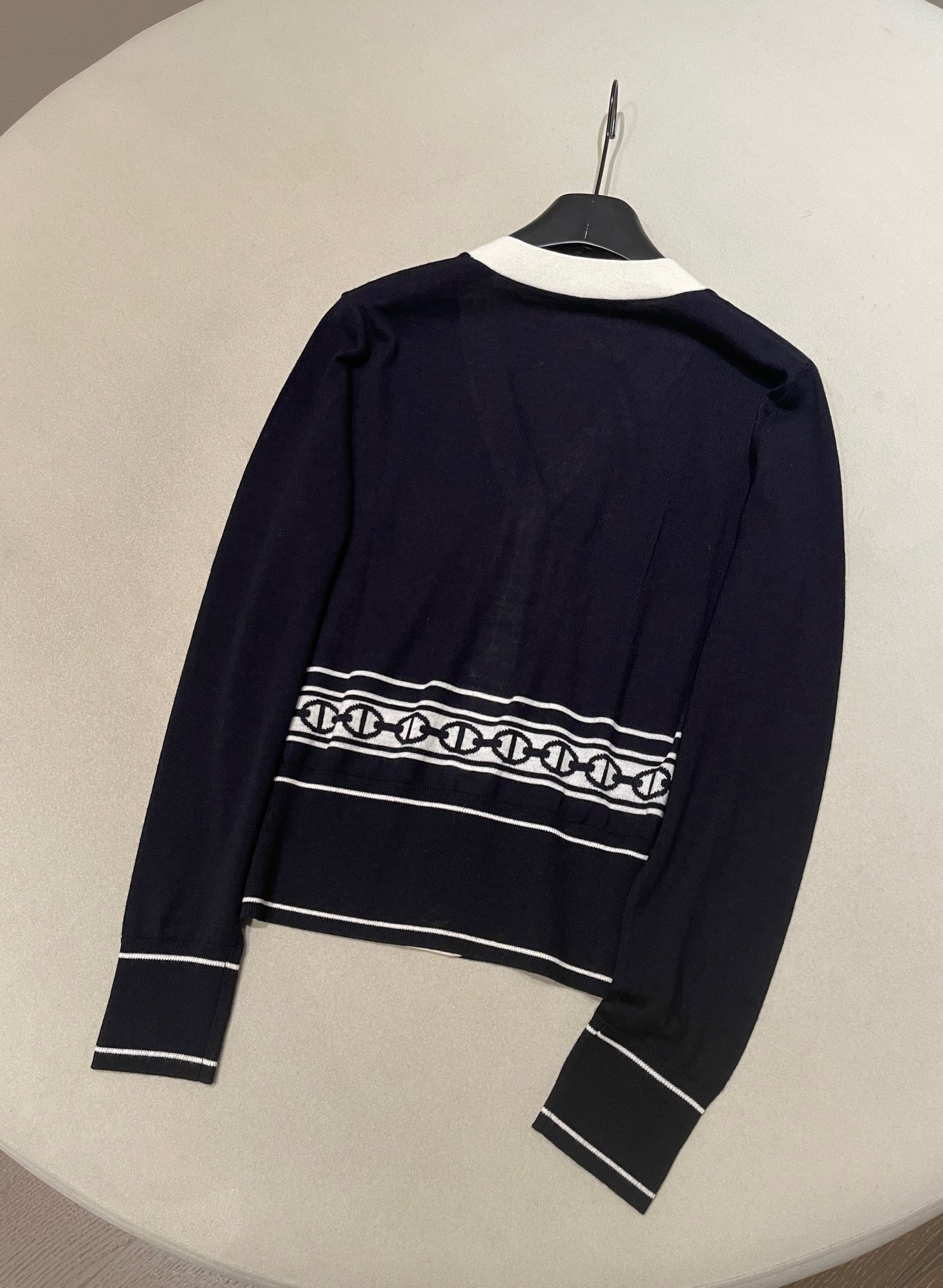 The deep navy blue and pure beige collide, creating a classic French elegant color scheme. The V-neck design creates a "swan neck" visual effect. The brand's iconic chain jacquard pattern at the waist is a poetic homage to equestrian culture, with every detail engraved with the brand's century-long heritage of exquisite craftsmanship. The pig nose buckle decoration highlights the brand's identity. Made from selected high-count wool, it offers a soft touch and feels comfortable against the skin without any pressure. It can be worn alone in spring and autumn to create elegant layers, or used as an inner layer in winter, providing a delicate base for luxurious coats, allowing warmth and a sense of sophistication to coexist.