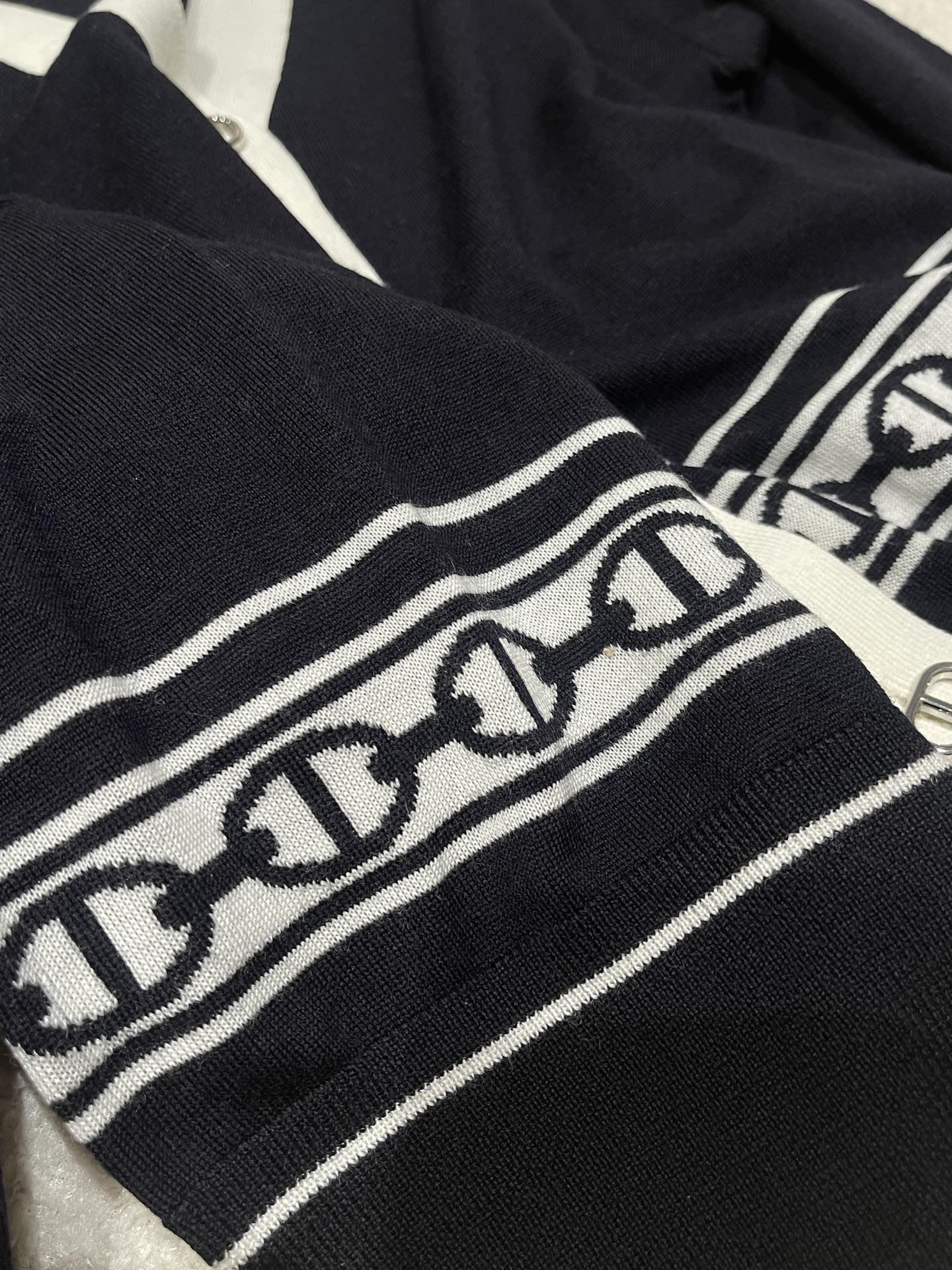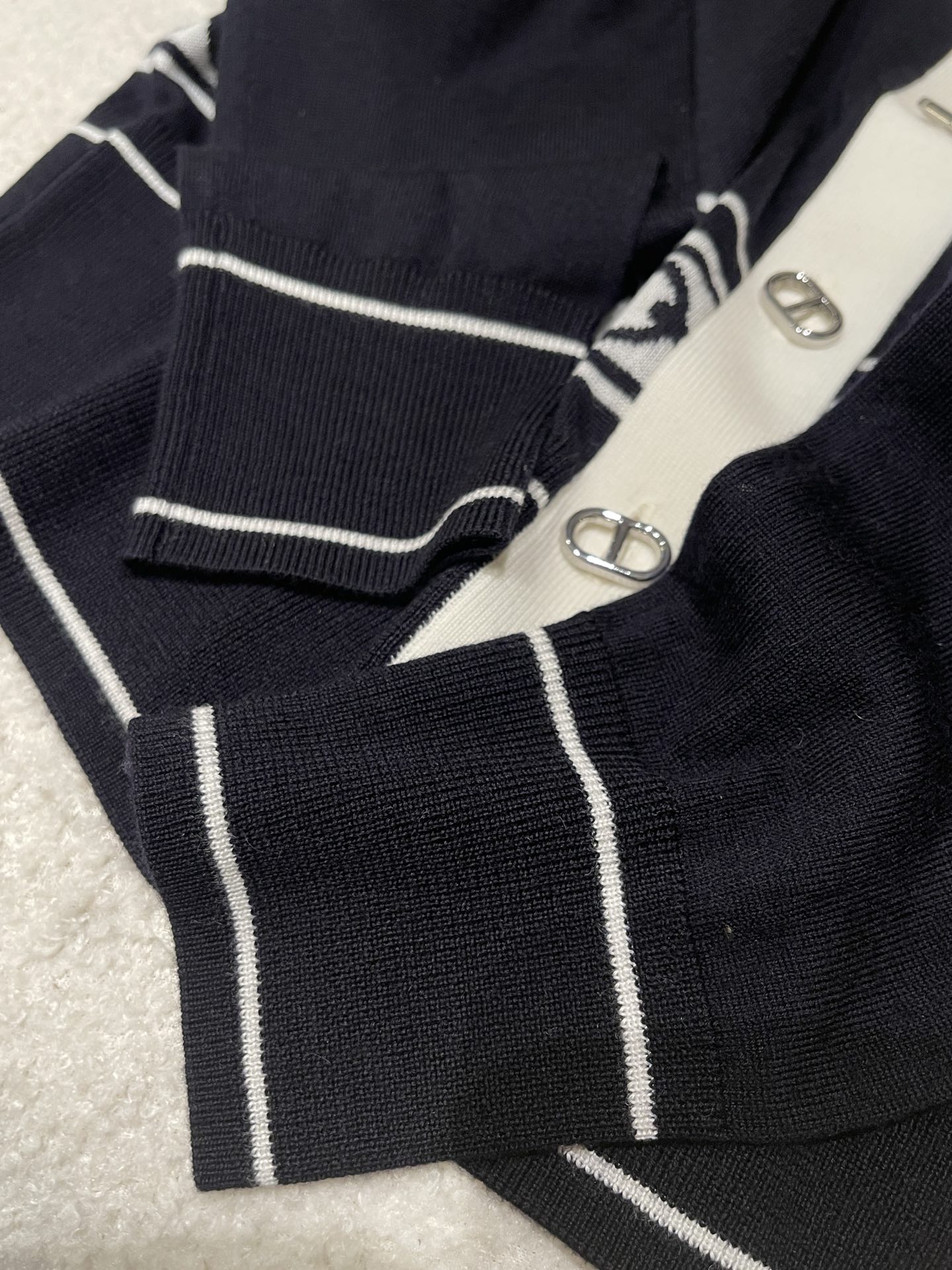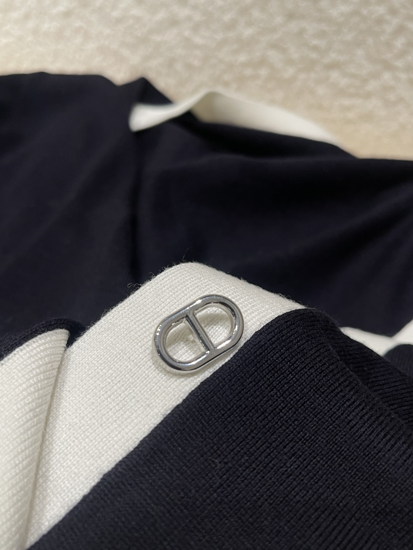 The deep navy blue and pure beige collide, creating a classic French elegant color scheme. The V-neck design creates a "swan neck" visual effect. The brand's iconic chain jacquard pattern at the waist is a poetic homage to equestrian culture, with every detail engraved with the brand's century-long heritage of exquisite craftsmanship. The pig nose buckle decoration highlights the brand's identity. Made from selected high-count wool, it offers a soft touch and feels comfortable against the skin without any pressure. It can be worn alone in spring and autumn to create elegant layers, or used as an inner layer in winter, providing a delicate base for luxurious coats, allowing warmth and a sense of sophistication to coexist.