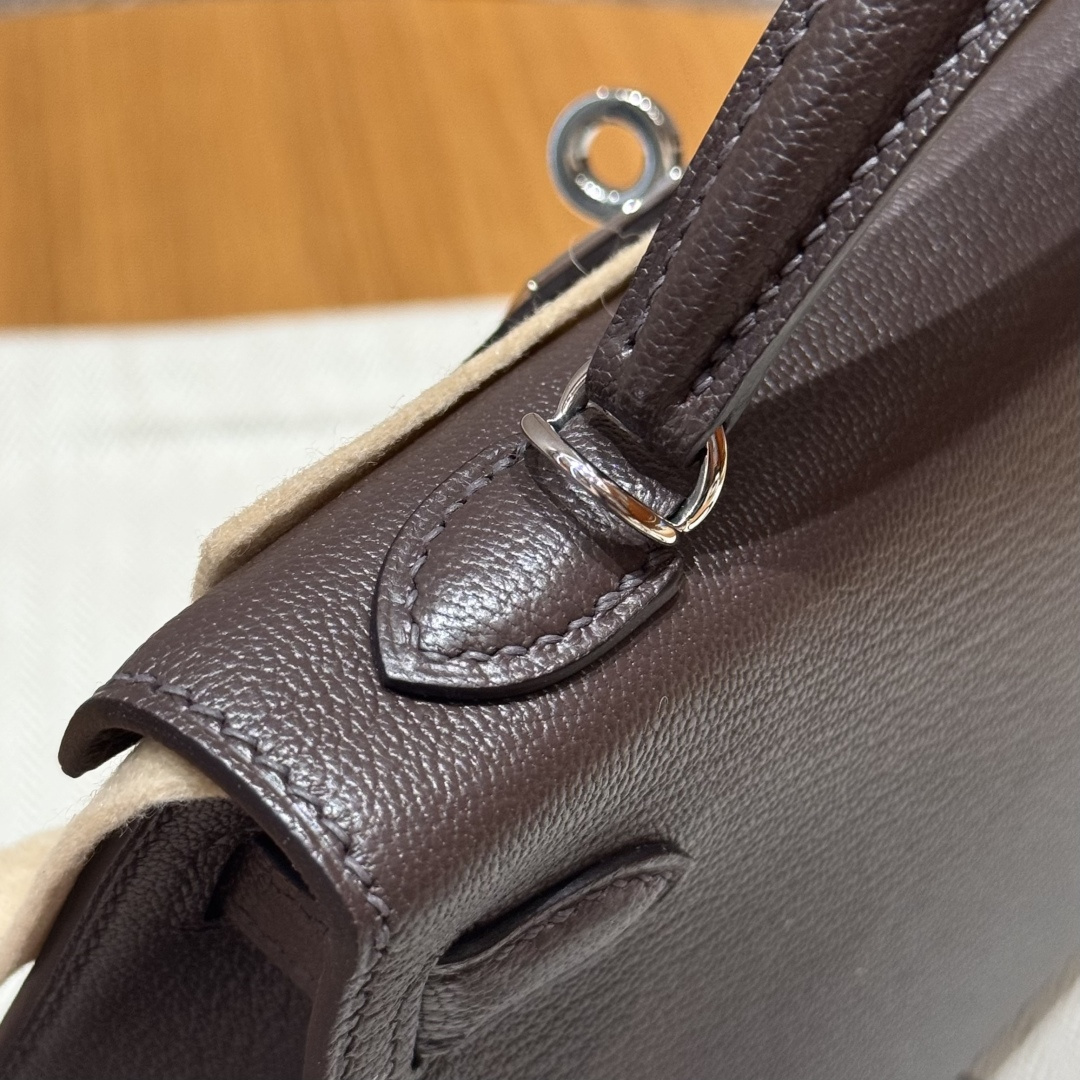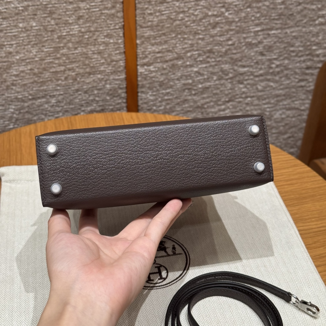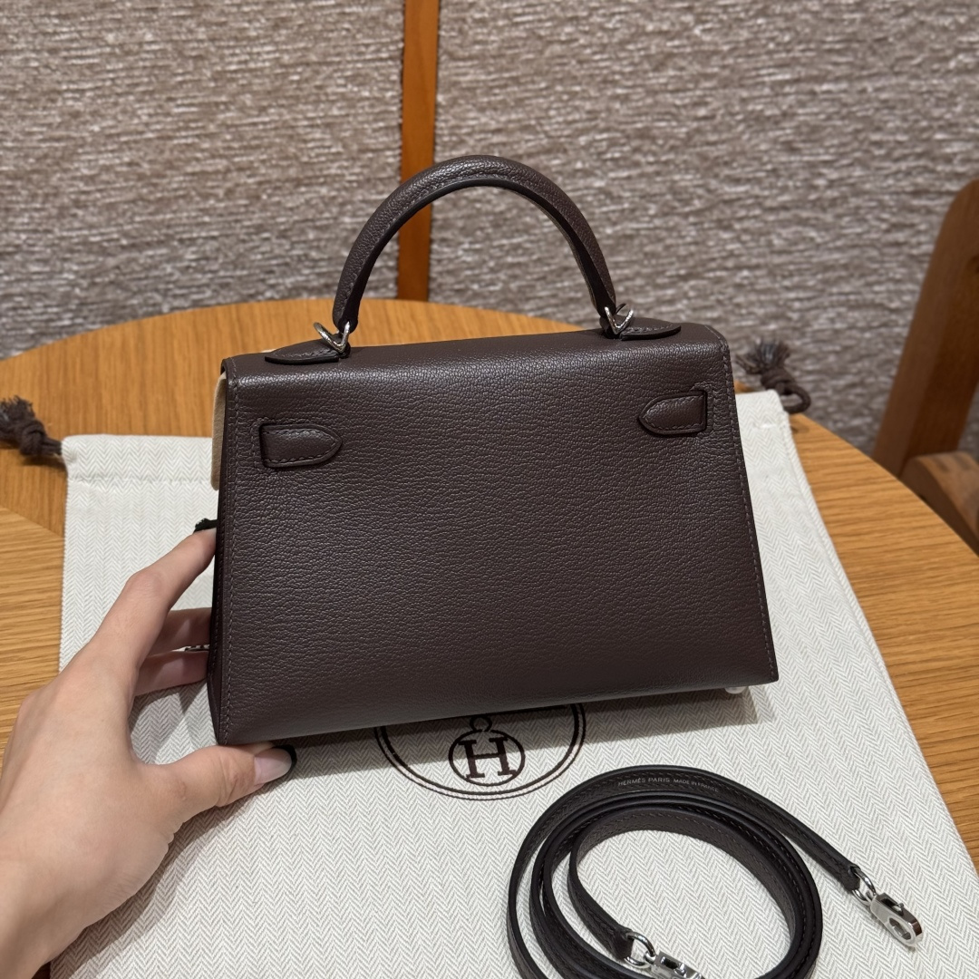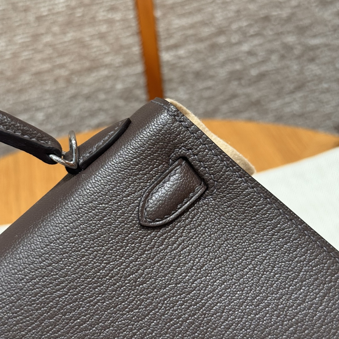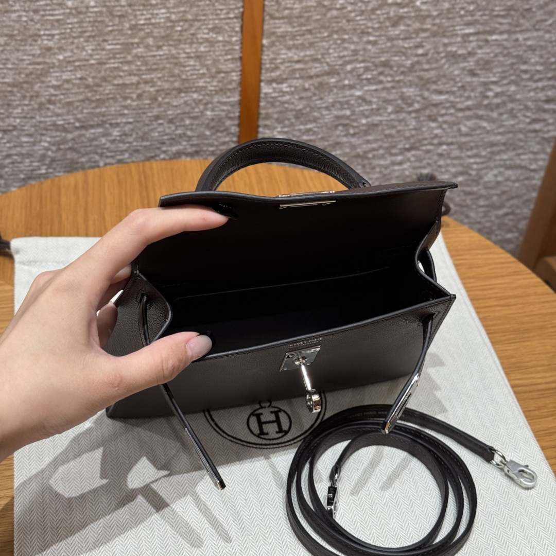 Mini Kelly II, ebony color, imported French goat leather, silver clasp, high-end fully handcrafted exclusive customization.