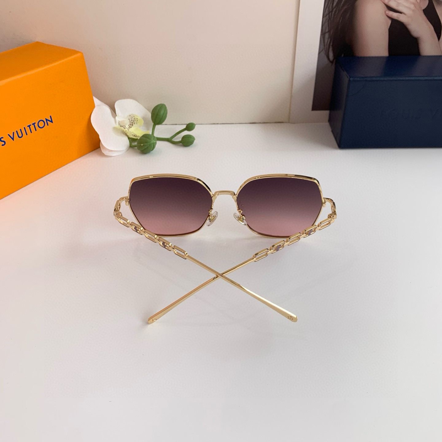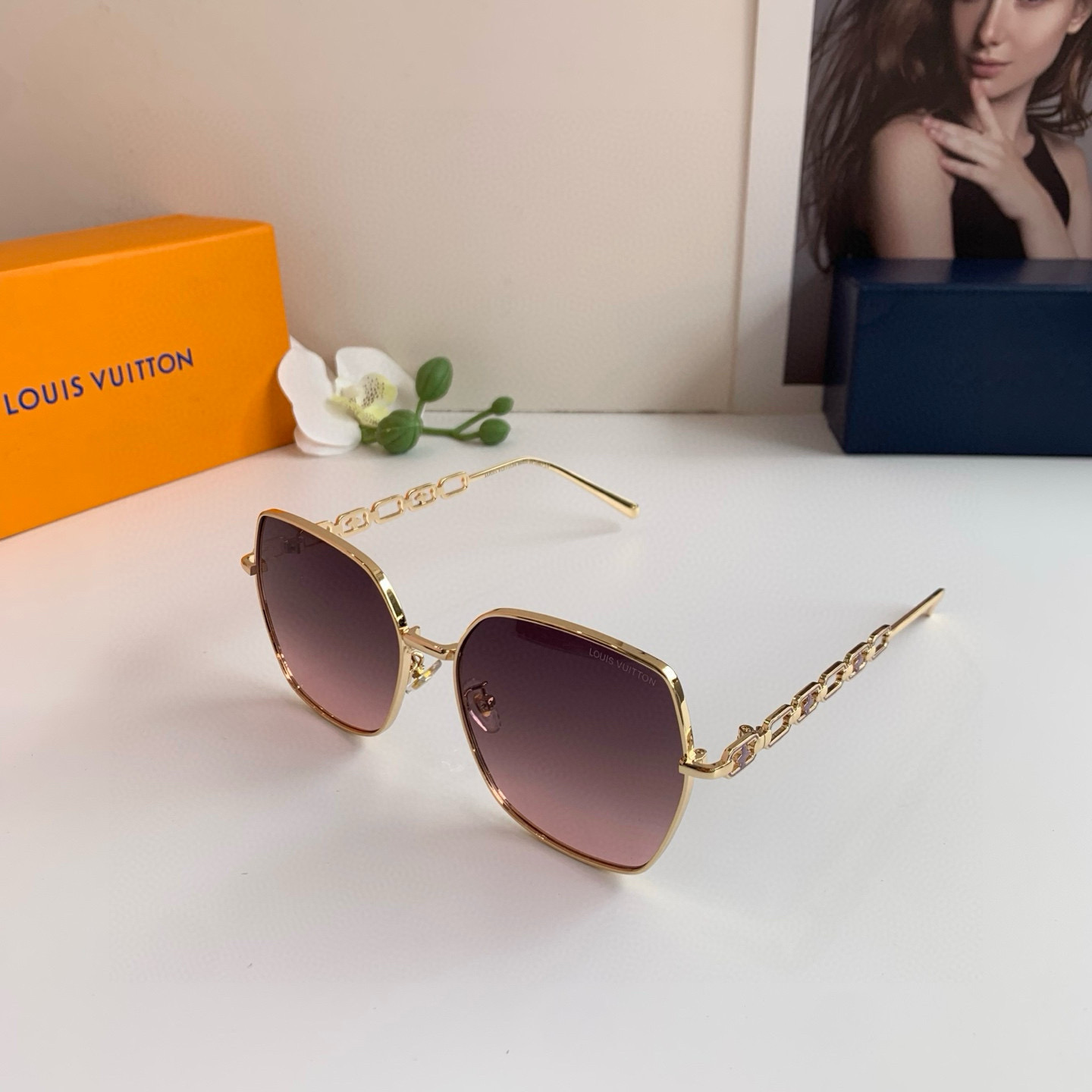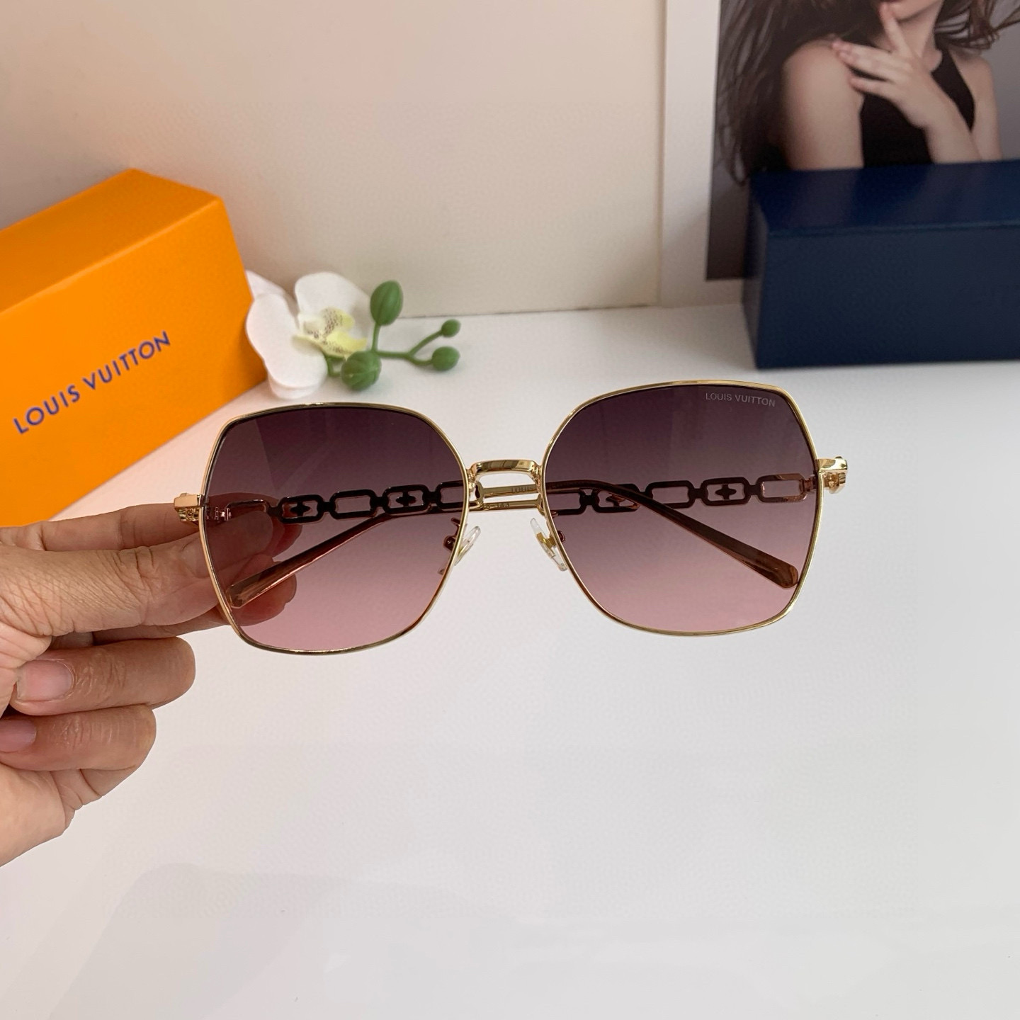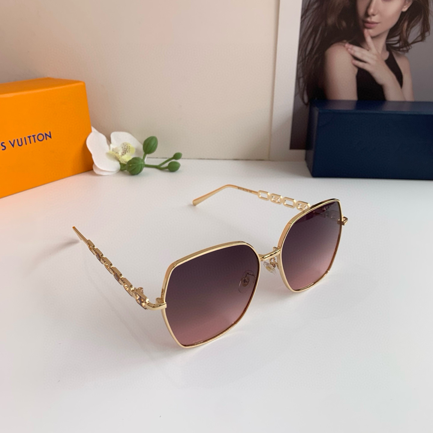 LV Louis Vuitton Korean version new chain temple rectangular frame sunglasses, internet-famous same-style sunglasses, fashionable, personalized, versatile trendy glasses!