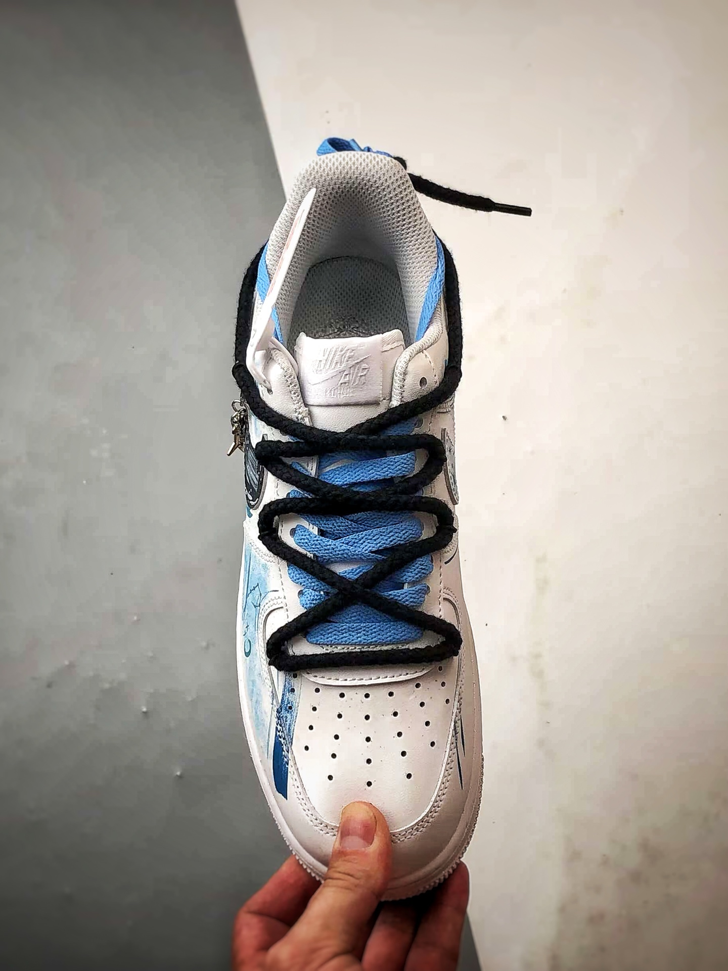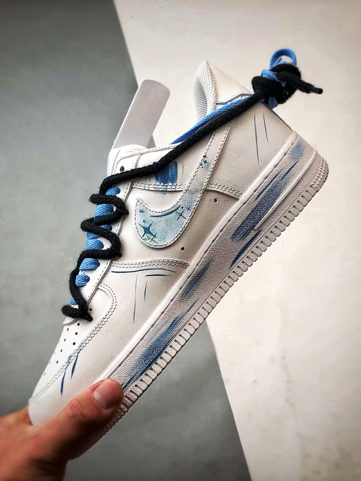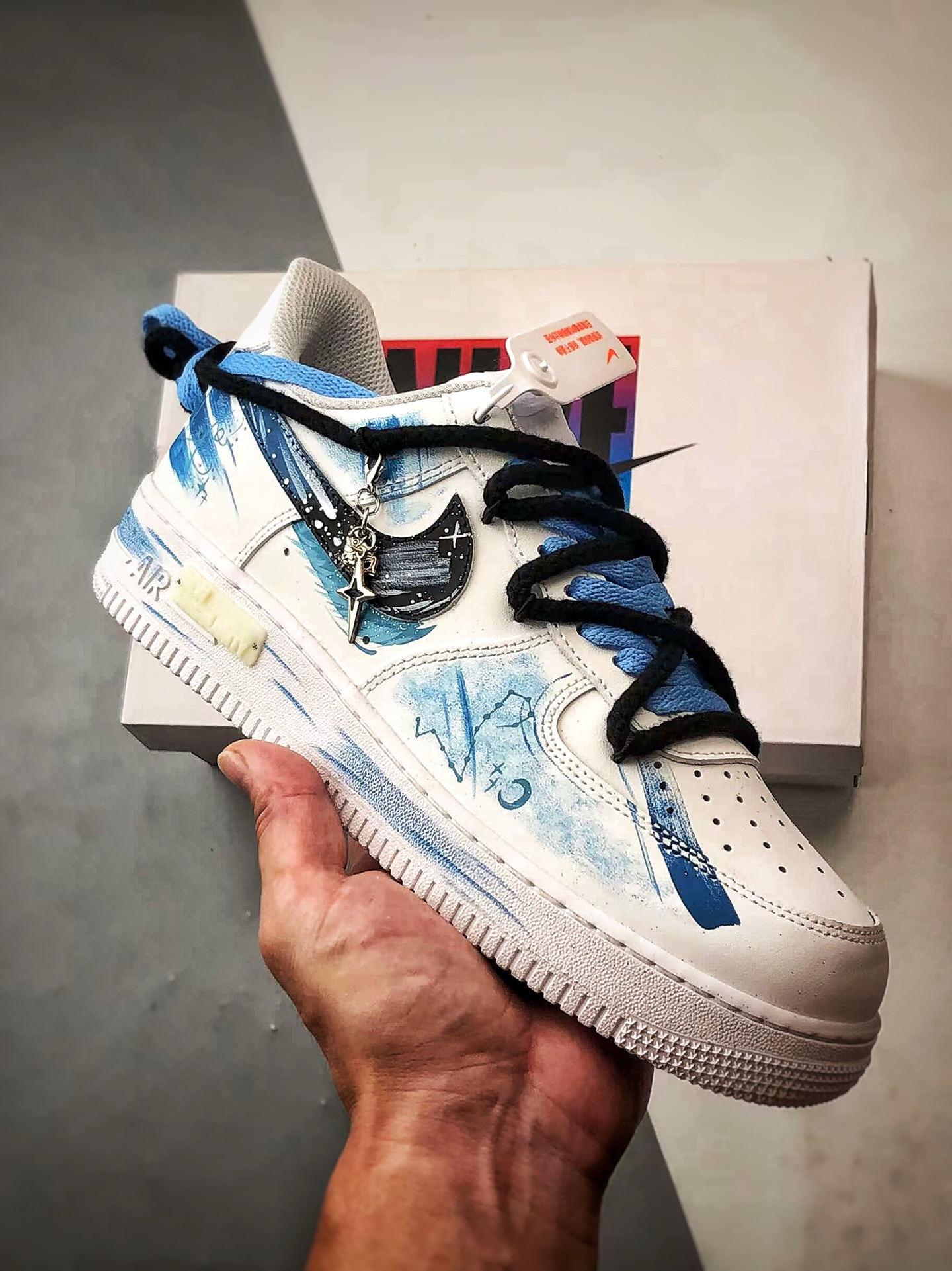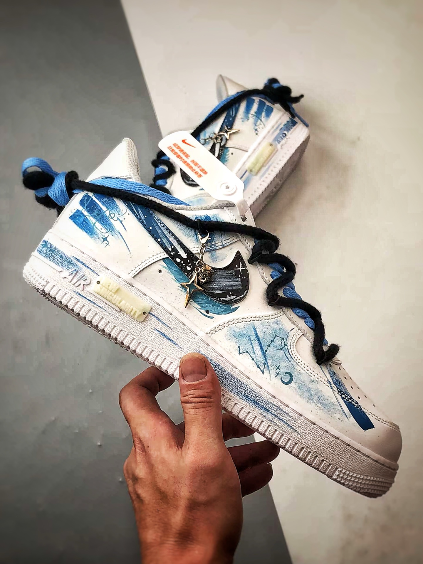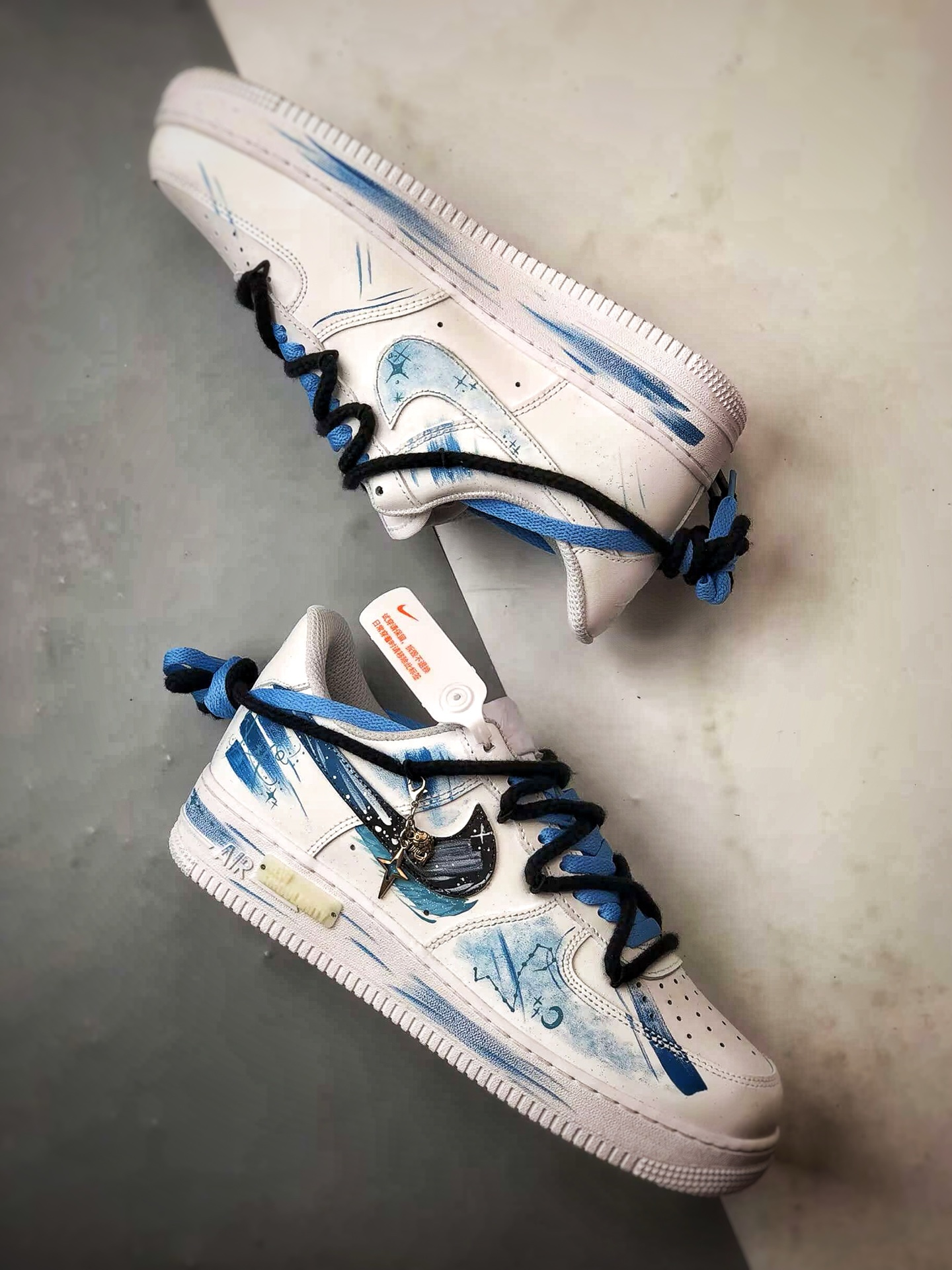 Featuring a dreamy blue and white color scheme, Pisces elements are integrated into hand-painted graffiti, making the shoe resemble a starry sea surface,灵动飘逸. The classic Swoosh is cleverly combined with zodiac symbols, paired with exquisite pendants, showcasing romantic ingenuity in the details. As a custom model, it is not only a trendy styling tool but also like a专属星海 created for Pisces, carrying a unique interpretation of zodiac culture, making every step feel like wandering in a starry sea,休闲又充满梦幻氛围