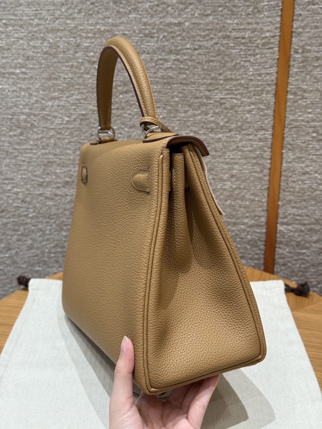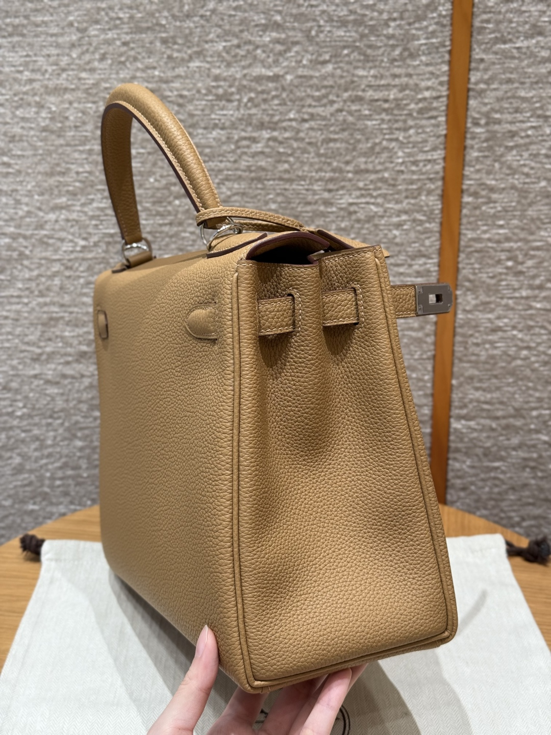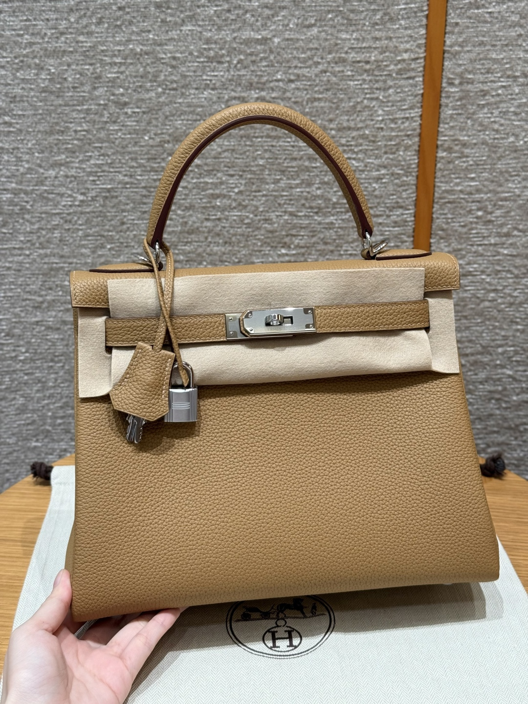 Kelly 28, biscuit color, imported cowhide from France, silver clasp, high-end fully handcrafted exclusive customization.