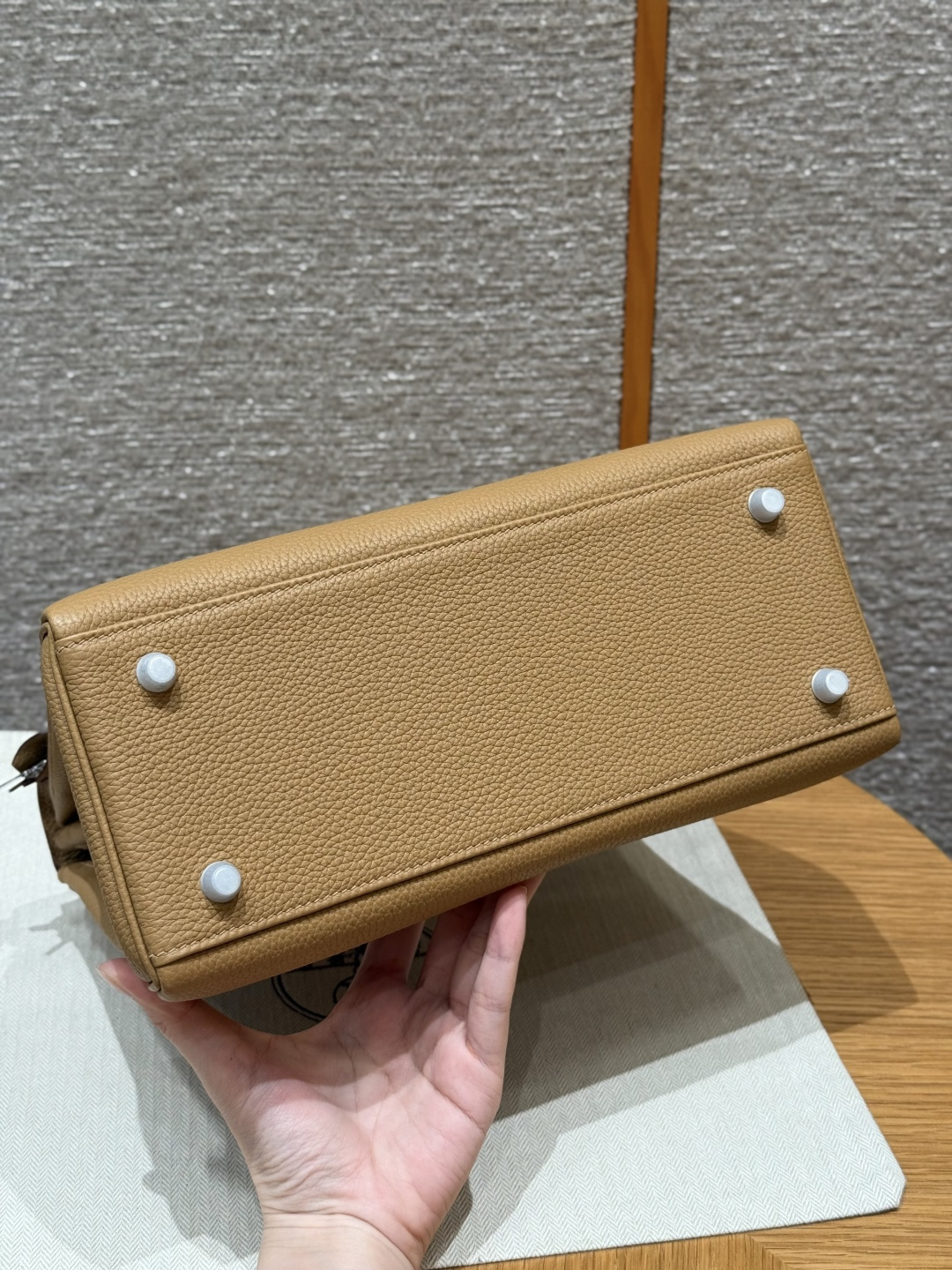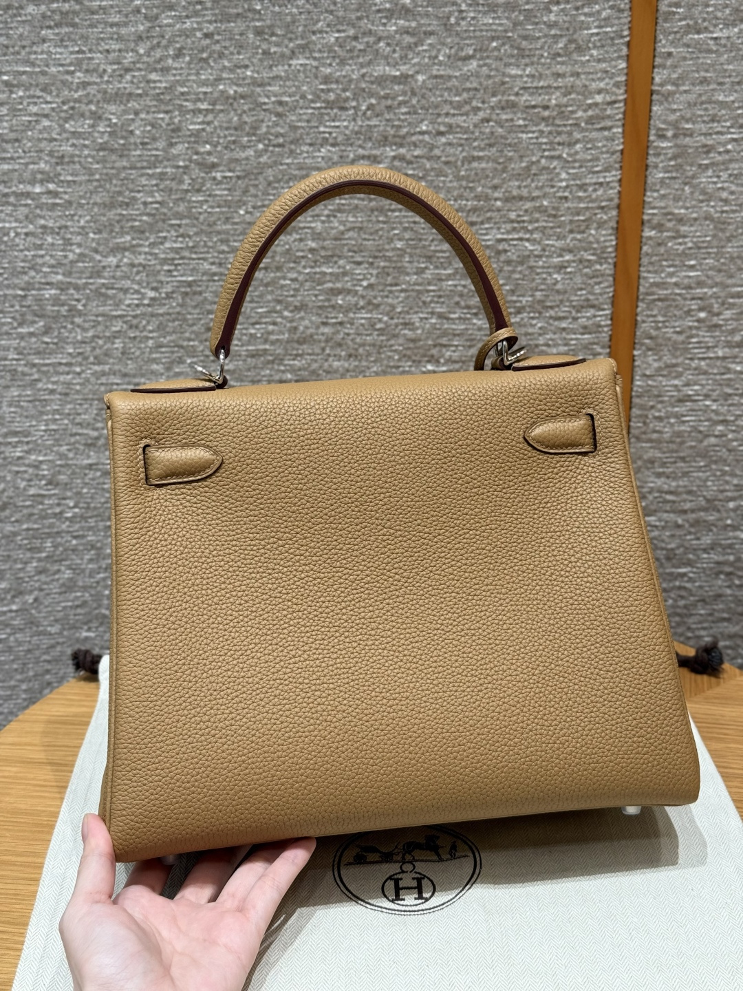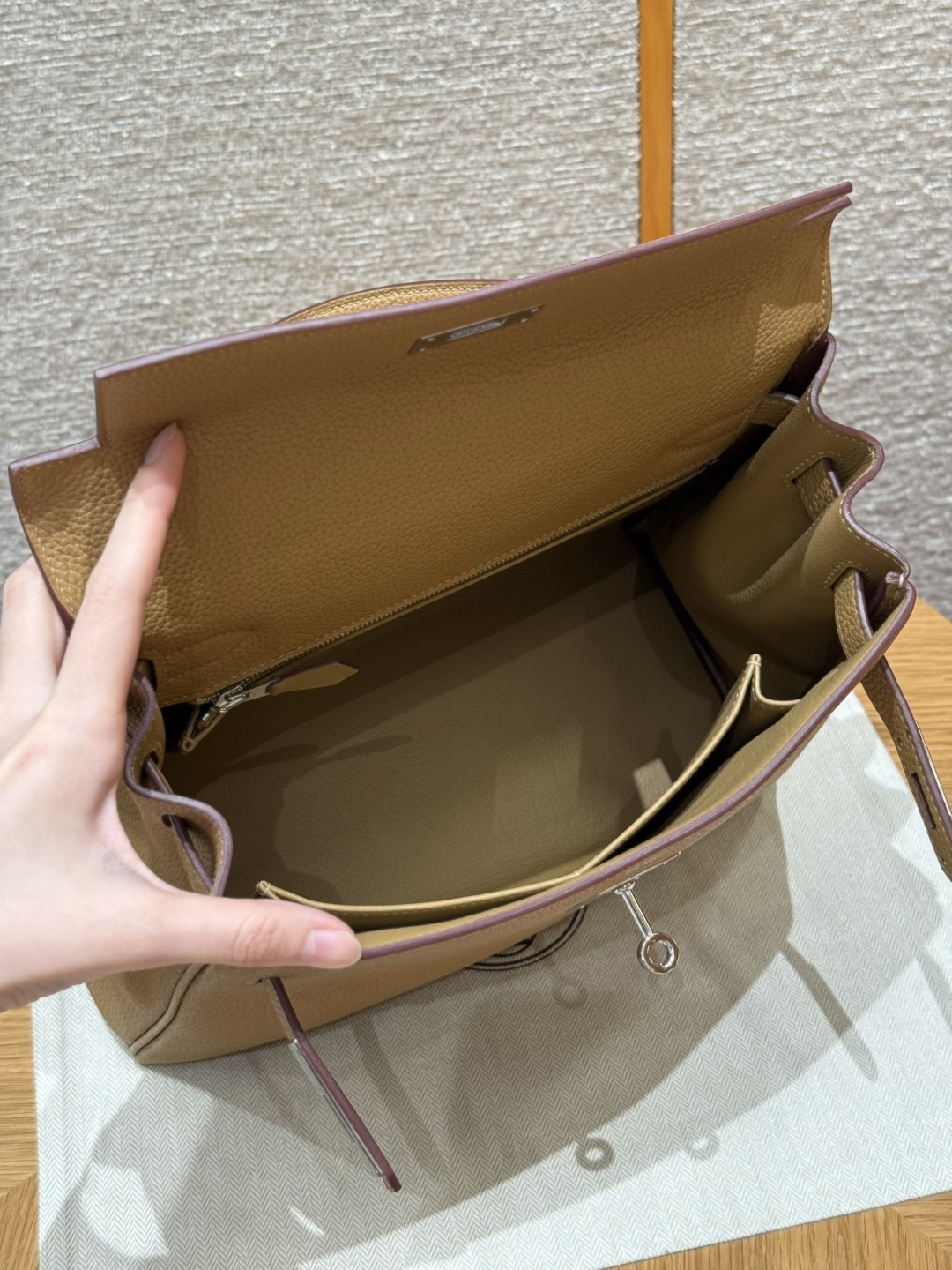 Kelly 28, biscuit color, imported cowhide from France, silver clasp, high-end fully handcrafted exclusive customization.