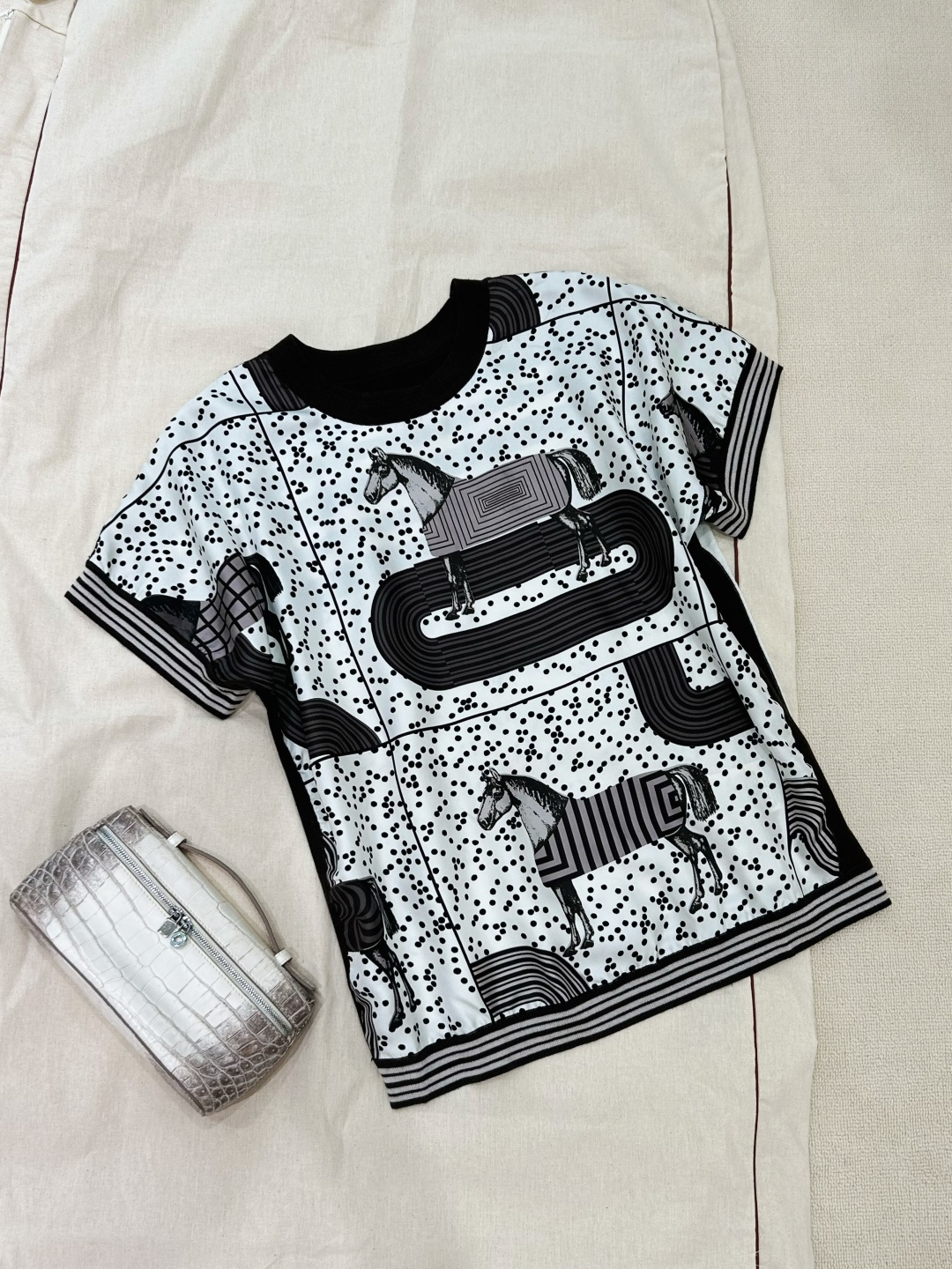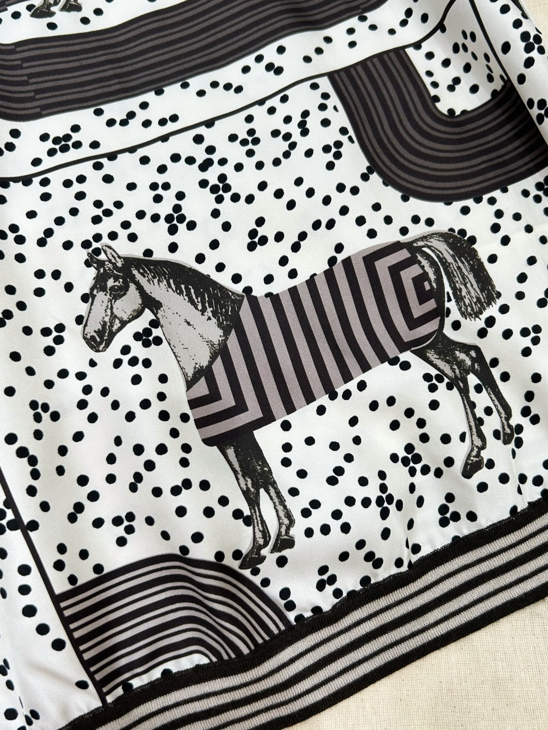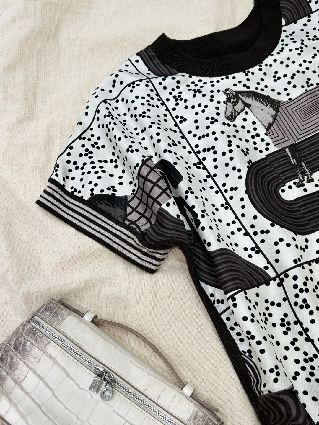 The front features a pop-style horse and polka dot print,