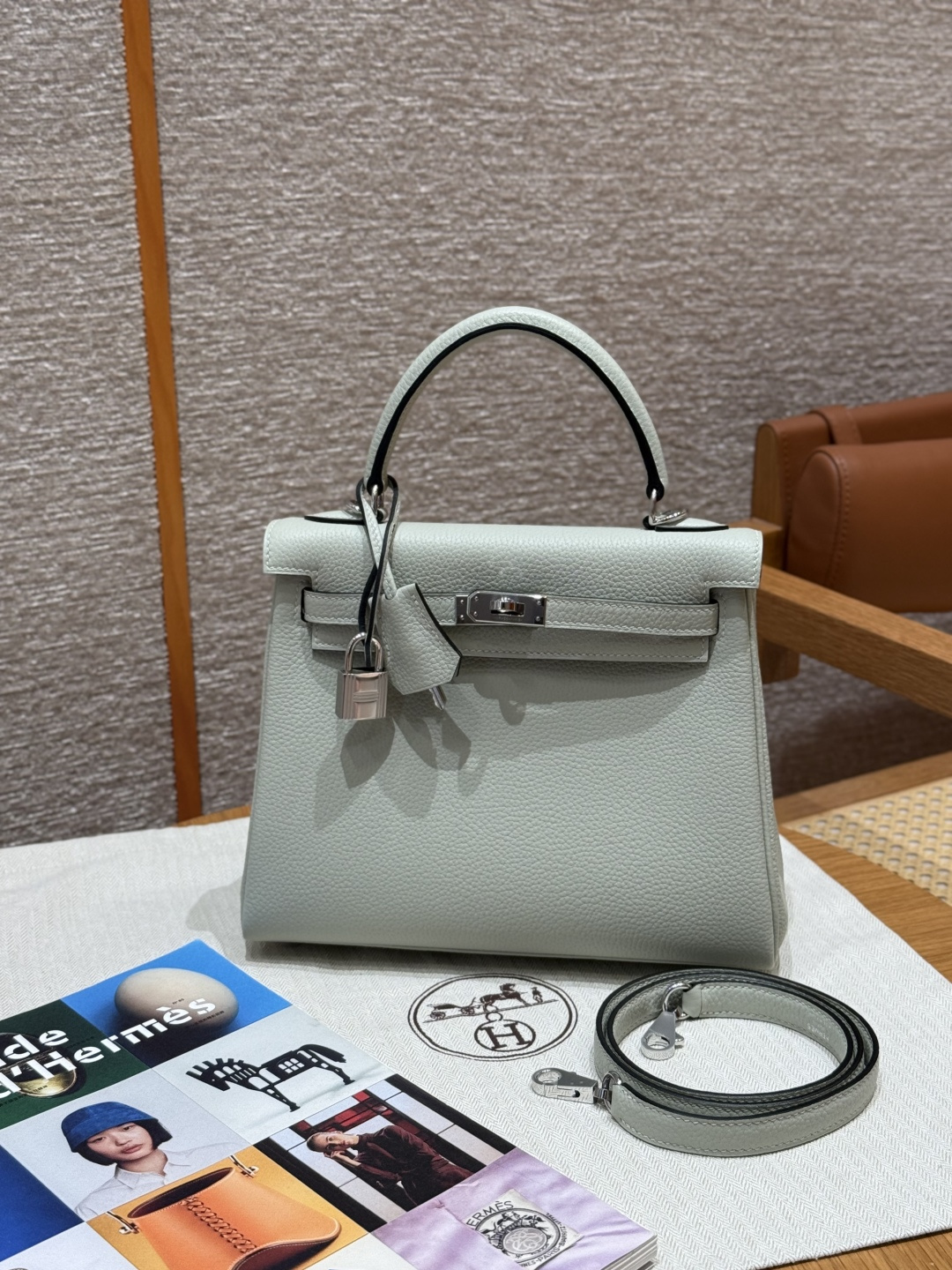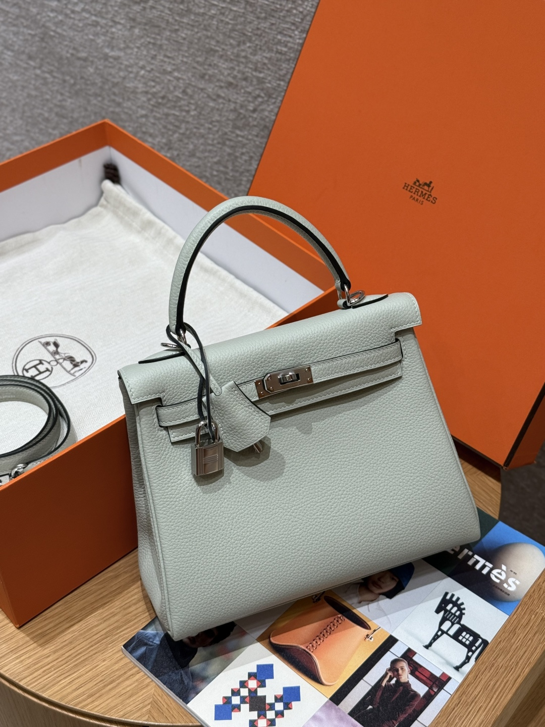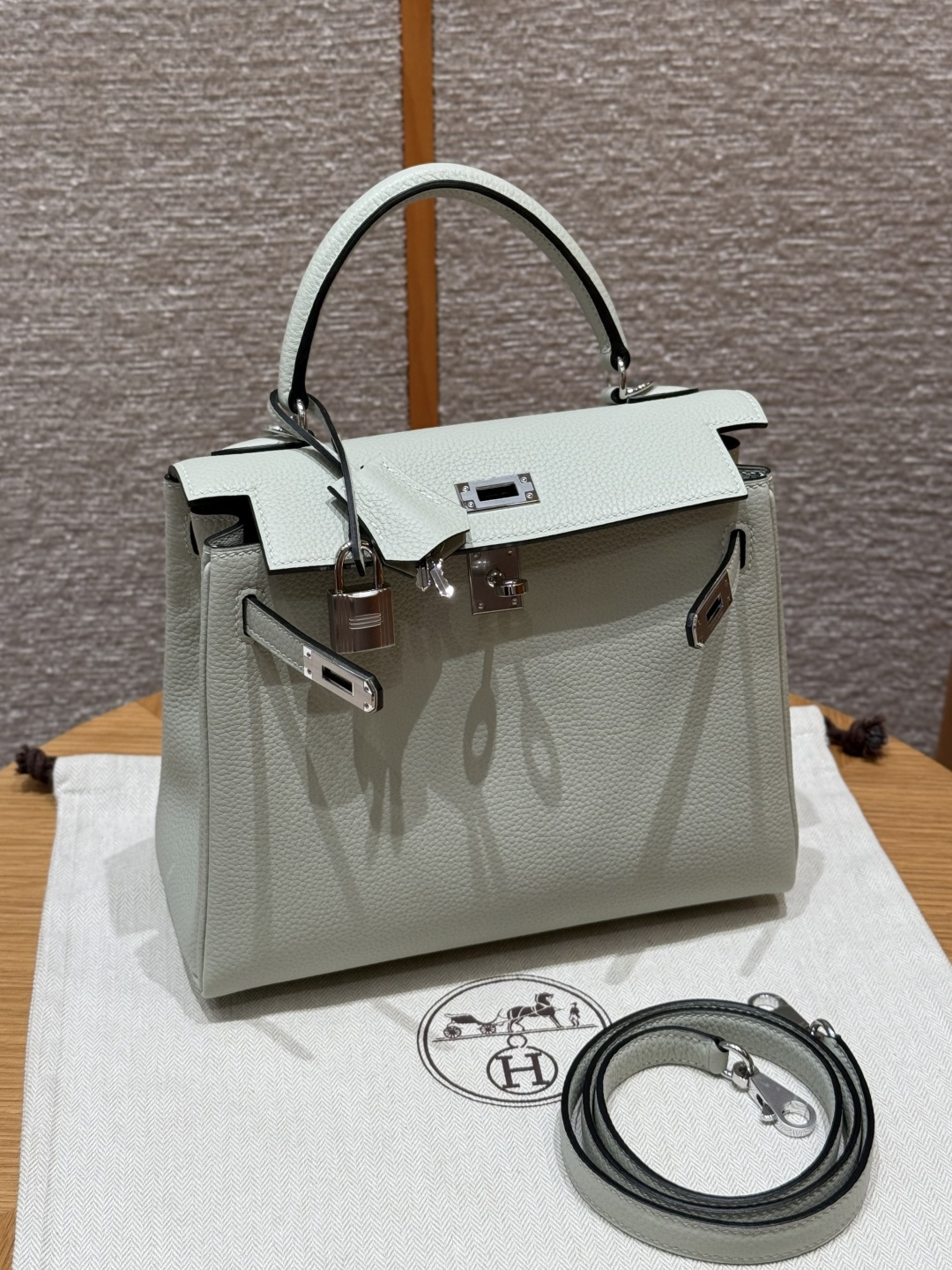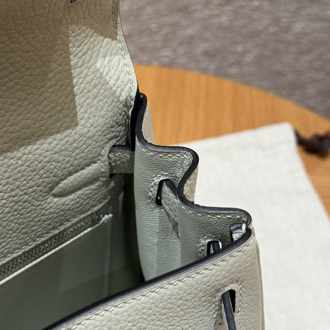 Kelly 25, ice crystal gray, imported French Togo cowhide, silver buckle, high-end fully handcrafted exclusive custom.