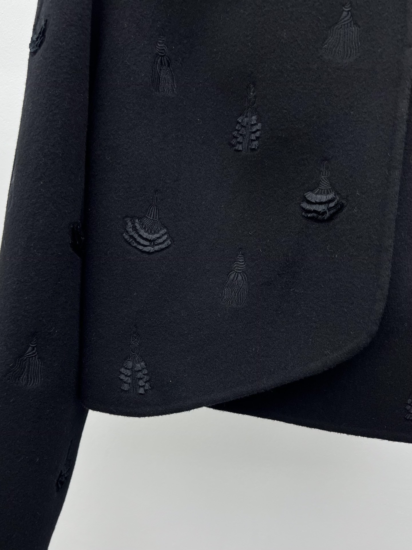 Adorned with three-dimensional embroidered flowers and tassels throughout
