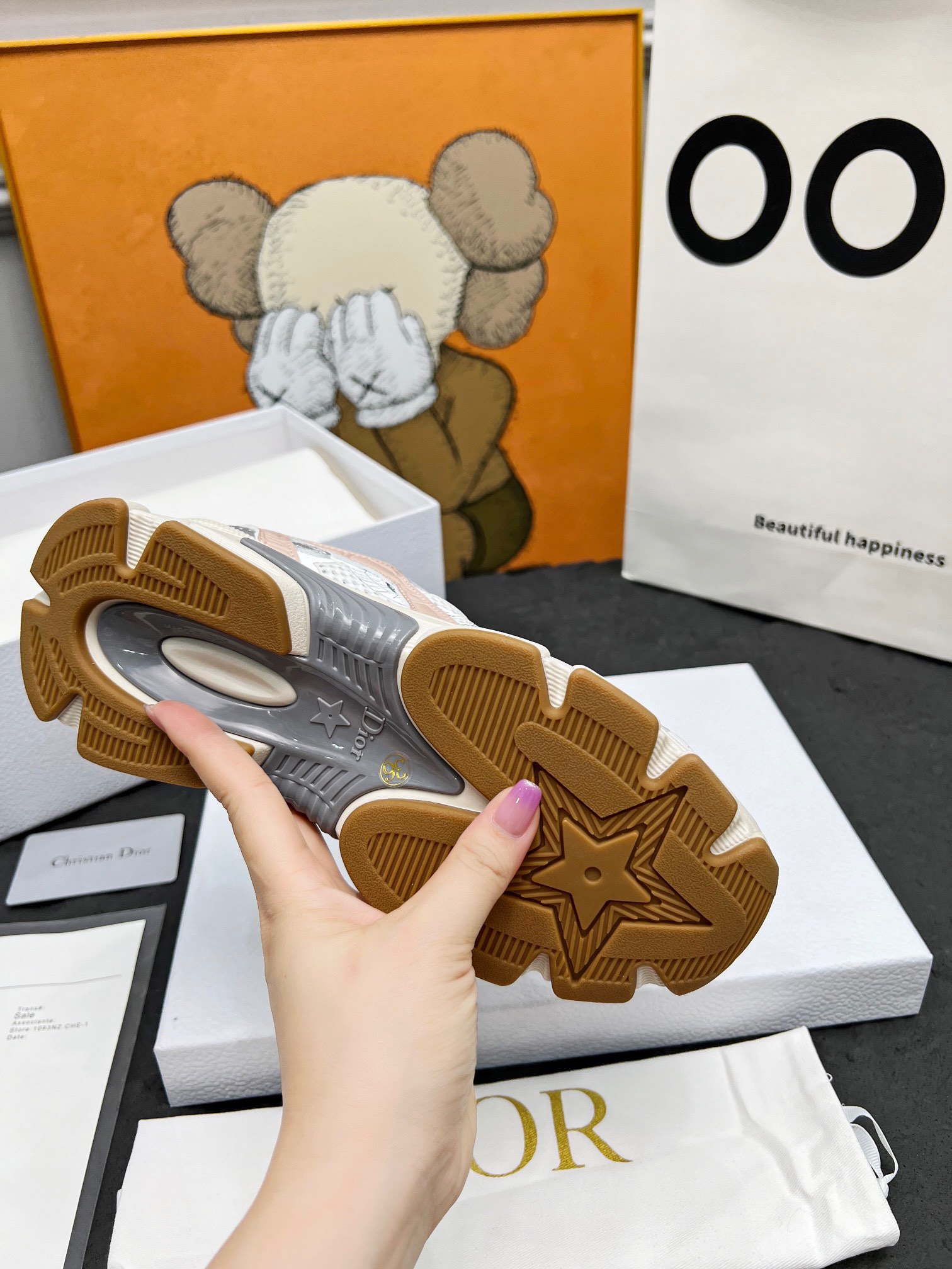 This Dior Chrono sneaker is a new release for the Fall/Winter 2024 collection, reinterpreting running shoes with Dior's haute couture style. It features white mesh fabric combined with nude and silver-toned laminated leather-effect panels. Details such as the CD logo on the sides, the star patch on the tongue, and the Dior logo on the heel highlight its elegance. The sneaker comes with dual-color laces and a lightweight sole adorned with star decorations, making it suitable for creating casual looks all year round.