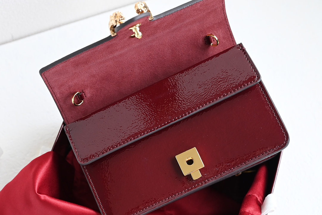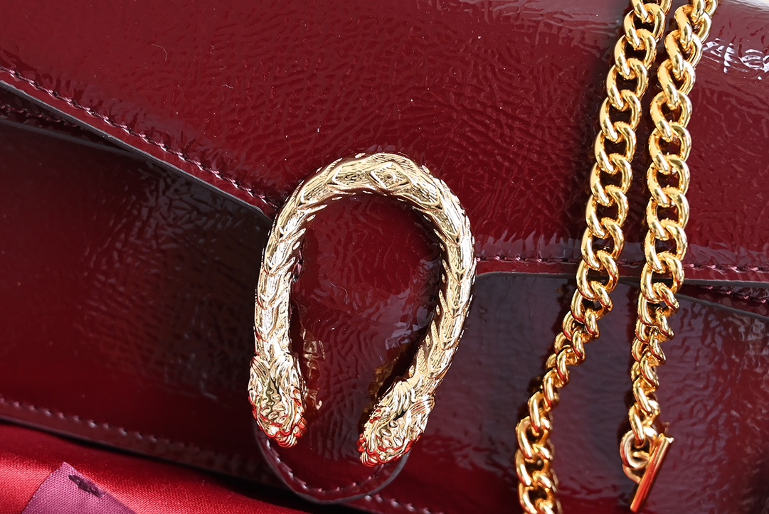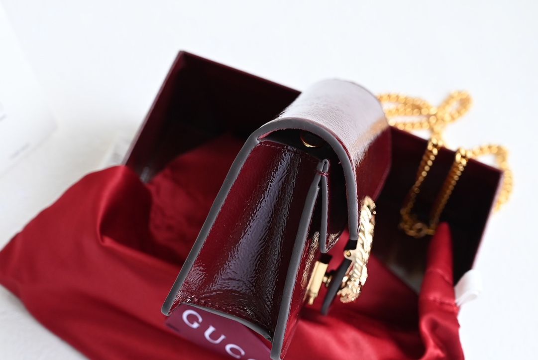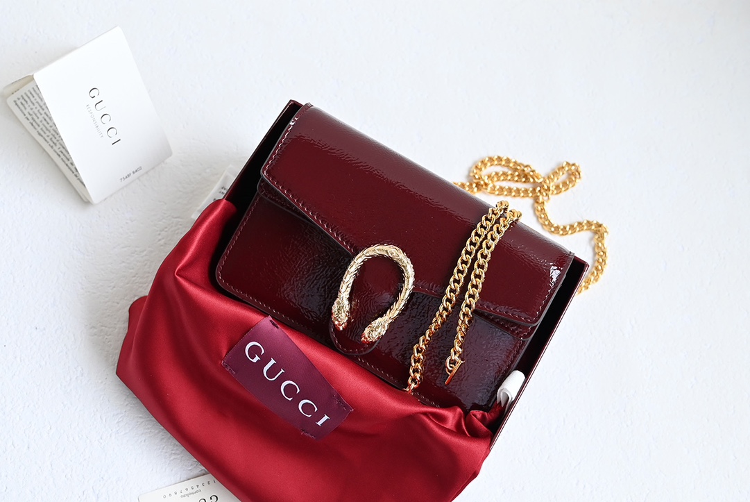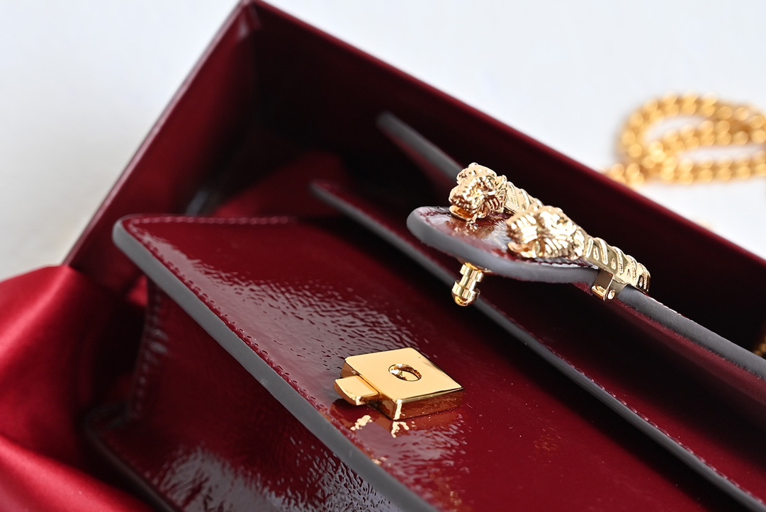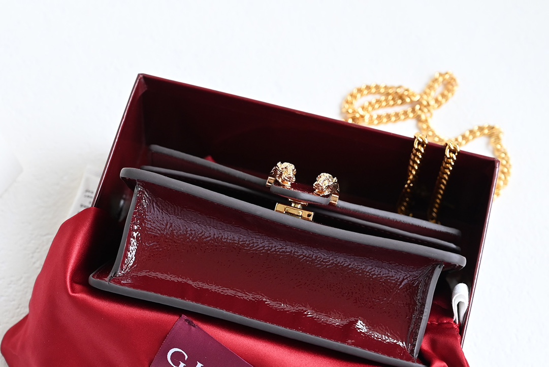 [New Product] Dionysus Series Super Mini Handbag. The classic Rosso Ancora black glossy patent leather material brings a fresh twist to the structured design of the Dionysus series, complementing the light gold-toned iconic tiger head accent and highlighting a contrasting aesthetic. The suede leather lining adds an elegant touch. Gucci Rosso Ancora black patent leather, light gold-toned hardware, suede lining, tiger head. Exterior: 1 front flat pocket, chain strap (53 cm drop); Length: 116 cm, push-lock closure, can be used as a shoulder bag or crossbody bag.