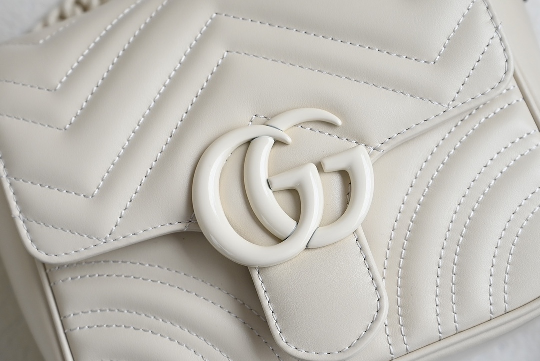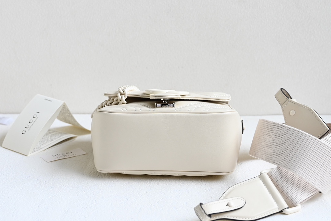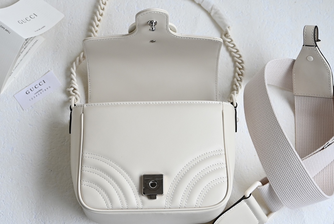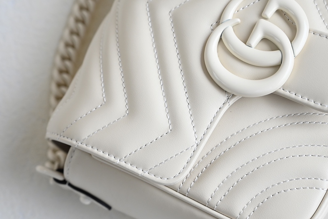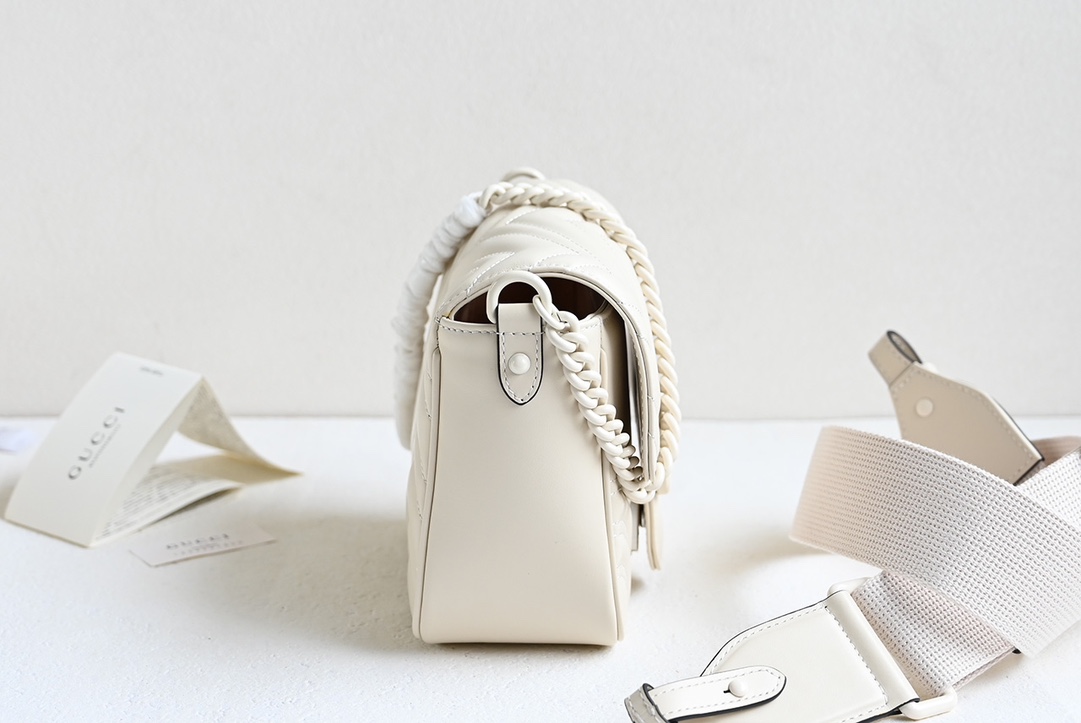 GG Marmont series quilted shoulder bag. This GG Marmont shoulder bag is made from highly recognizable quilted fabric, paired with double G hardware, vividly showcasing the brand's heritage and essence. The classic series' design is reinterpreted each season, highlighting Gucci's modern aesthetic philosophy. This structured mini shoulder bag is crafted from white leather, adorned with matching tone buckles and straps, combined with textured materials and geometric shapes, enhancing the item's overall appeal. White quilted V-shaped leather, white brass hardware with a ceramic-effect finish, cotton and linen lining, double G detail. This item comes with two straps: one chain strap (26 cm long), and one woven strap (36 cm long) with a magnetic snap closure. Weight: approximately 0.576 kg.