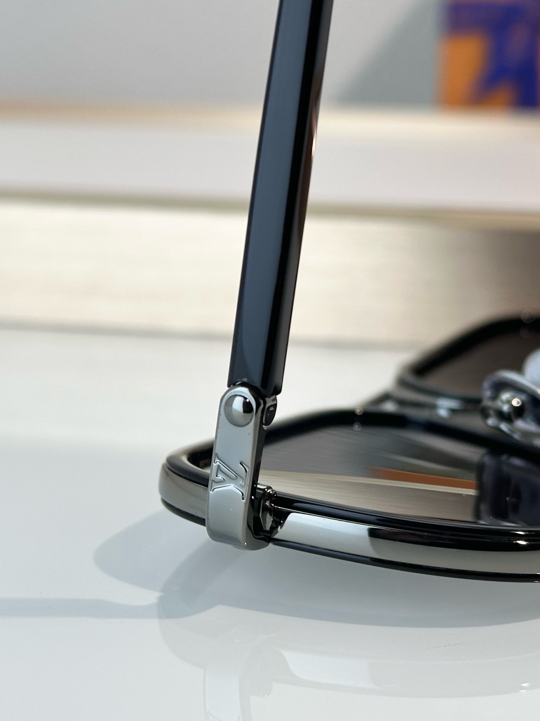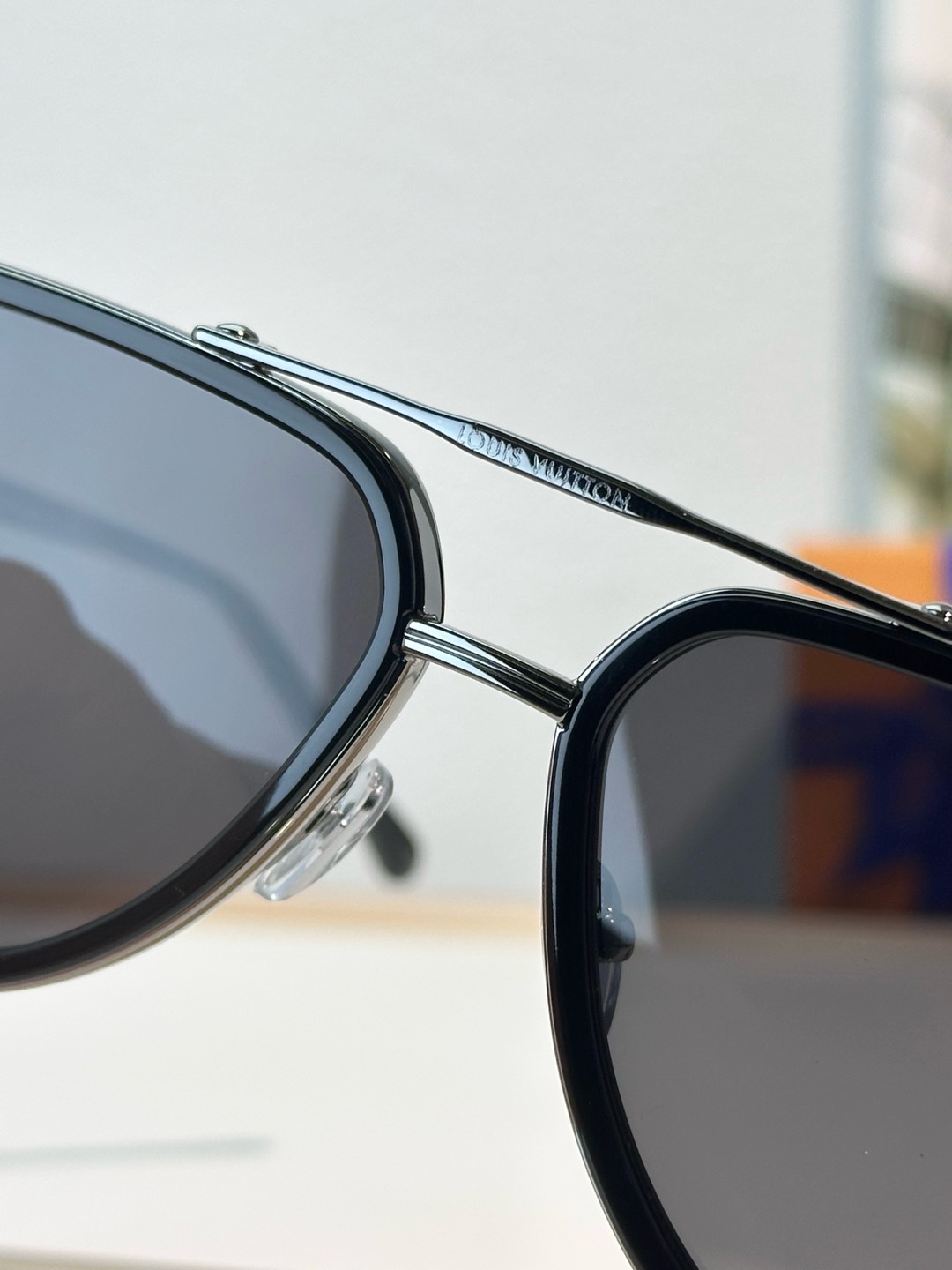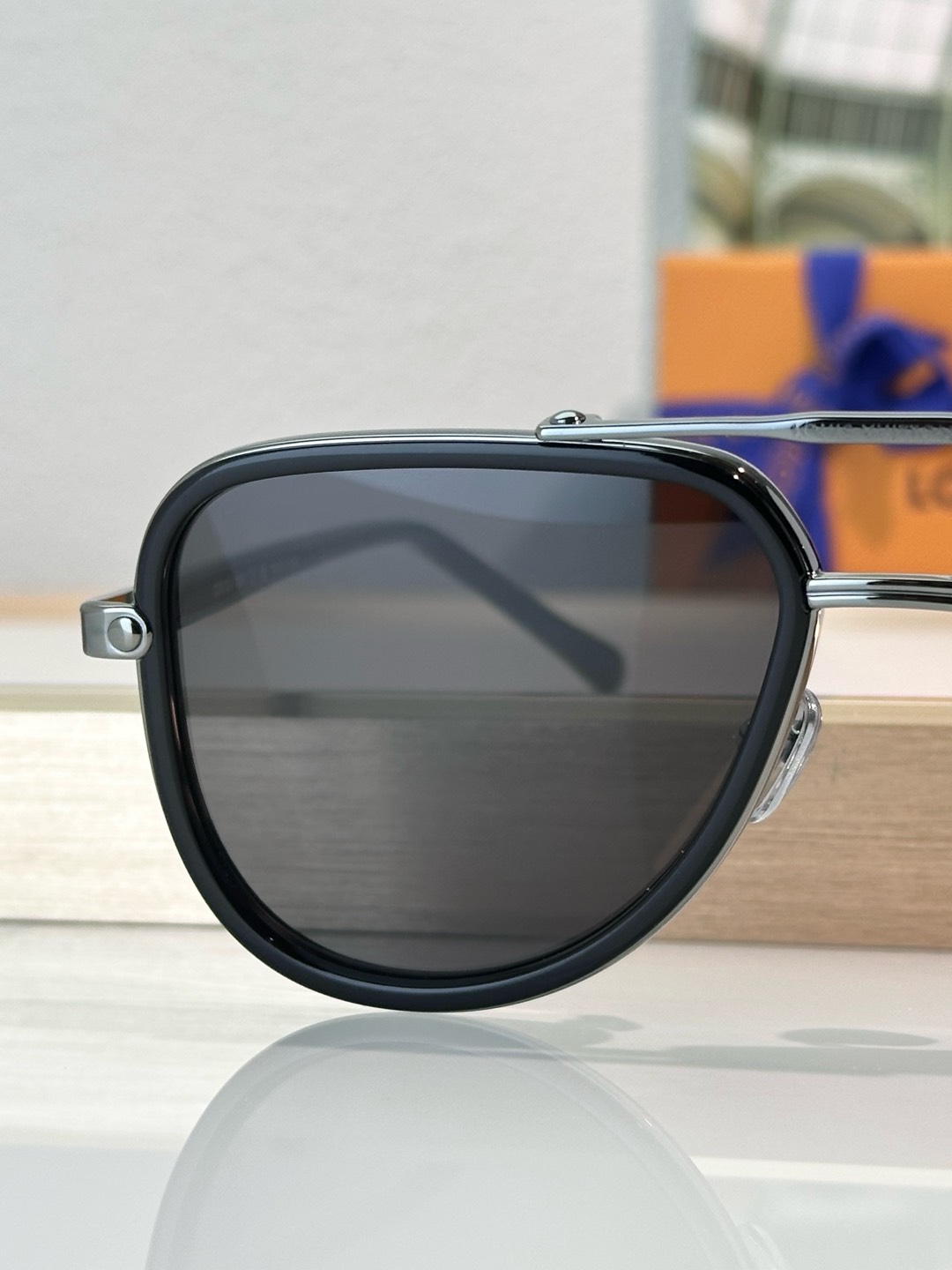 LV Signature Duo Frog-eye sunglasses~The silver finish on the acetate lenses and frames adds a modern touch to the classic silhouette, while the Louis Vuitton initials engraved on the hinges are a signature of the brand.