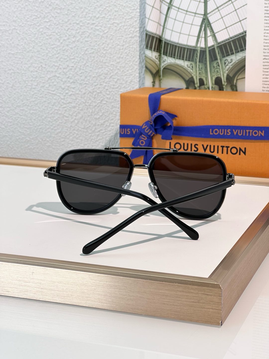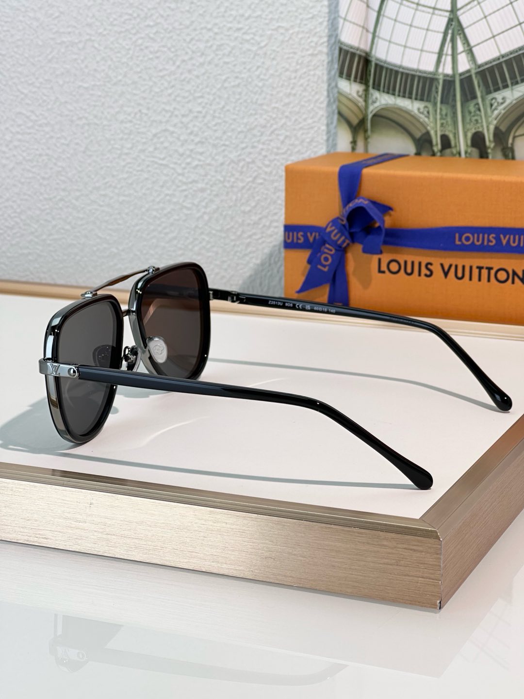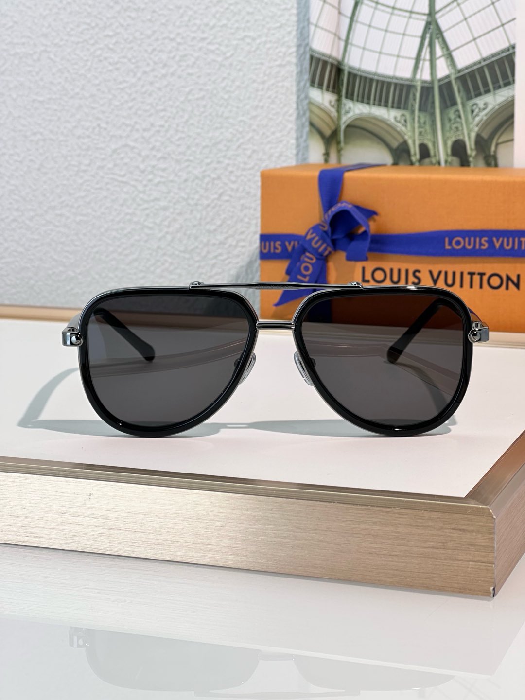 LV Signature Duo Frog-eye sunglasses~The silver finish on the acetate lenses and frames adds a modern touch to the classic silhouette, while the Louis Vuitton initials engraved on the hinges are a signature of the brand.