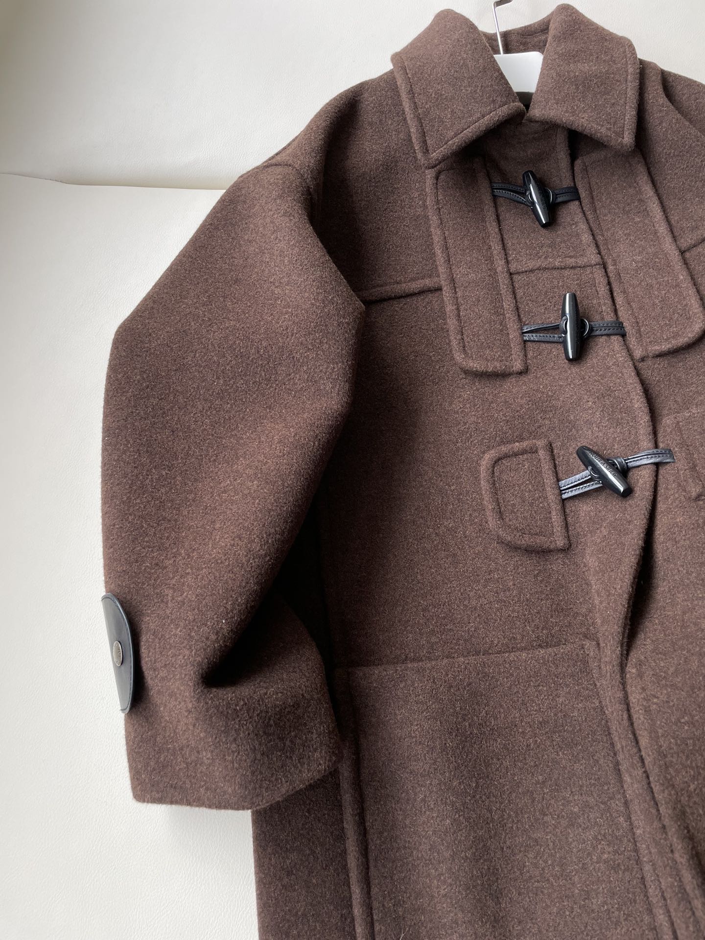 Pattern matching craftsmanship, dense texture with thickness for excellent warmth, dropped shoulders and slightly loose silhouette, genuine leather strap decoration