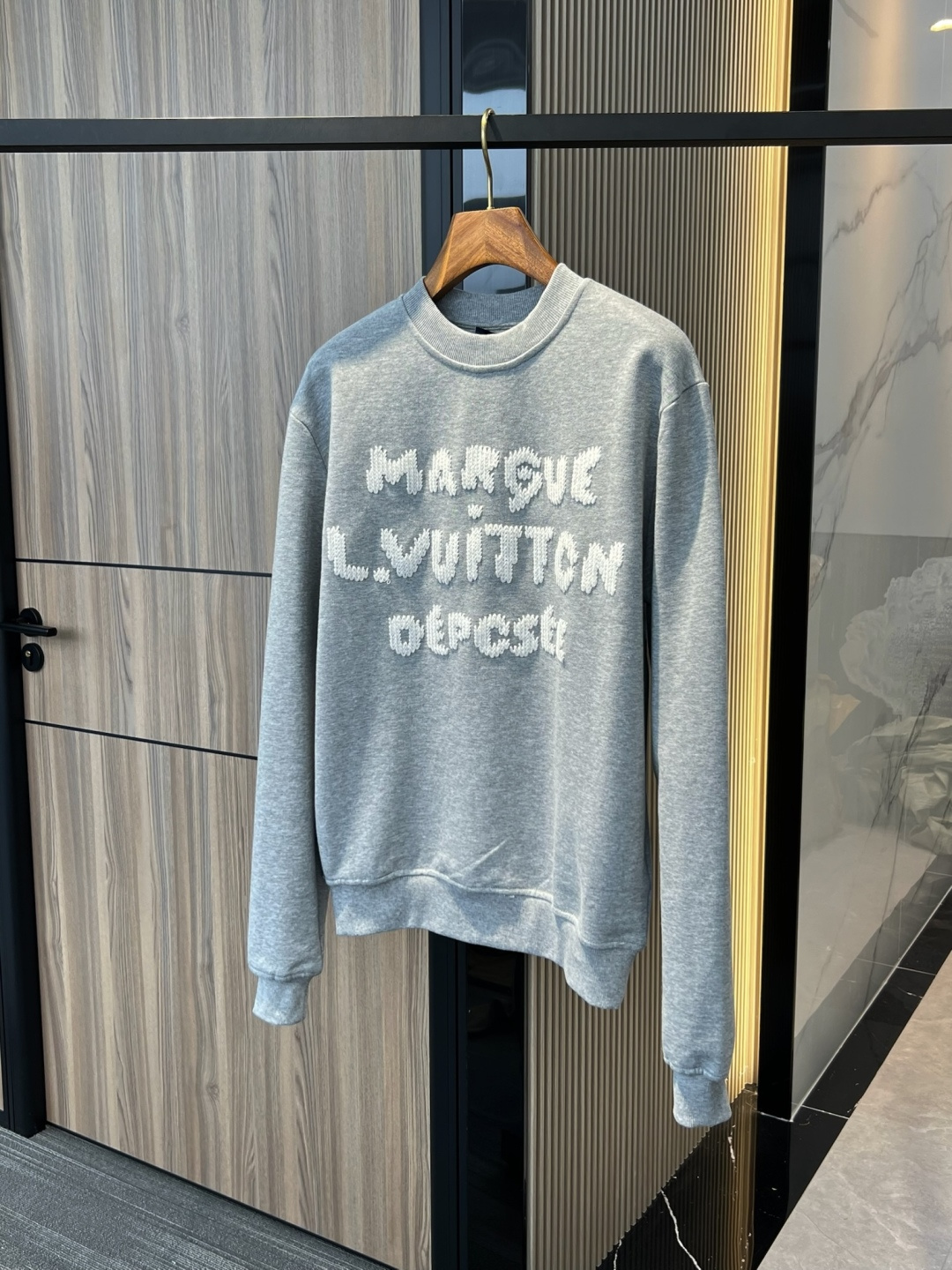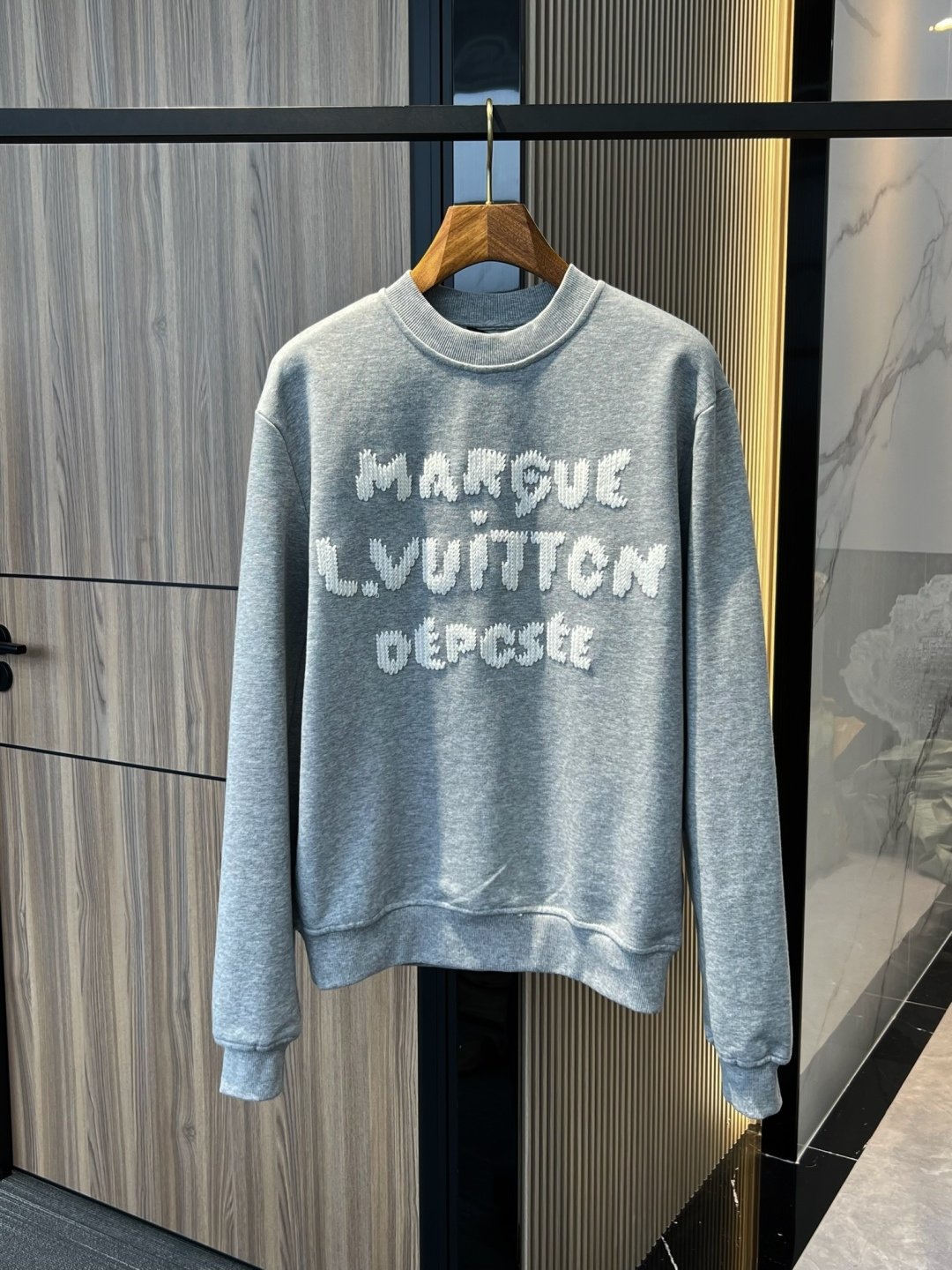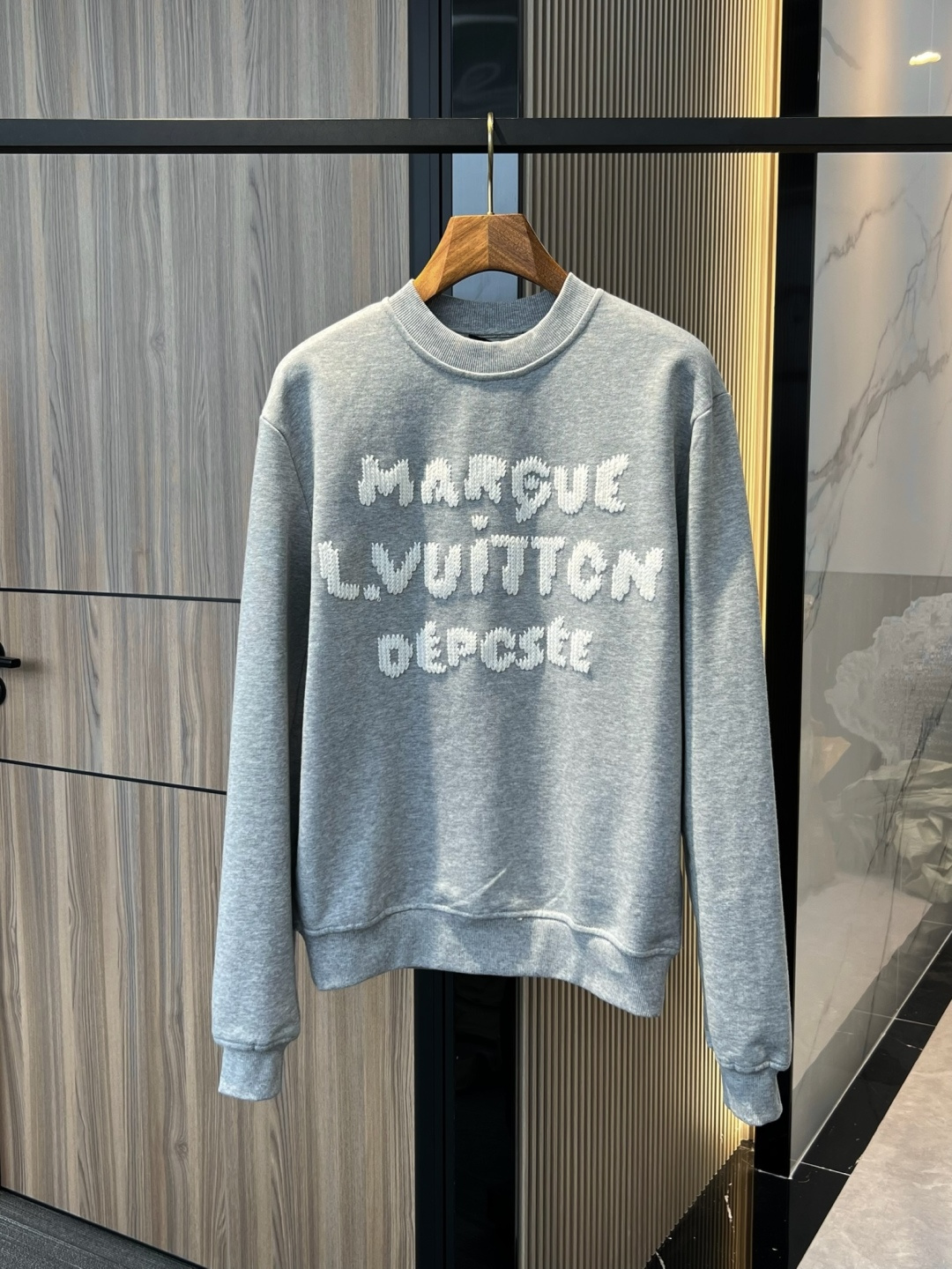 Latest Season . LV Embroidered Sweatshirt . Genuine 100% Authentic. This sweatshirt is made from soft cotton, injecting eye-catching style into the classic casual design. Thick-thread embroidery craftsmanship displays the Marque 1.Vuitton Déposée logo and lettering on the front and back respectively, cleverly creating a trompe l'oeil effect reminiscent of hand-knitting.