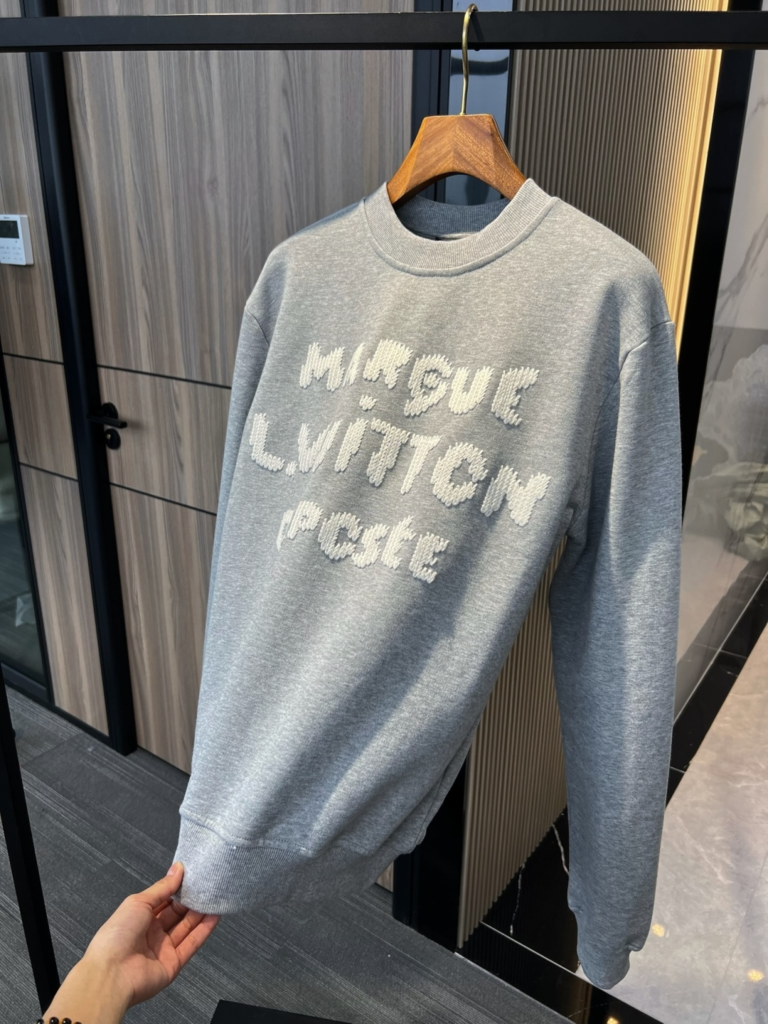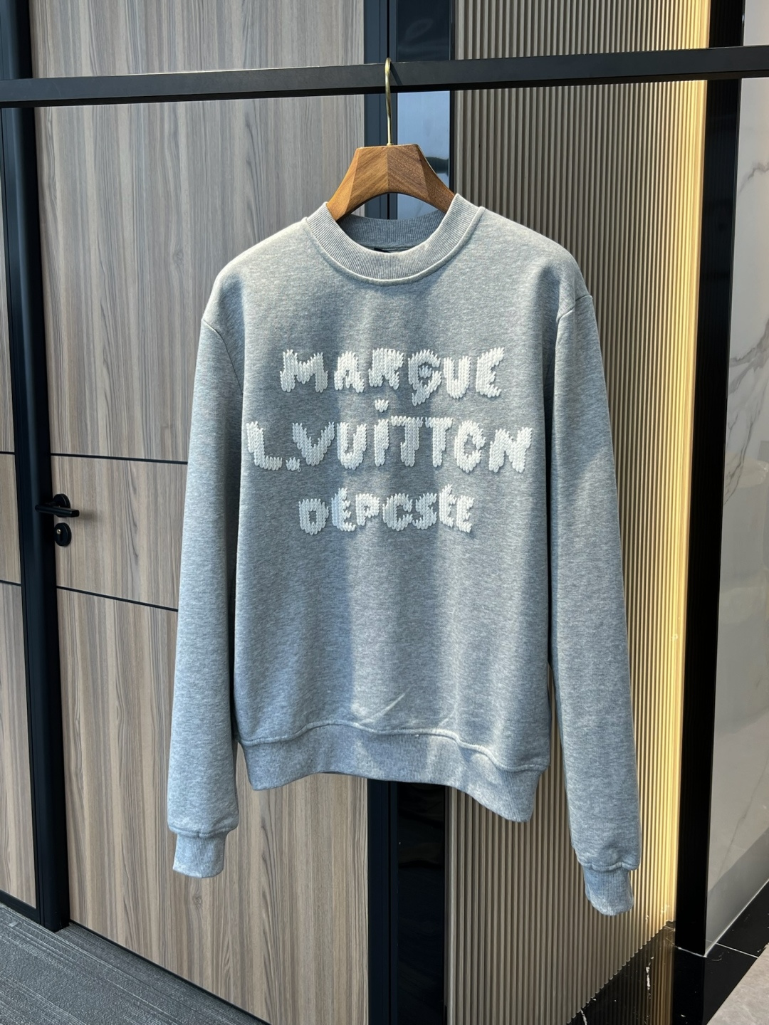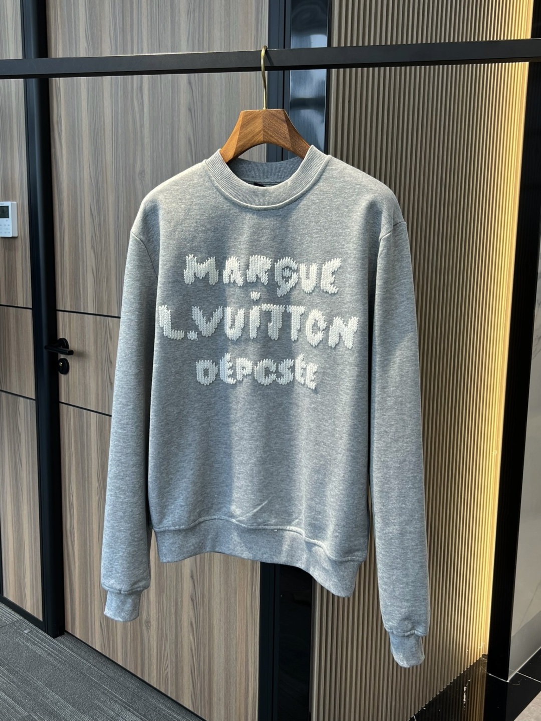 Latest Season . LV Embroidered Sweatshirt . Genuine 100% Authentic. This sweatshirt is made from soft cotton, injecting eye-catching style into the classic casual design. Thick-thread embroidery craftsmanship displays the Marque 1.Vuitton Déposée logo and lettering on the front and back respectively, cleverly creating a trompe l'oeil effect reminiscent of hand-knitting.